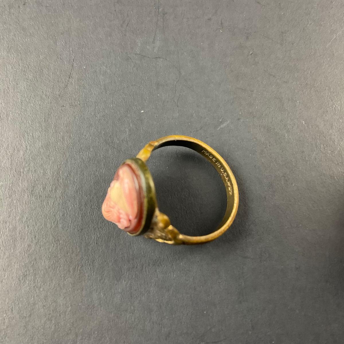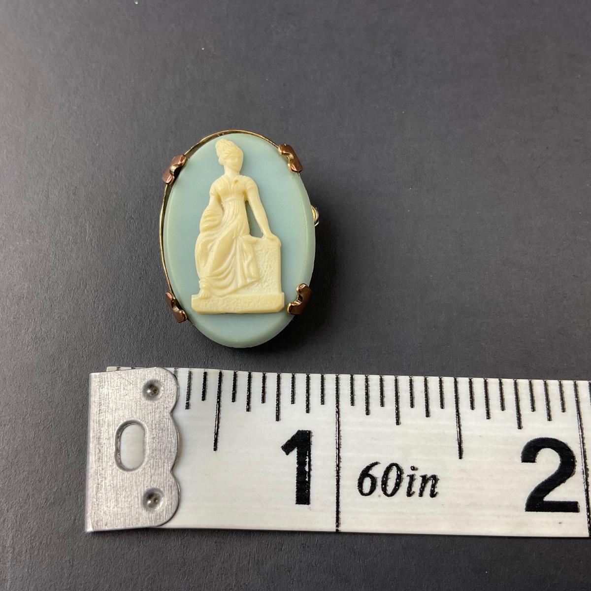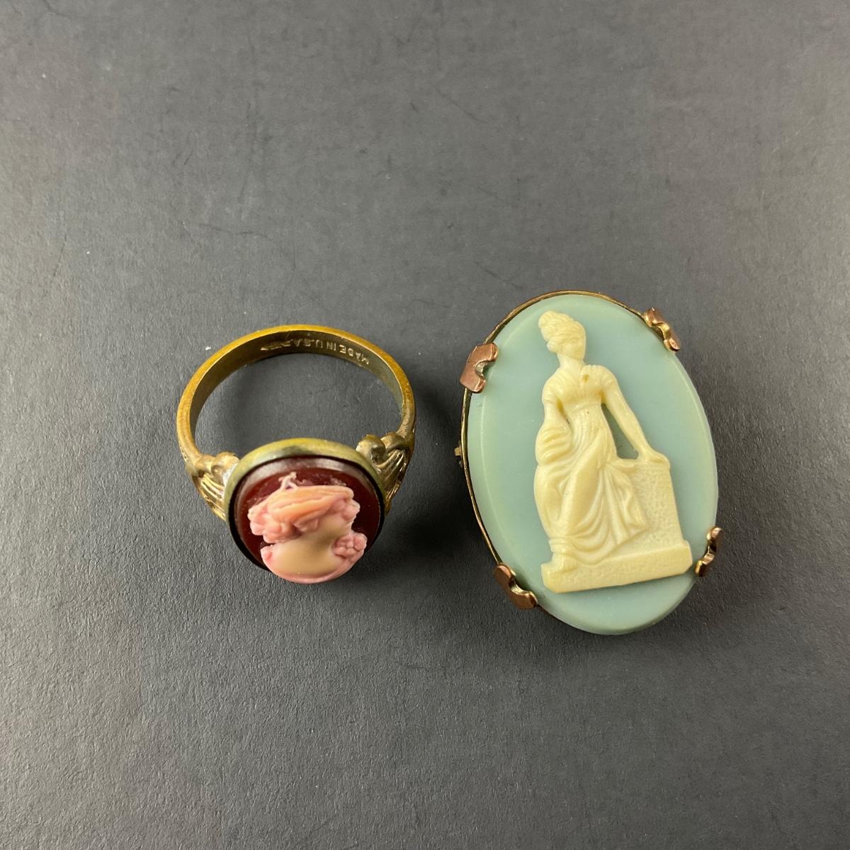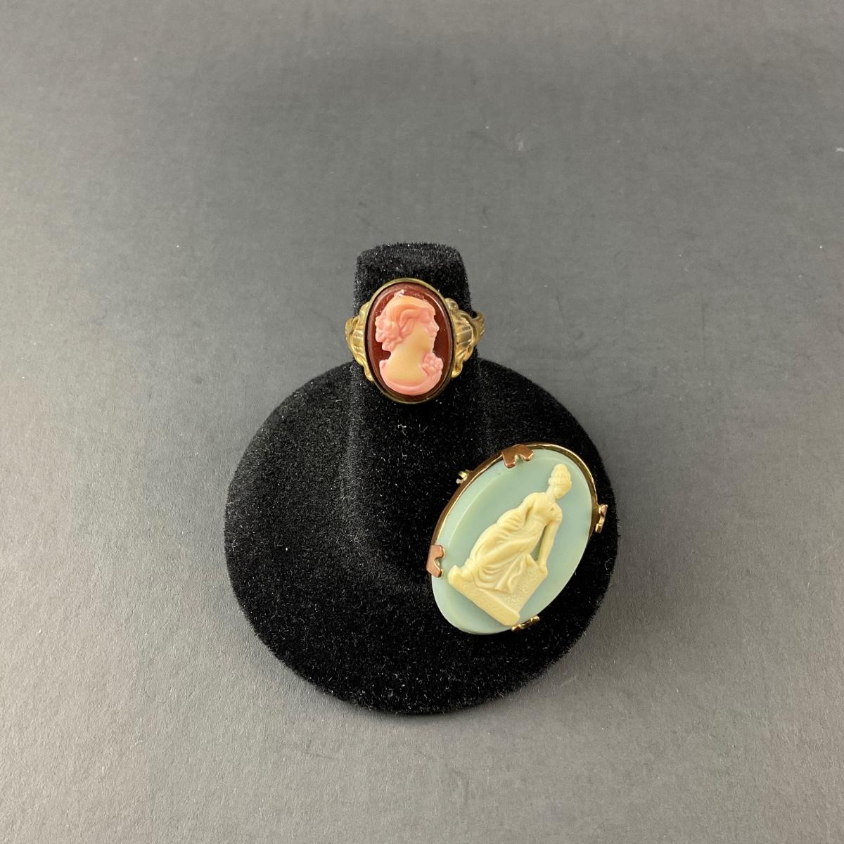 Two cameo pieces including one pink cameo ring size 3.5 and one light blue cameo pin marked made in the USA. This piece does have some scuffs, scratches, marks, or slight damage, but otherwise appears to be in great shape. Please see photos for details and condition. Any condition statement is given as a courtesy to a client, is an opinion, and should not be treated as a statement of fact. Reference to condition written, oral or within a condition report shall not be regarded as a full account of condition and may not include all defects, alterations, or restorations. Absence of a condition report does not imply a lot is flawless or lacking imperfections or damage. Katherine’s Auction & Appraisal Service shall have no responsibility for any error or omission. Returns shall not be accepted on the basis of condition. ::: Shipping is available on this lot. If you require shipping you must let us know at the close of the auction. We will coordinate with you after the item has been won. Shipping fees will include insurance up to or exceeding the value of all items being mailed. If you have any questions regarding this lot please contact the auctioneer either via this website, by direct email or by phone. PICK UP TIMES and other important information can be found in the TERMS and DESCRIPTION of the auction. Please take a look for pertinent information. Thanks!