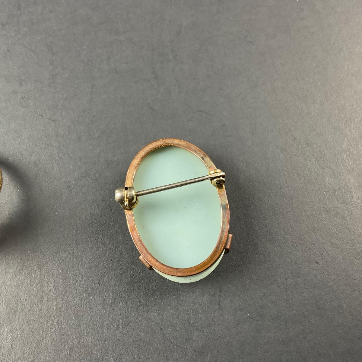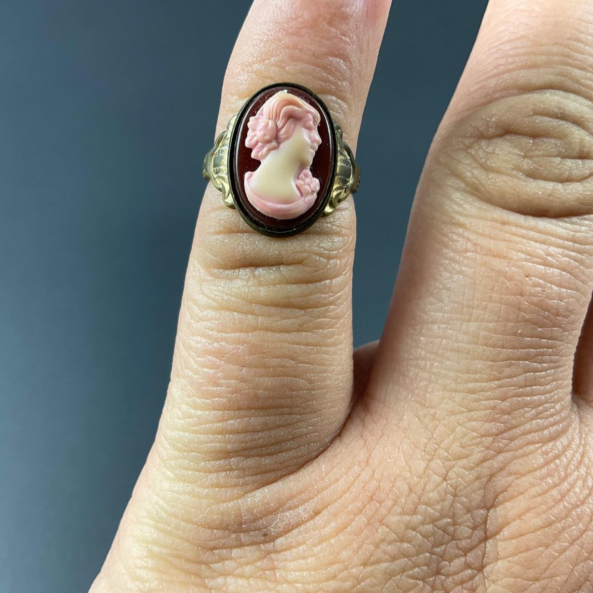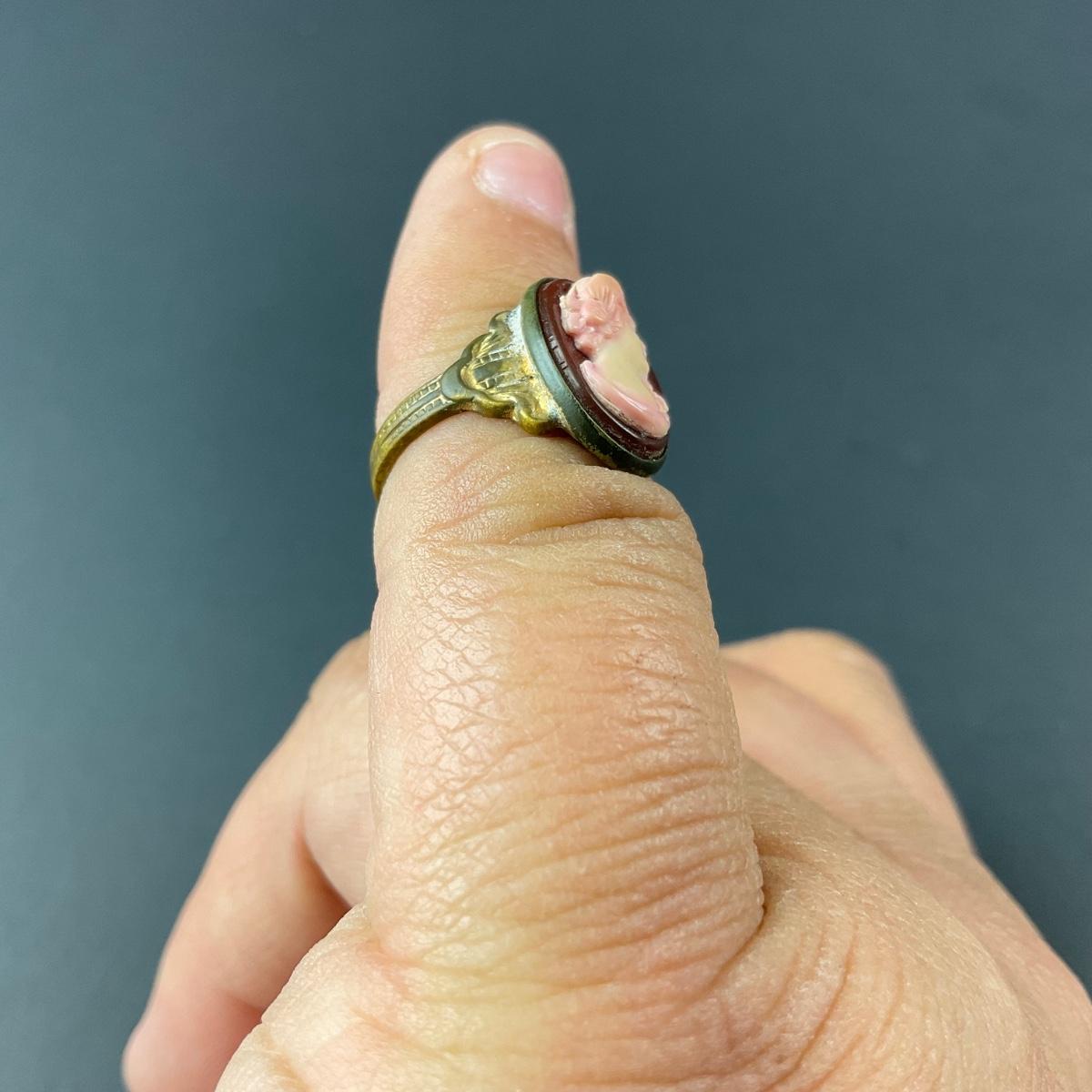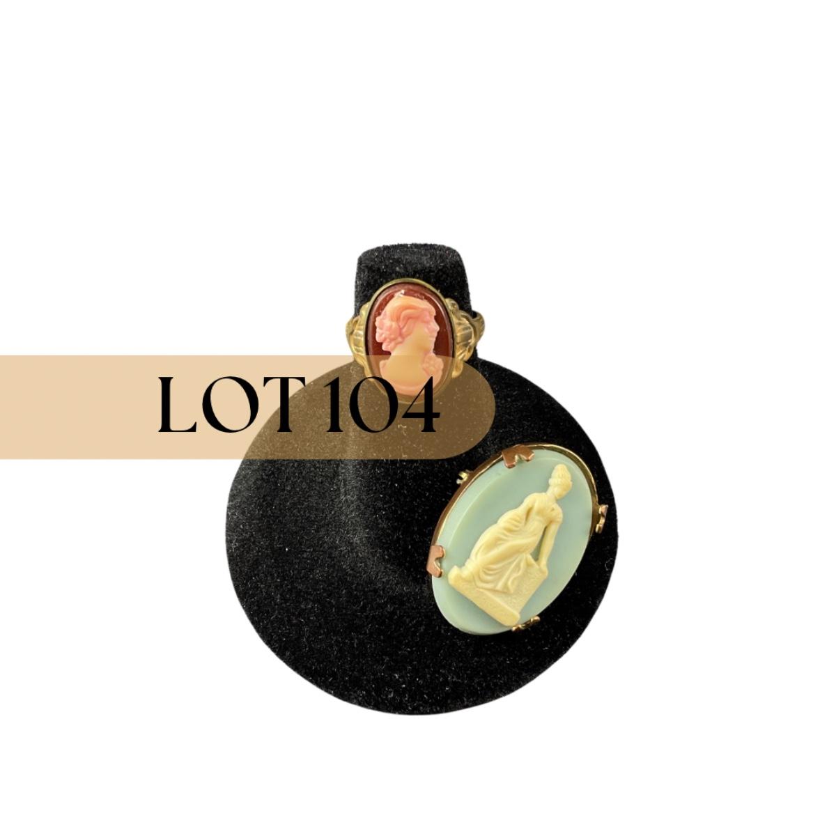 Two cameo pieces including one pink cameo ring size 3.5 and one light blue cameo pin marked made in the USA. This piece does have some scuffs, scratches, marks, or slight damage, but otherwise appears to be in great shape. Please see photos for details and condition. Any condition statement is given as a courtesy to a client, is an opinion, and should not be treated as a statement of fact. Reference to condition written, oral or within a condition report shall not be regarded as a full account of condition and may not include all defects, alterations, or restorations. Absence of a condition report does not imply a lot is flawless or lacking imperfections or damage. Katherine’s Auction & Appraisal Service shall have no responsibility for any error or omission. Returns shall not be accepted on the basis of condition. ::: Shipping is available on this lot. If you require shipping you must let us know at the close of the auction. We will coordinate with you after the item has been won. Shipping fees will include insurance up to or exceeding the value of all items being mailed. If you have any questions regarding this lot please contact the auctioneer either via this website, by direct email or by phone. PICK UP TIMES and other important information can be found in the TERMS and DESCRIPTION of the auction. Please take a look for pertinent information. Thanks!