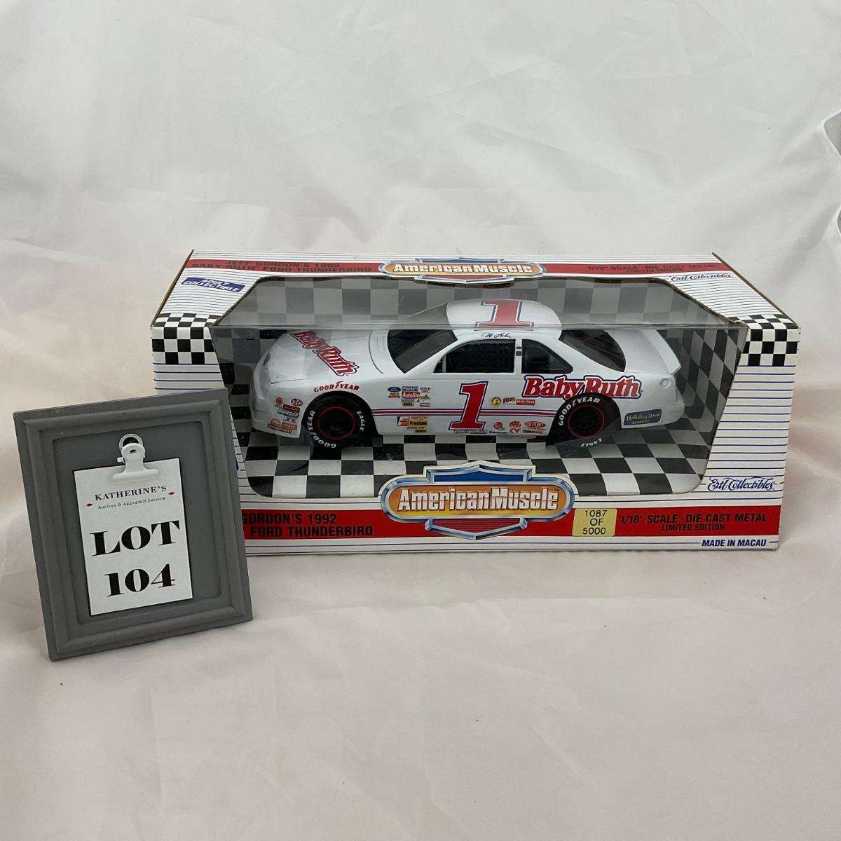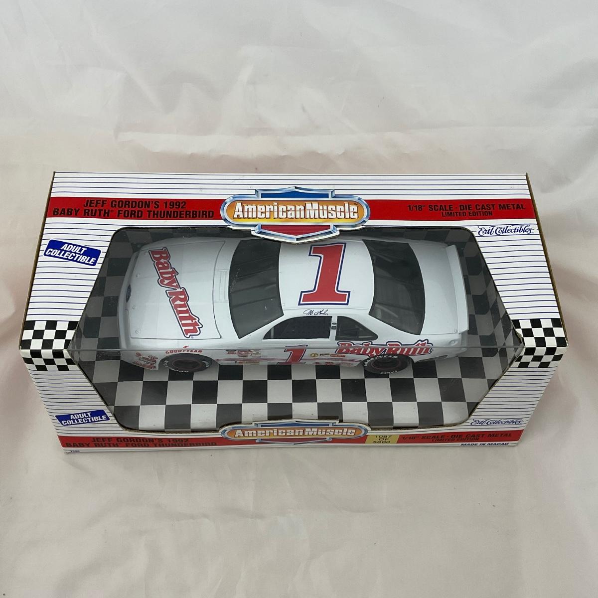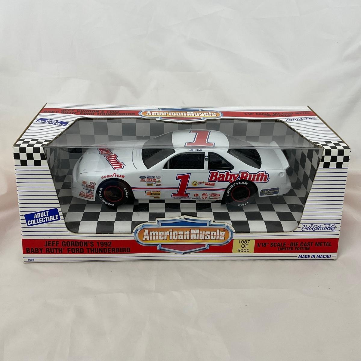 One NASCAR die cast 1:18 scale 1992 Baby Ruth Ford Thunderbird in box. Driver Jeff Gordon. Please see photos for details and condition. ::: Shipping is available on this lot. If you require shipping you must let us know at the close of the auction. We will coordinate with you after the item has been won. Shipping fees will include insurance up to or exceeding the value of all items being mailed. If you have any questions regarding this lot please contact the auctioneer either via this website, by direct email or by phone. PICK UP TIMES and other important information can be found in the TERMS and DESCRIPTION of the auction. Please take a look for pertinent information. Thanks!