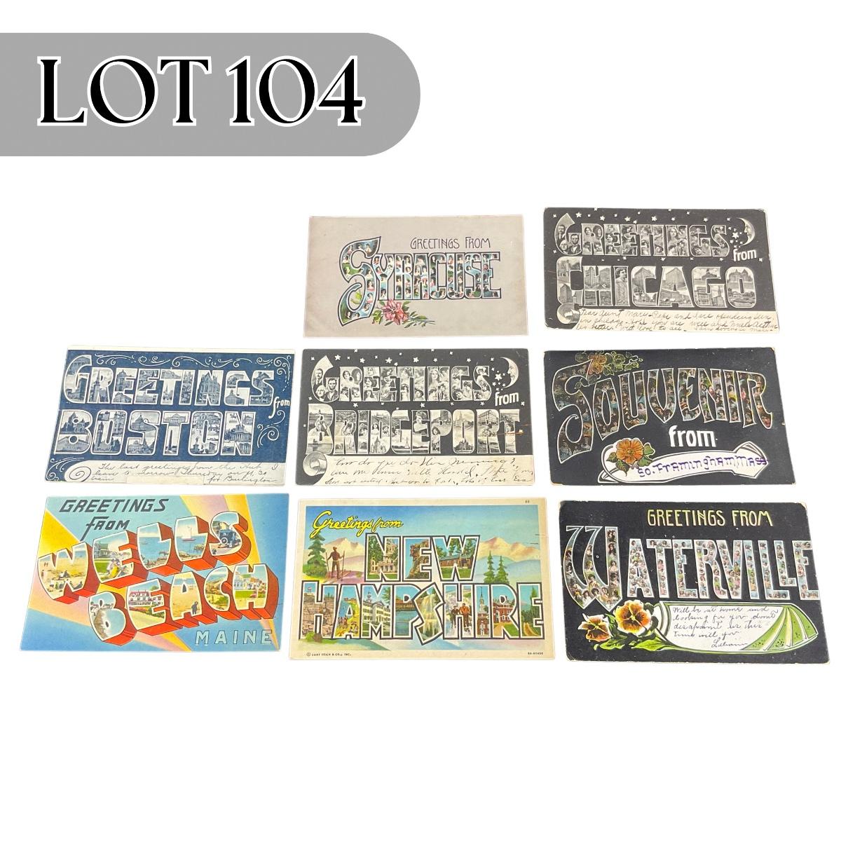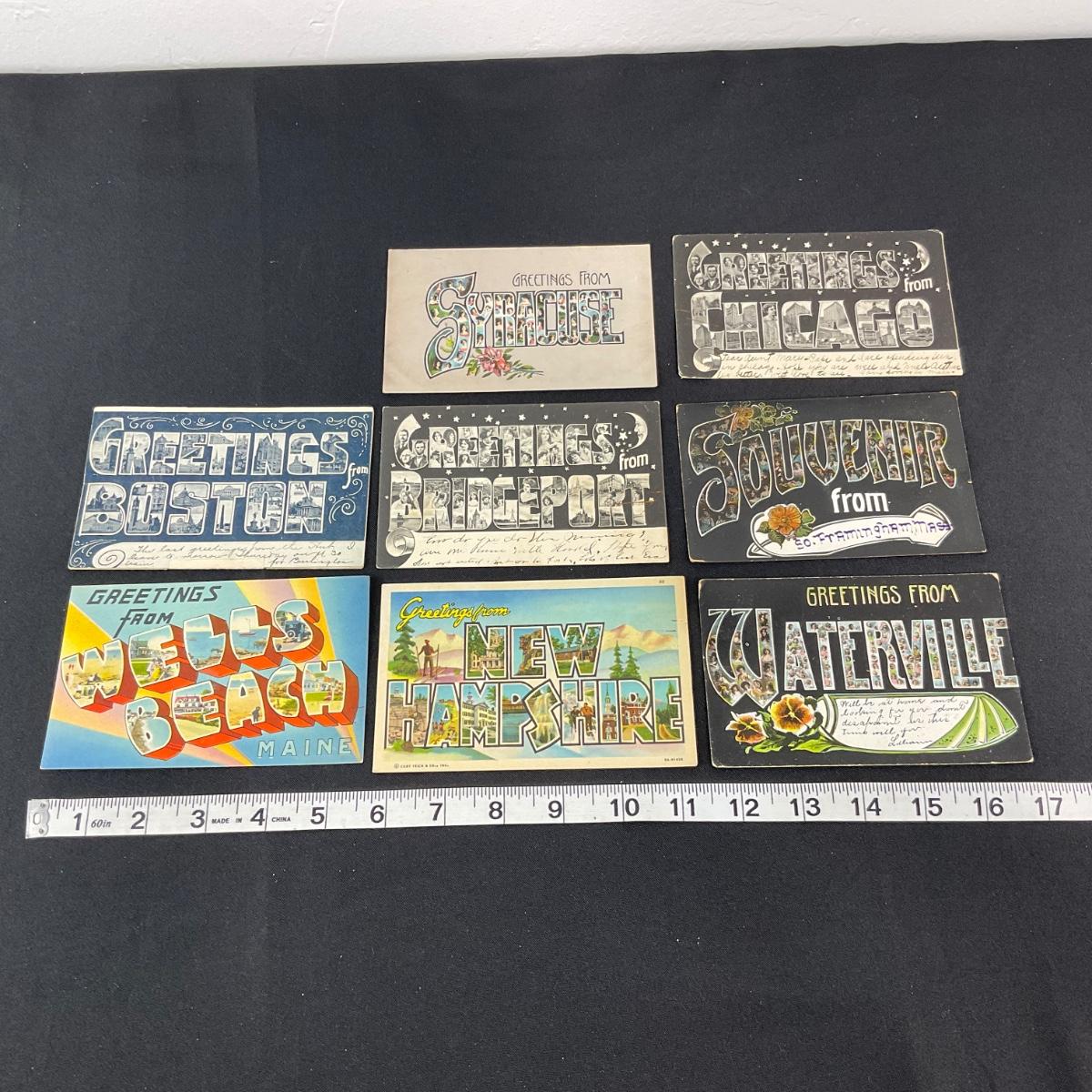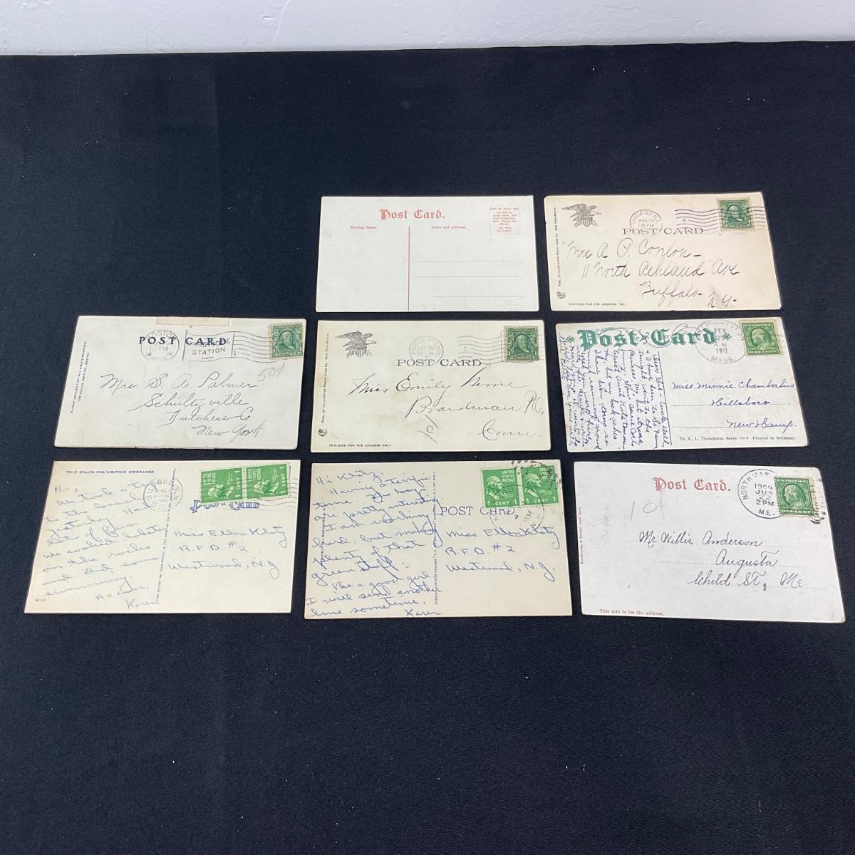 Eight vintage assortment of greets from postcards. Please see photos for details and condition. Any condition statement is given as a courtesy to a client, is an opinion, and should not be treated as a statement of fact. Reference to condition written, oral or within a condition report shall not be regarded as a full account of condition and may not include all defects, alterations, or restorations. Absence of a condition report does not imply a lot is flawless or lacking imperfections or damage. Katherine’s Auction & Appraisal Service shall have no responsibility for any error or omission. Returns shall not be accepted on the basis of condition. ::: Shipping is available on this lot. If you require shipping you must let us know at the close of the auction. We will coordinate with you after the item has been won. Shipping fees will include insurance up to or exceeding the value of all items being mailed. If you have any questions regarding this lot please contact the auctioneer either via this website, by direct email or by phone. PICK UP TIMES and other important information can be found in the TERMS and DESCRIPTION of the auction. Please take a look for pertinent information. Thanks!