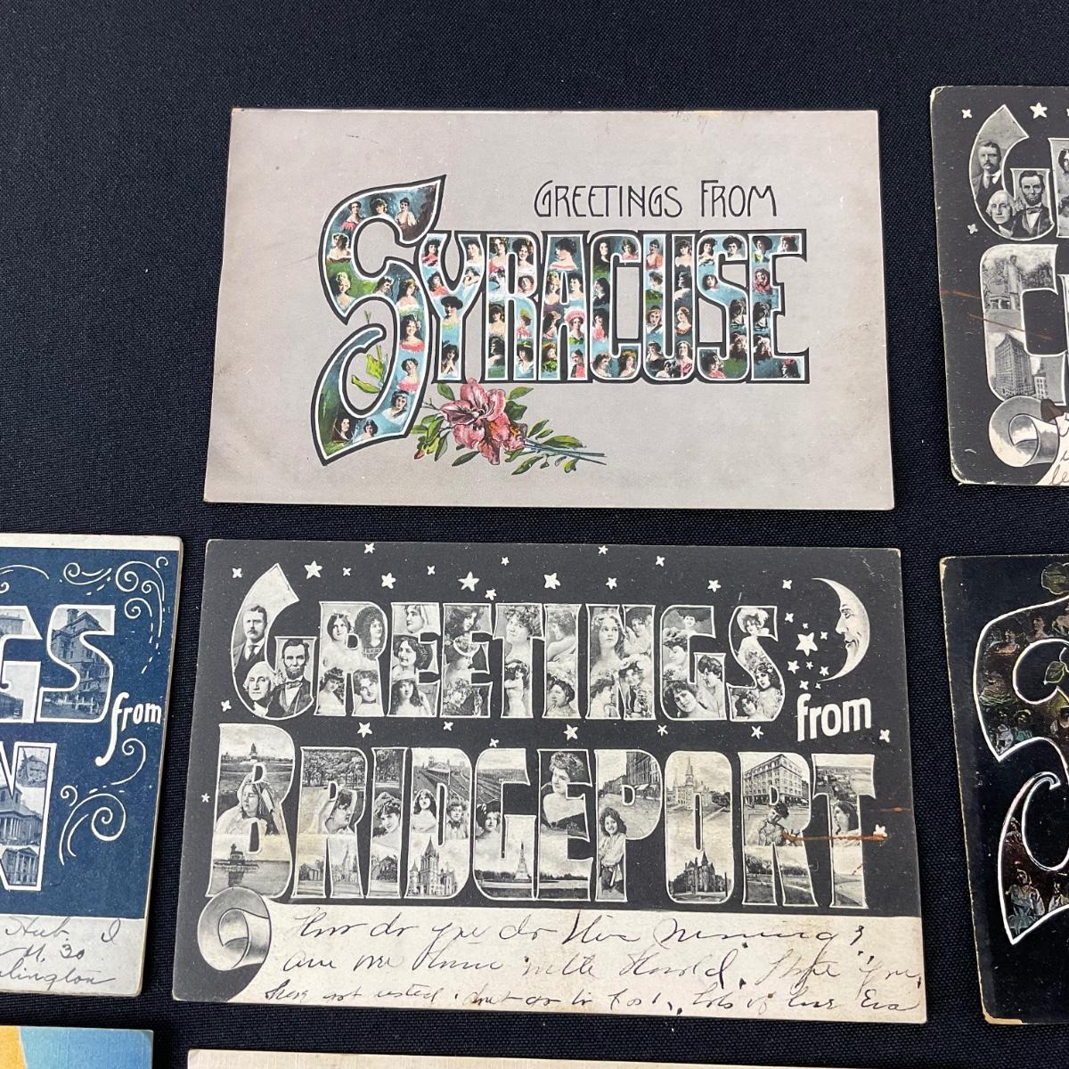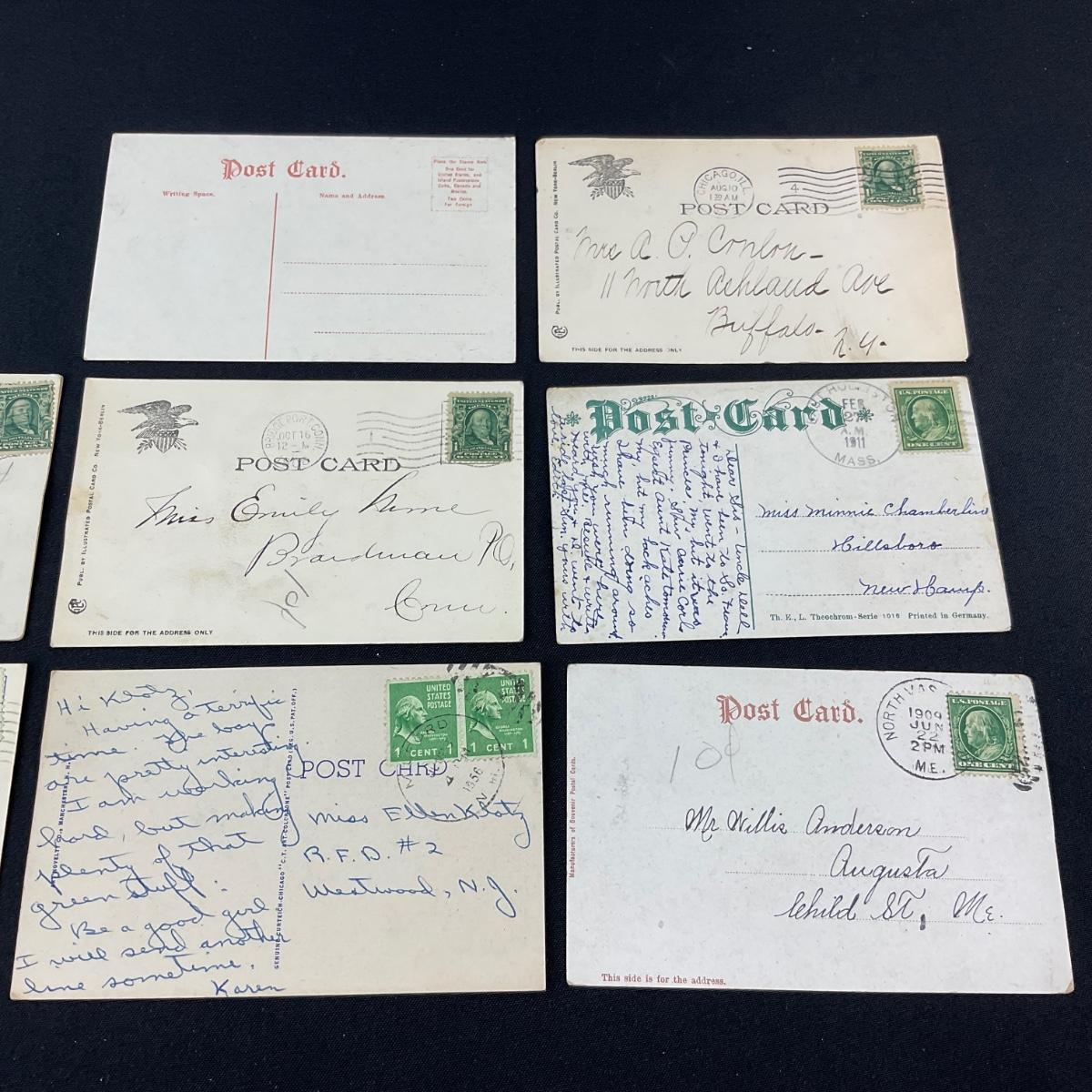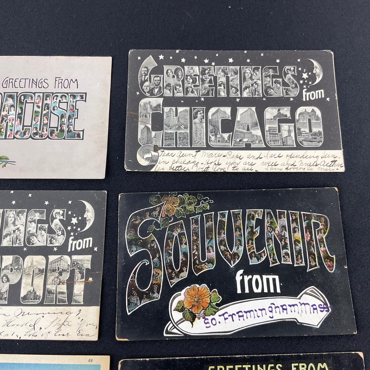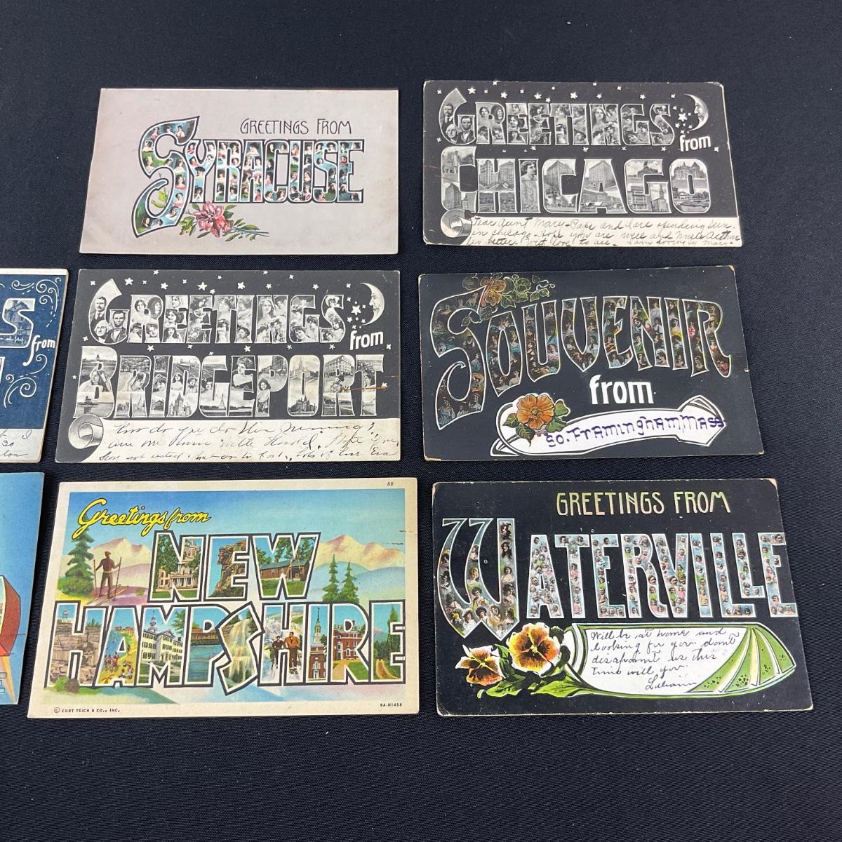 Eight vintage assortment of greets from postcards. Please see photos for details and condition. Any condition statement is given as a courtesy to a client, is an opinion, and should not be treated as a statement of fact. Reference to condition written, oral or within a condition report shall not be regarded as a full account of condition and may not include all defects, alterations, or restorations. Absence of a condition report does not imply a lot is flawless or lacking imperfections or damage. Katherine’s Auction & Appraisal Service shall have no responsibility for any error or omission. Returns shall not be accepted on the basis of condition. ::: Shipping is available on this lot. If you require shipping you must let us know at the close of the auction. We will coordinate with you after the item has been won. Shipping fees will include insurance up to or exceeding the value of all items being mailed. If you have any questions regarding this lot please contact the auctioneer either via this website, by direct email or by phone. PICK UP TIMES and other important information can be found in the TERMS and DESCRIPTION of the auction. Please take a look for pertinent information. Thanks!
