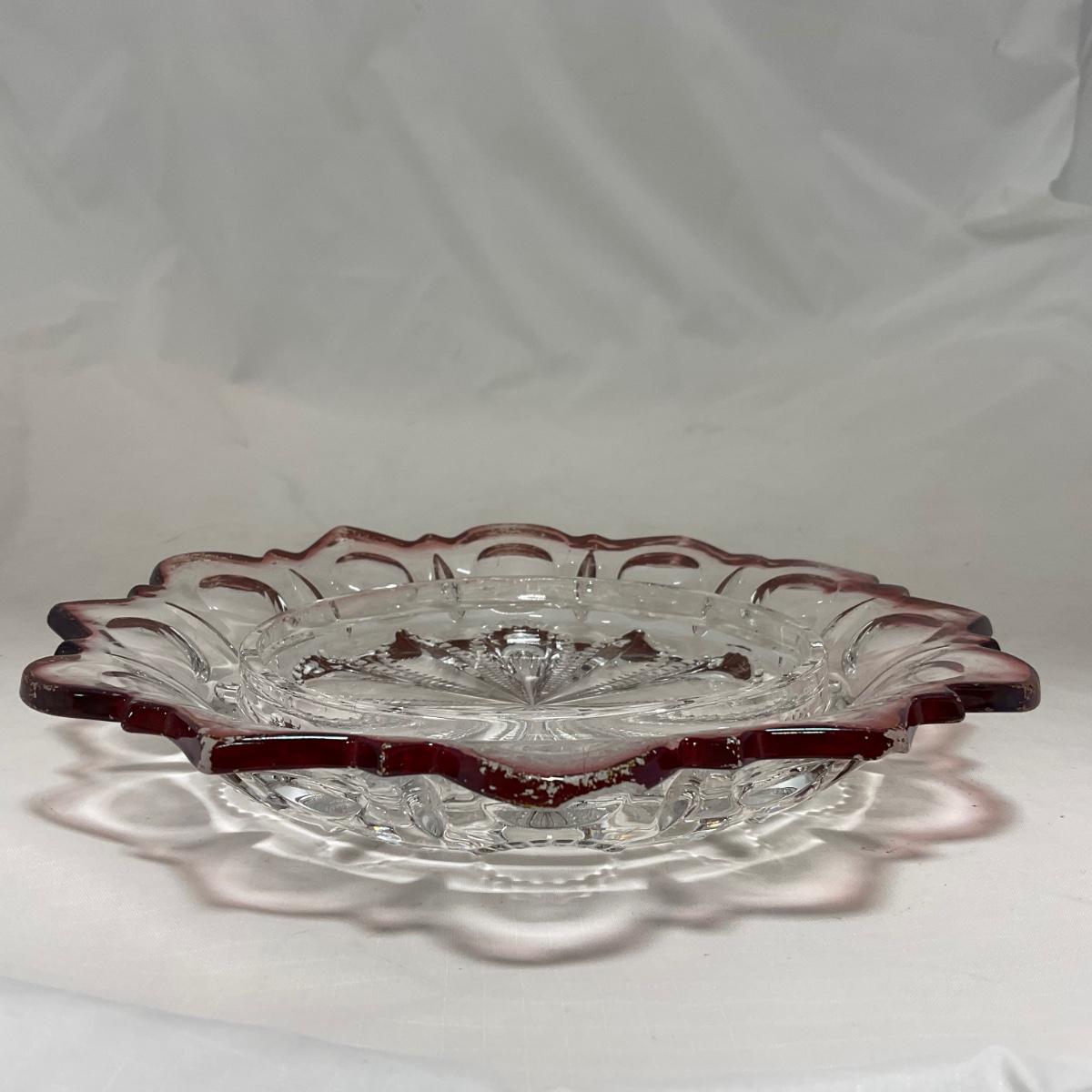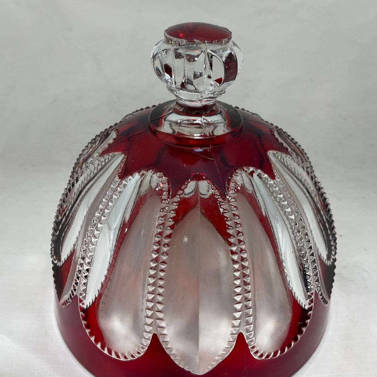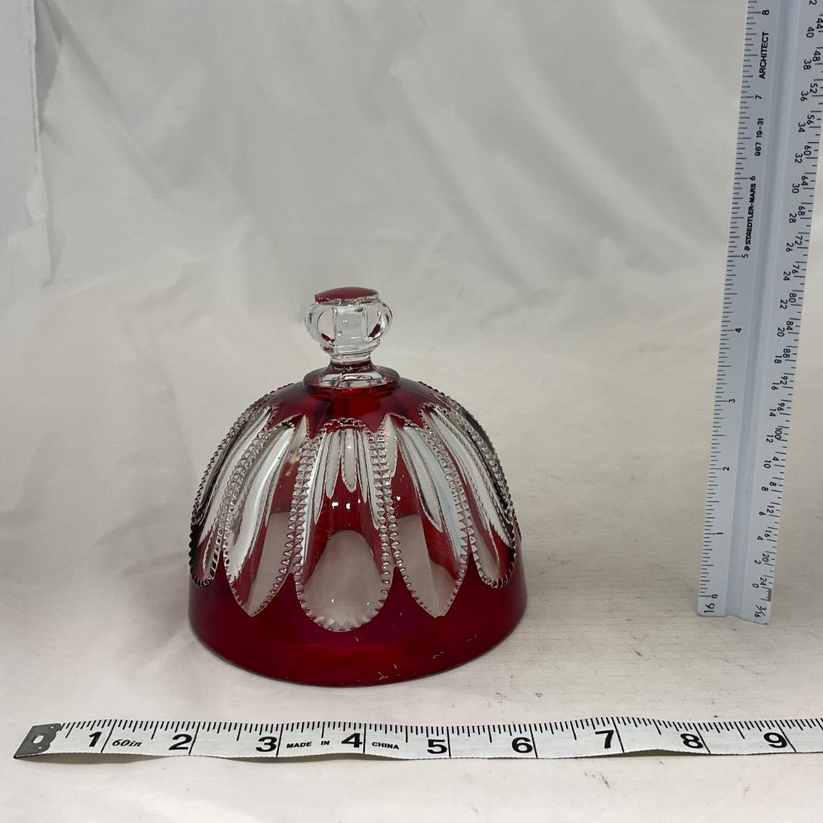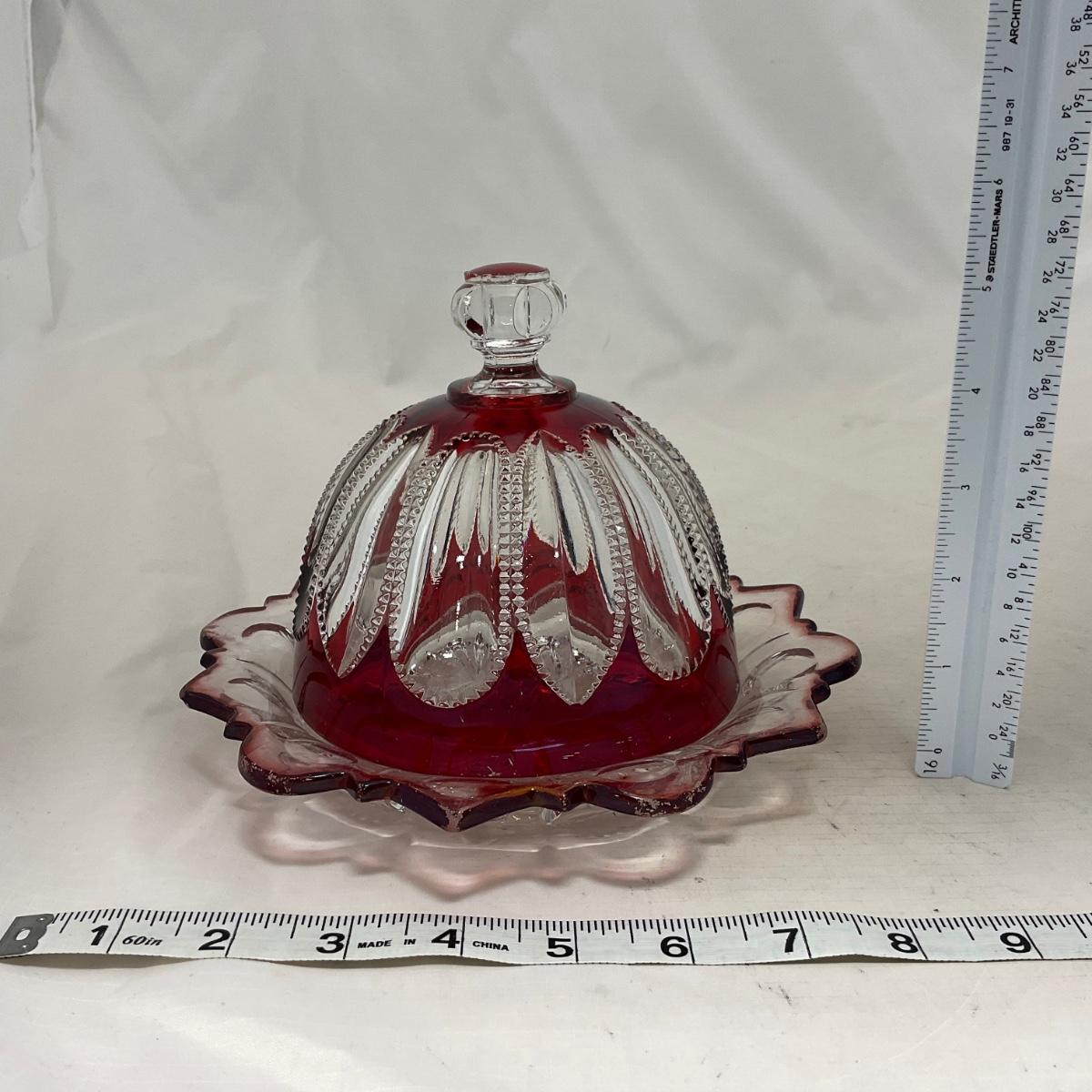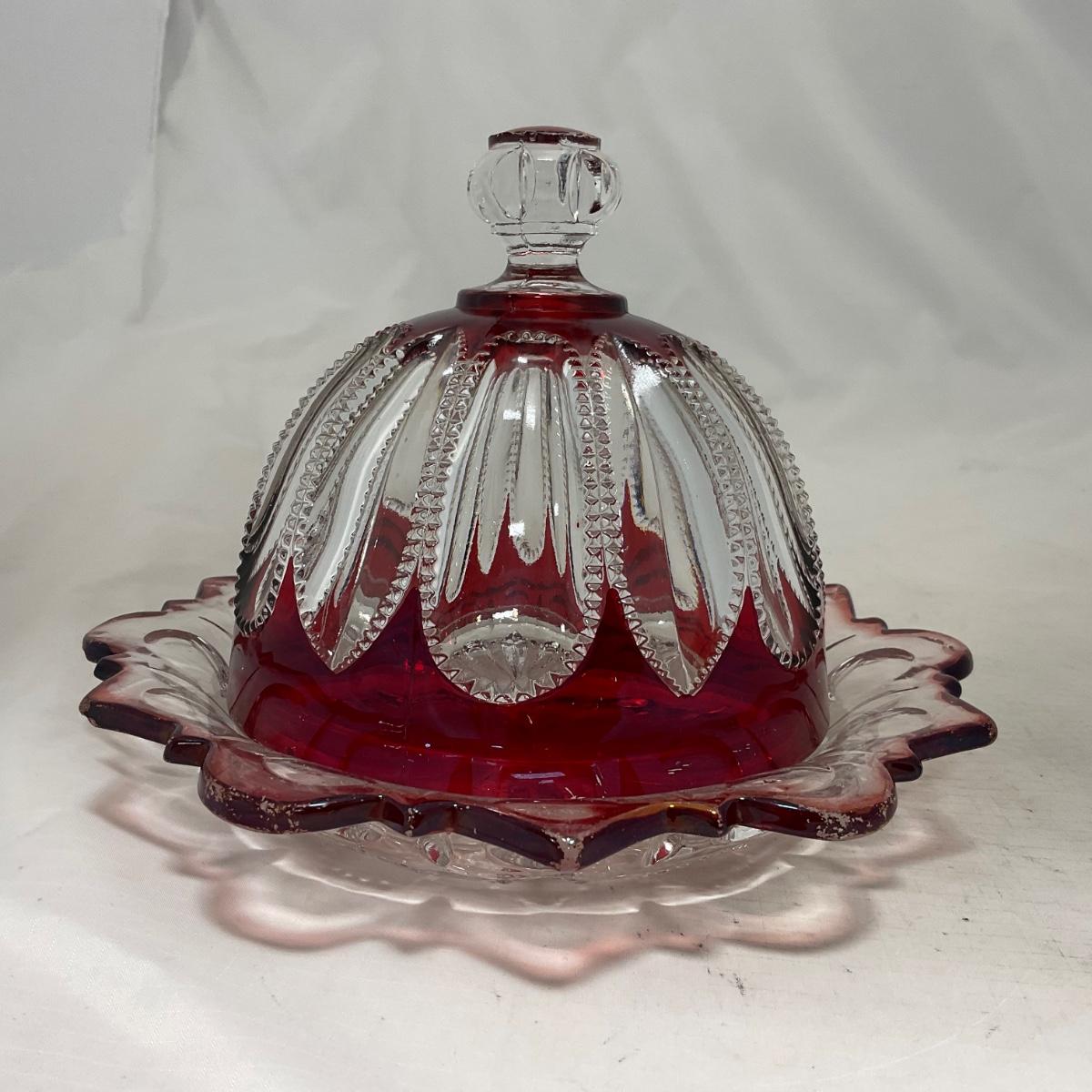 A classic ruby red and clear glass covered butter dish, with beautiful clear glass window to pear though your lid to the bottom dish. This piece is well loved so does have some wear on the ruby red coloring. Please see photos for details and condition. ::: Shipping is available on this lot. If you require shipping you must let us know at the close of the auction. We will coordinate with you after the item has been won. Shipping fees will include insurance up to or exceeding the value of all items being mailed. If you have any questions regarding this lot please contact the auctioneer either via this website, by direct email or by phone. PICK UP TIMES and other important information can be found in the TERMS and DESCRIPTION of the auction. Please take a look for pertinent information. Thanks!