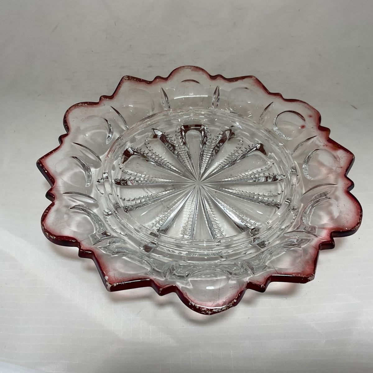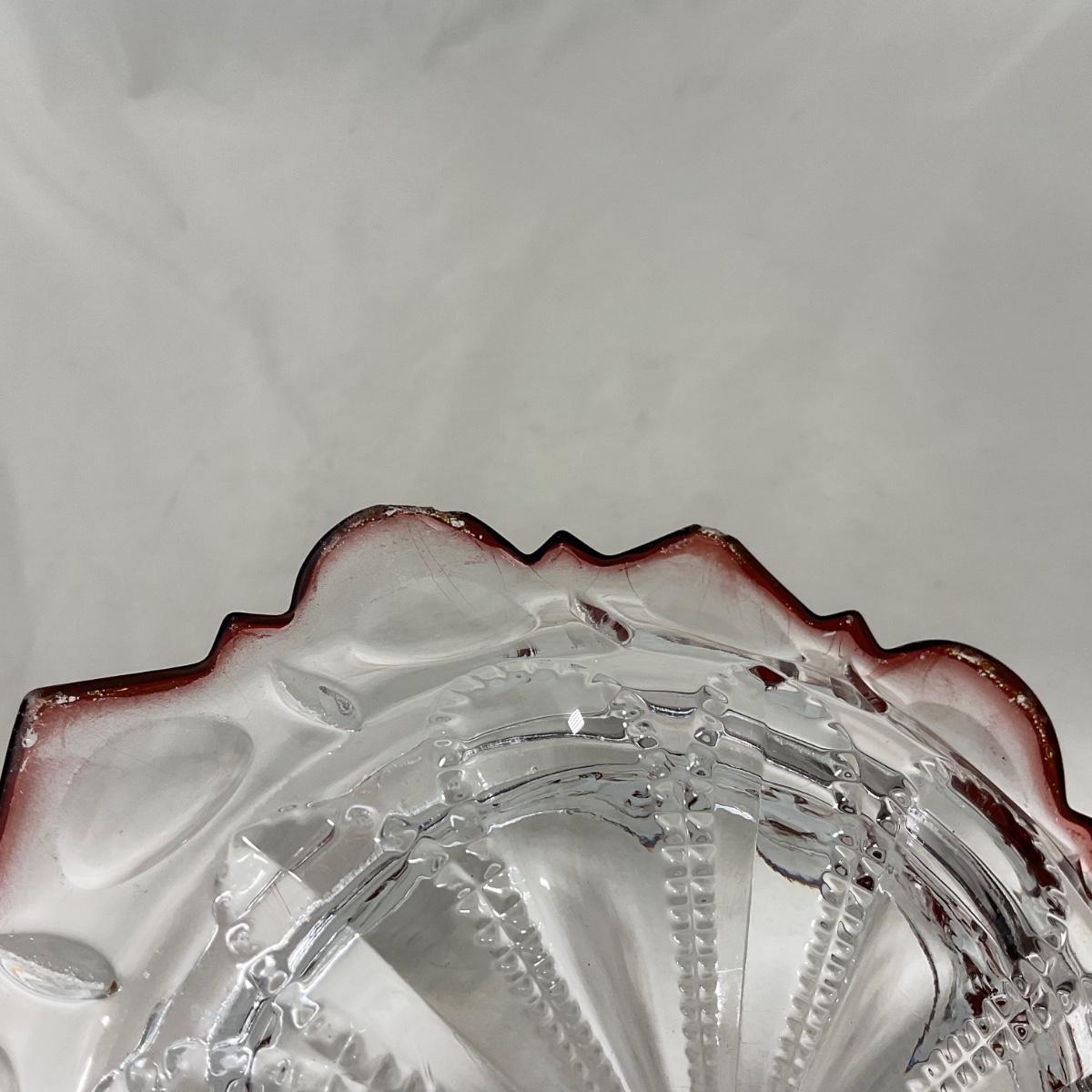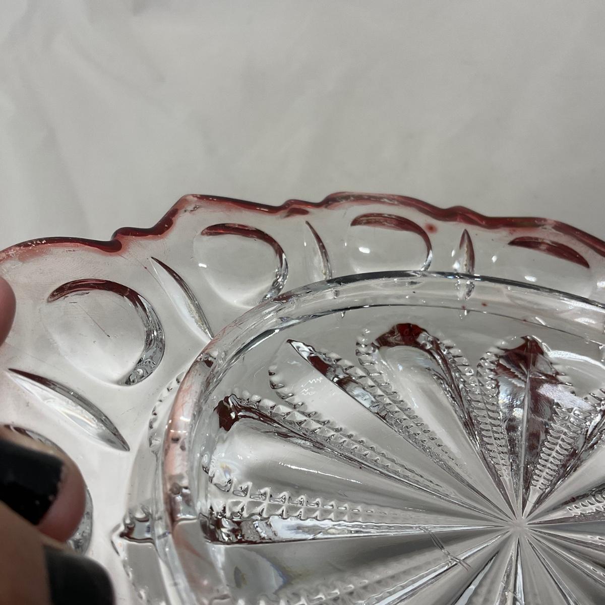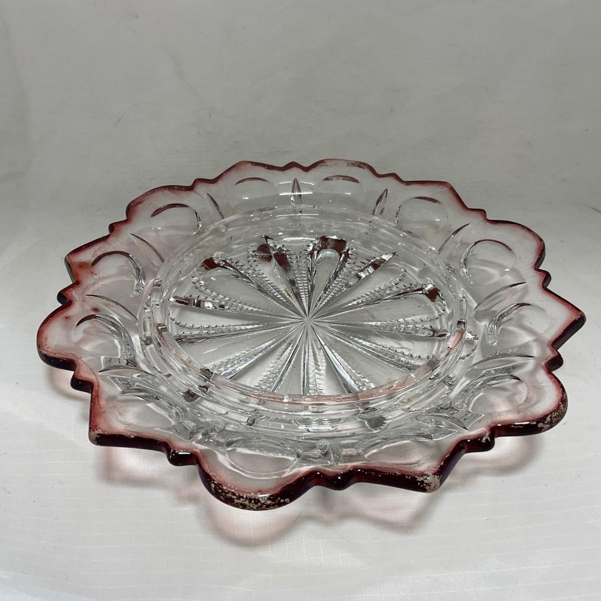 A classic ruby red and clear glass covered butter dish, with beautiful clear glass window to pear though your lid to the bottom dish. This piece is well loved so does have some wear on the ruby red coloring. Please see photos for details and condition. ::: Shipping is available on this lot. If you require shipping you must let us know at the close of the auction. We will coordinate with you after the item has been won. Shipping fees will include insurance up to or exceeding the value of all items being mailed. If you have any questions regarding this lot please contact the auctioneer either via this website, by direct email or by phone. PICK UP TIMES and other important information can be found in the TERMS and DESCRIPTION of the auction. Please take a look for pertinent information. Thanks!