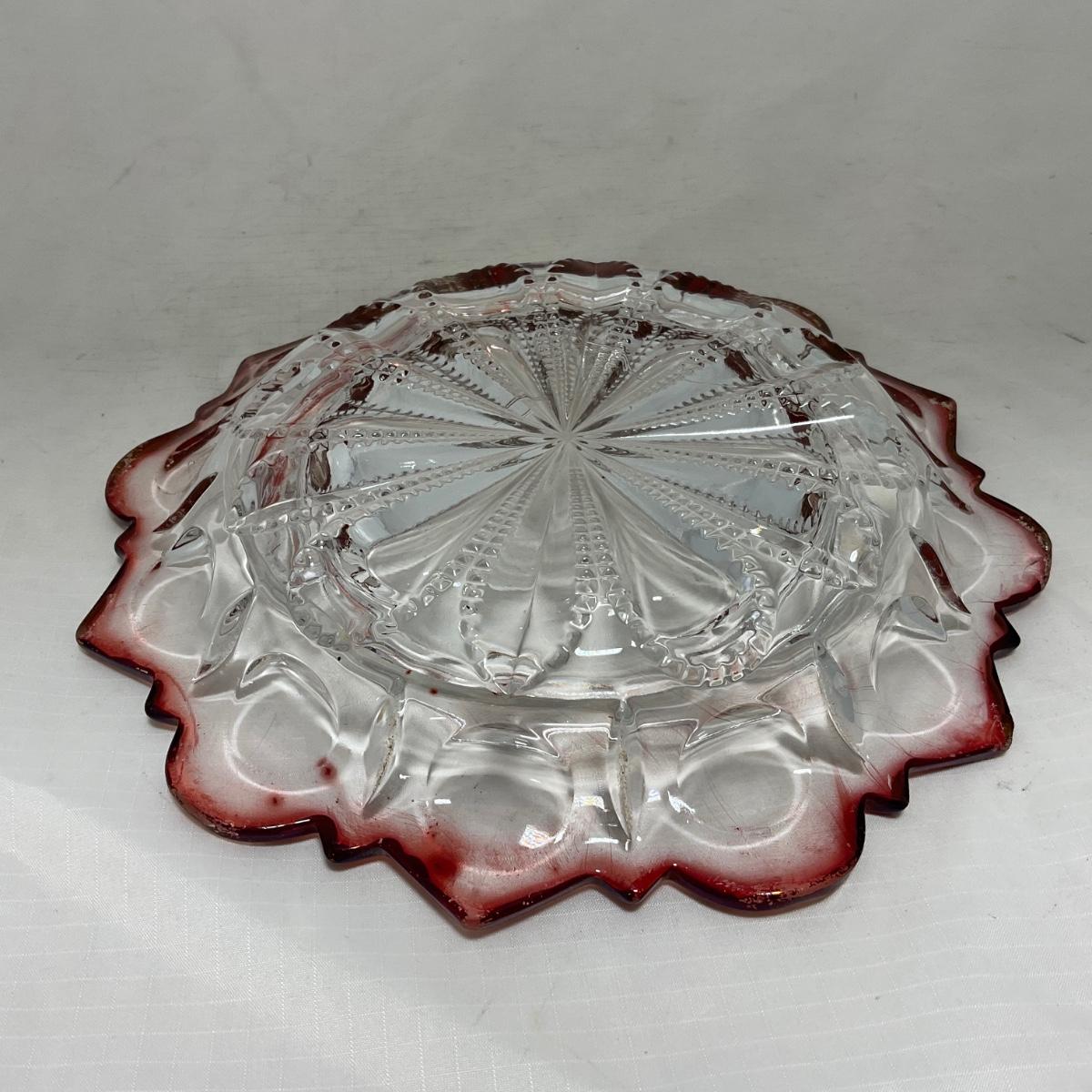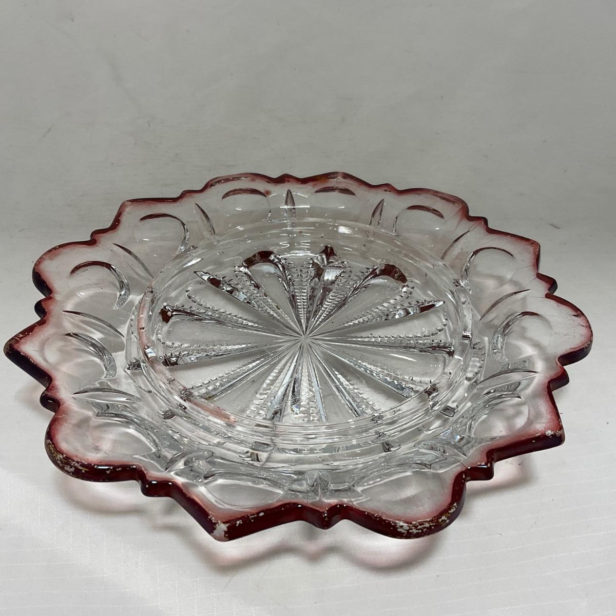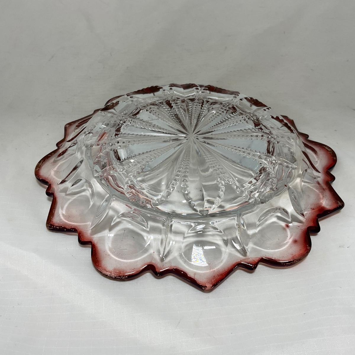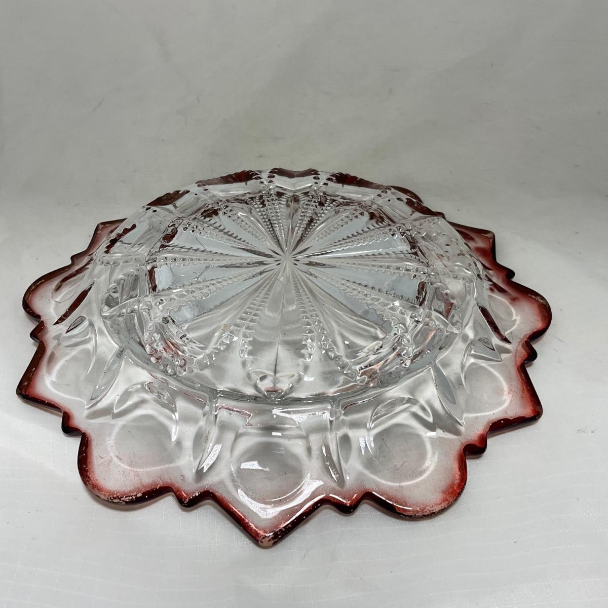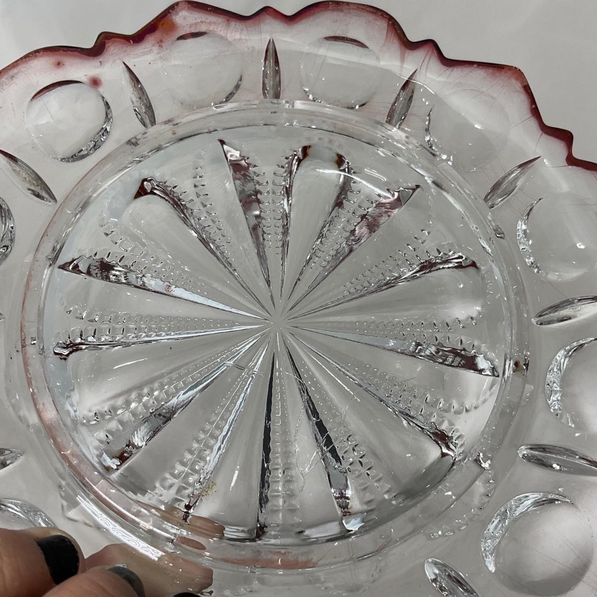 A classic ruby red and clear glass covered butter dish, with beautiful clear glass window to pear though your lid to the bottom dish. This piece is well loved so does have some wear on the ruby red coloring. Please see photos for details and condition. ::: Shipping is available on this lot. If you require shipping you must let us know at the close of the auction. We will coordinate with you after the item has been won. Shipping fees will include insurance up to or exceeding the value of all items being mailed. If you have any questions regarding this lot please contact the auctioneer either via this website, by direct email or by phone. PICK UP TIMES and other important information can be found in the TERMS and DESCRIPTION of the auction. Please take a look for pertinent information. Thanks!