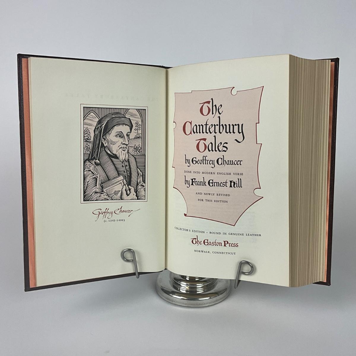 The book features specially commissioned portrait of Geoffrey Chaucer. Nicely bound in full genuine leather with gilt lettering and decorations on the cover and spine, gilt edges on all sides, raised bands on the spine, a ribbon page marker, and moire fabric end papers.
