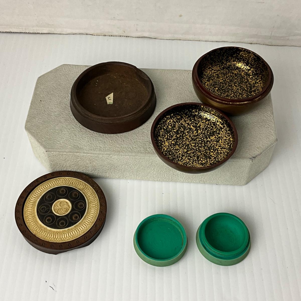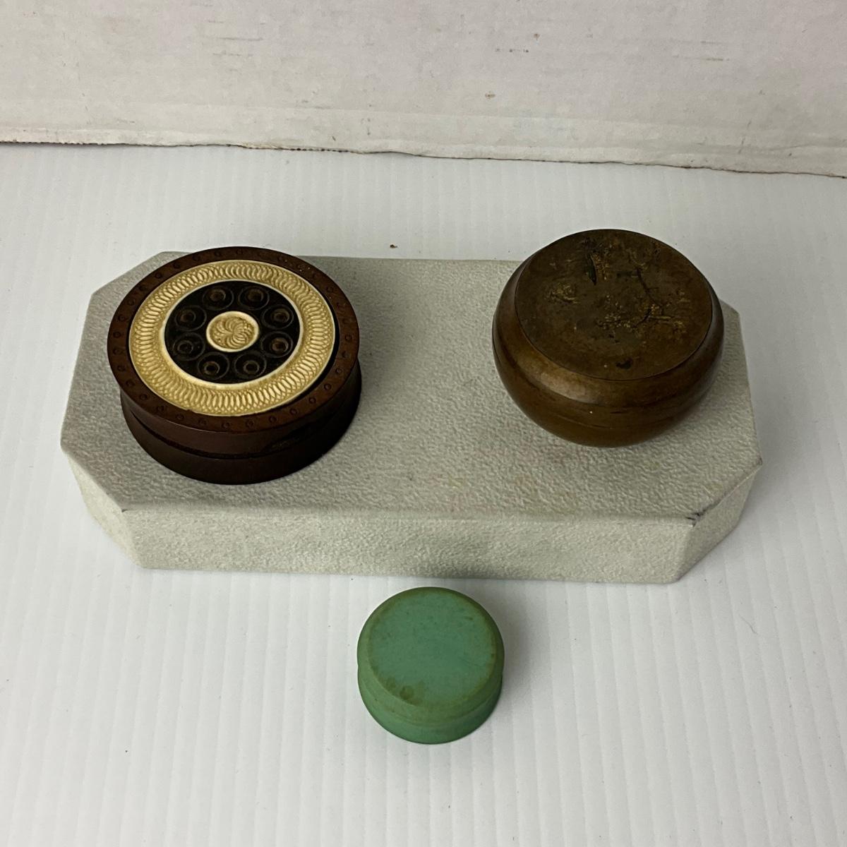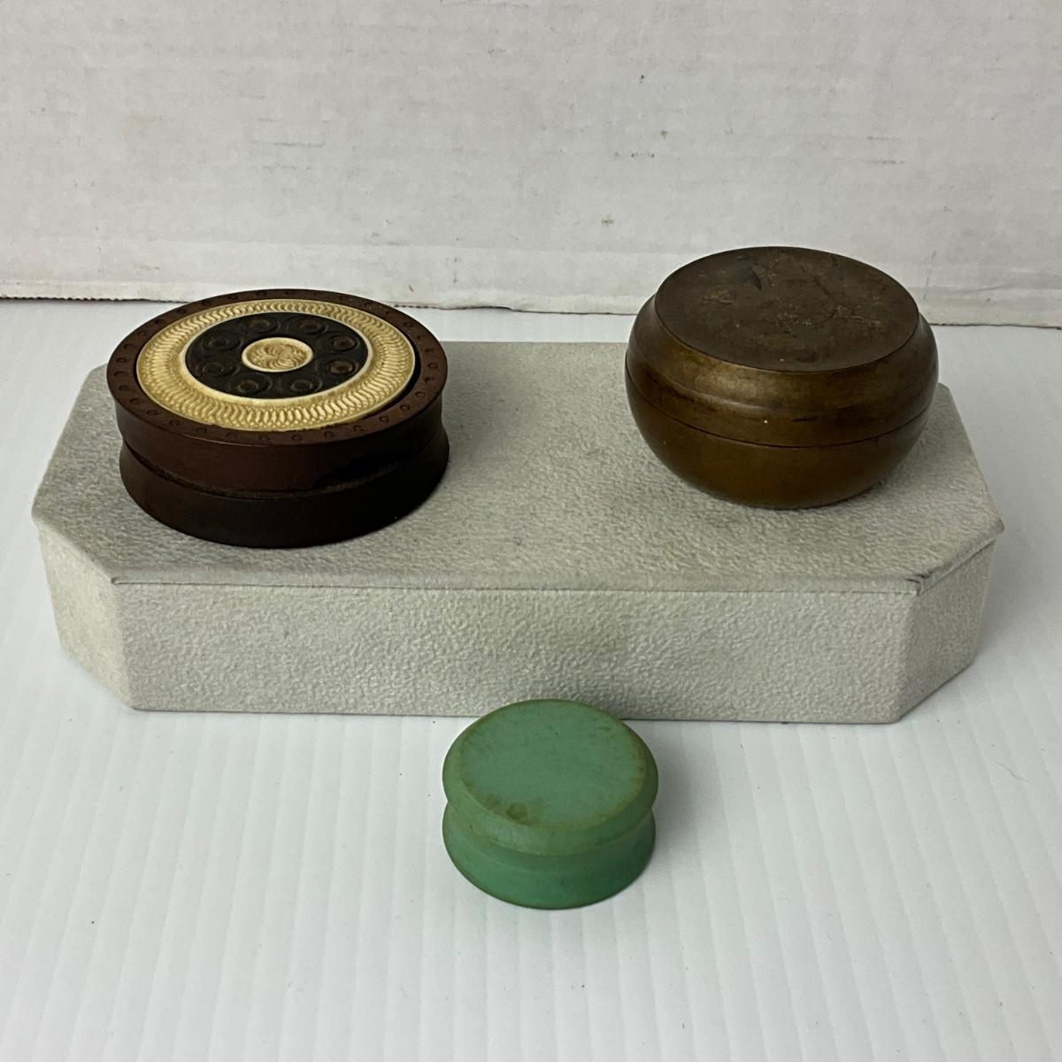 The plastic asian gold painted box measures 2.5" round and the green Elizabeth Arden box is a screw top and measures 1.5" round