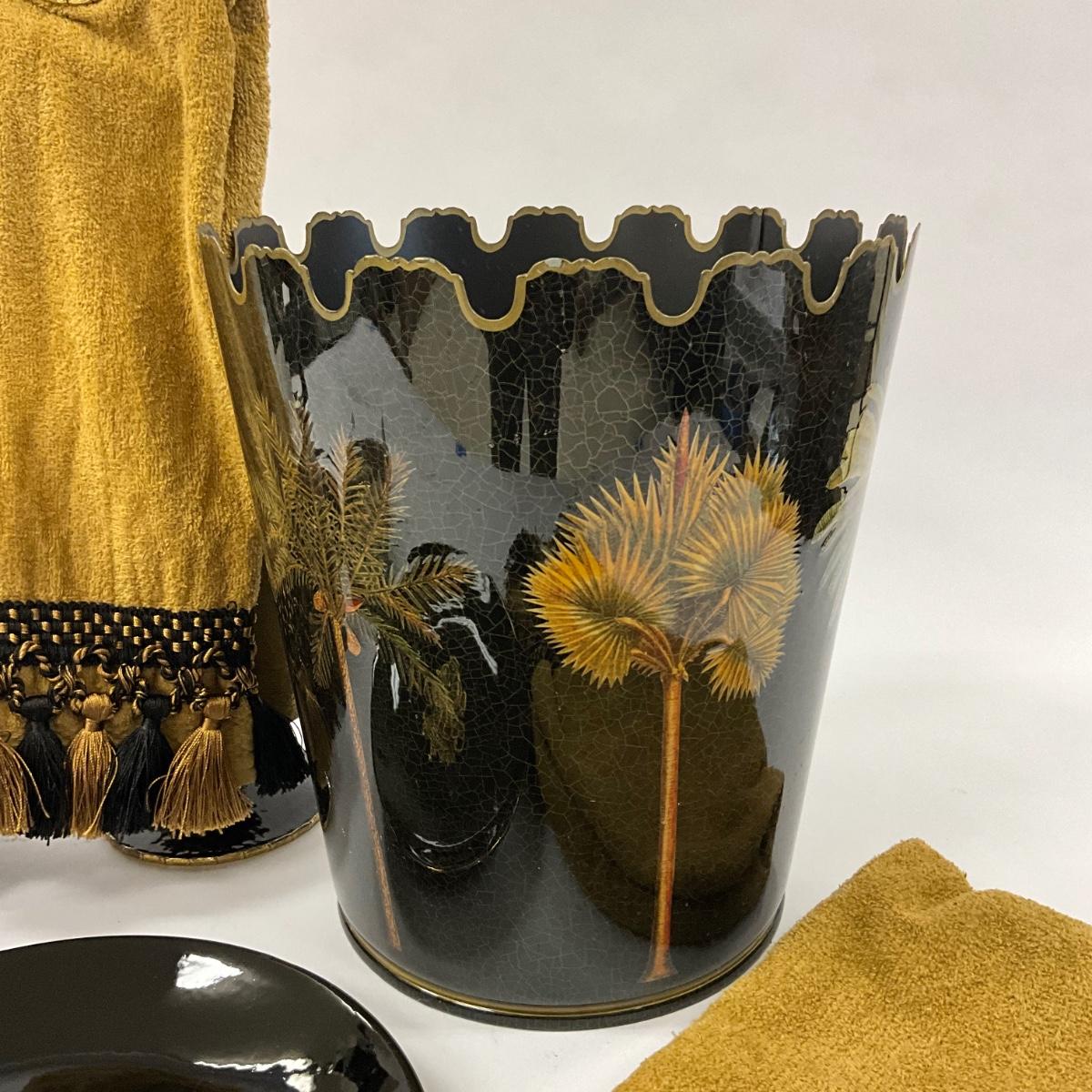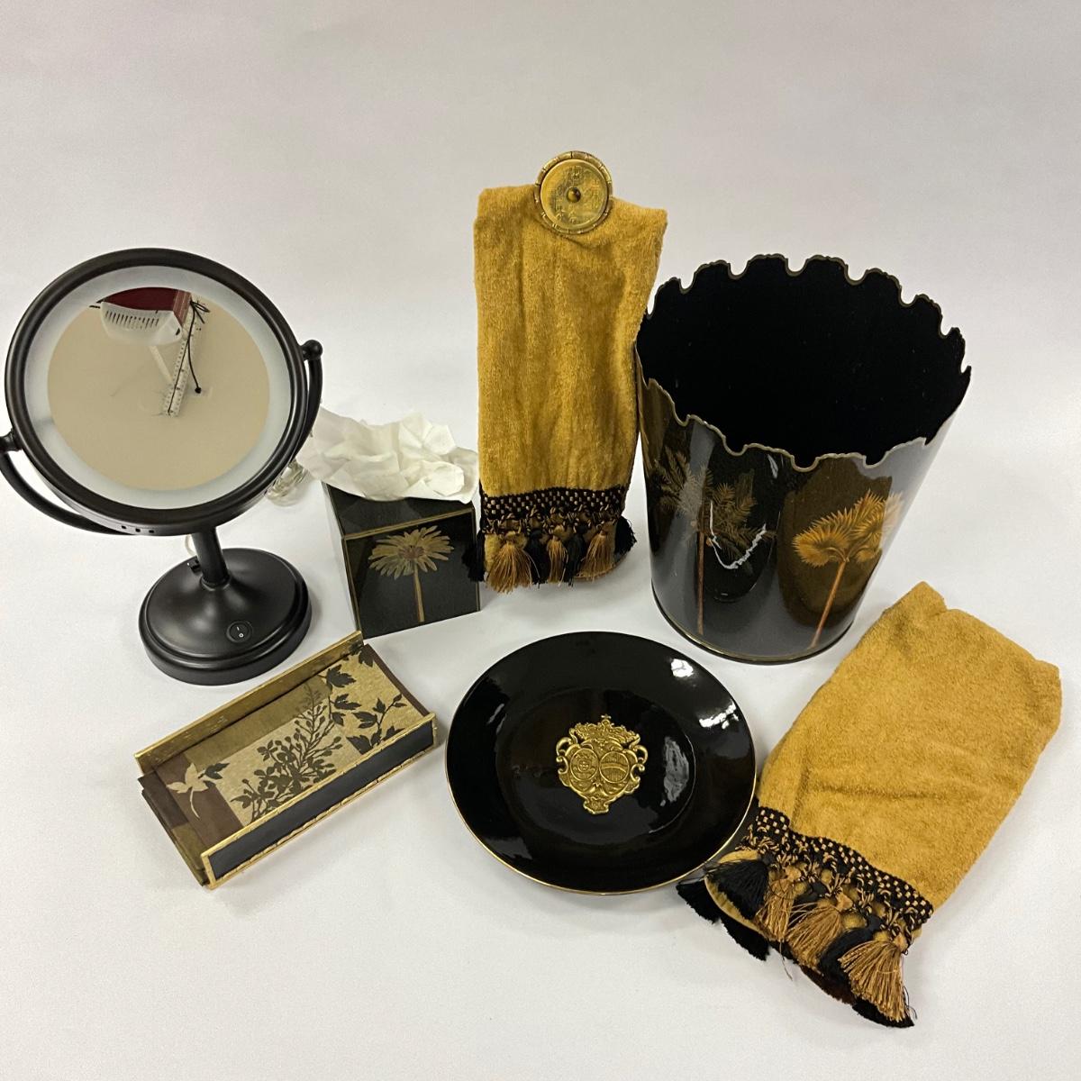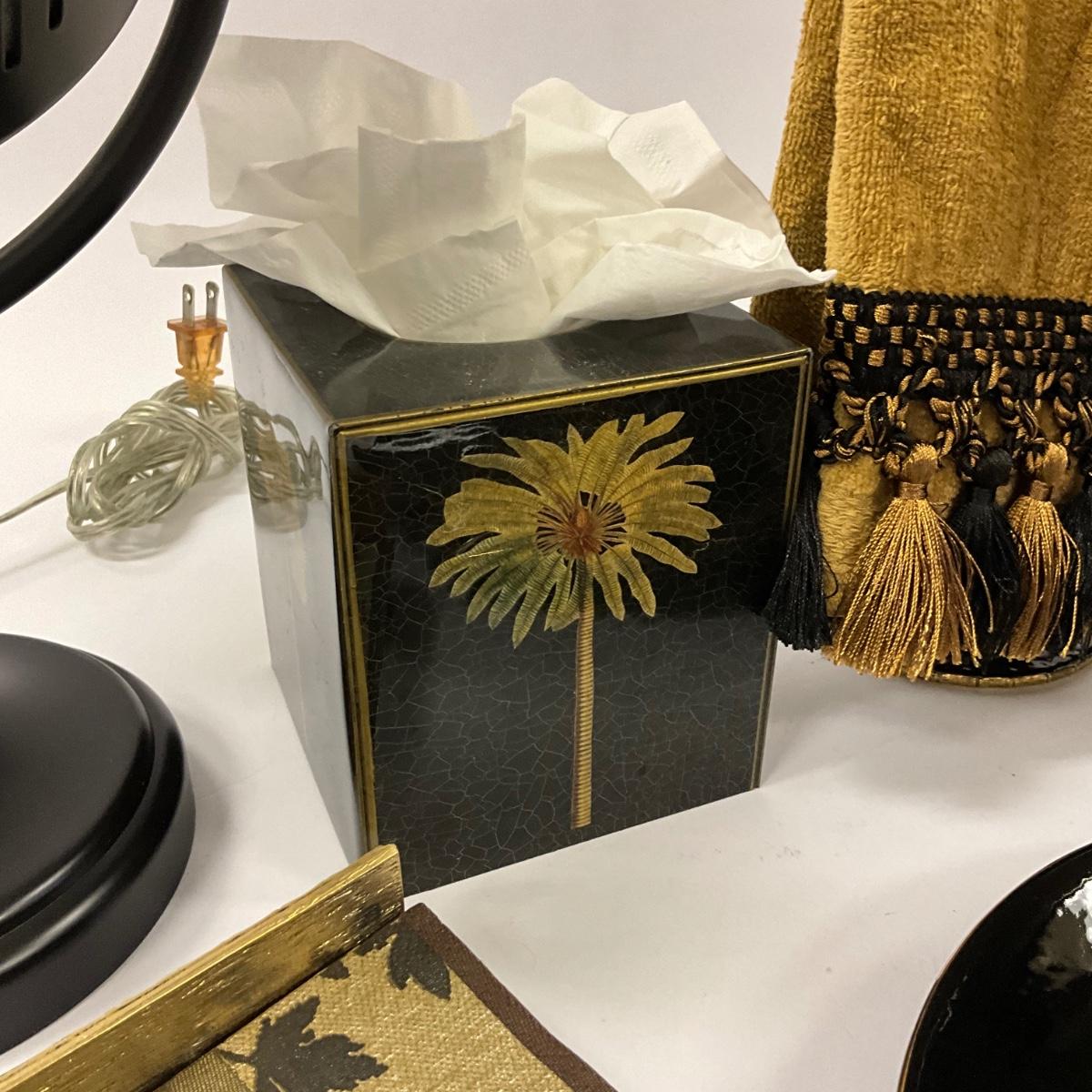 Palm tree waste can, black and gold hand towl , black and gold decorative plate , napkin holder, tissue cover, towel clip stand with light up magnifying mirror