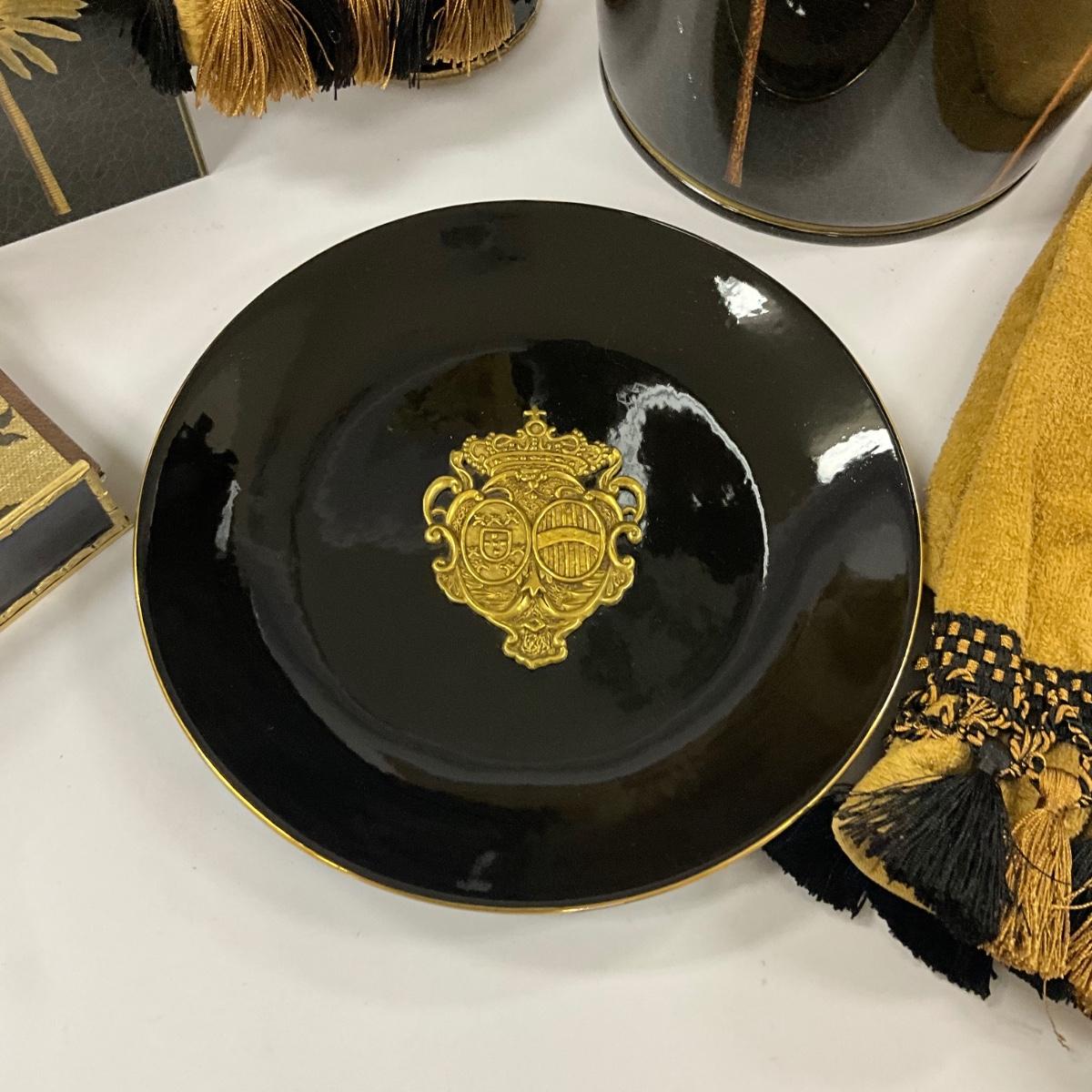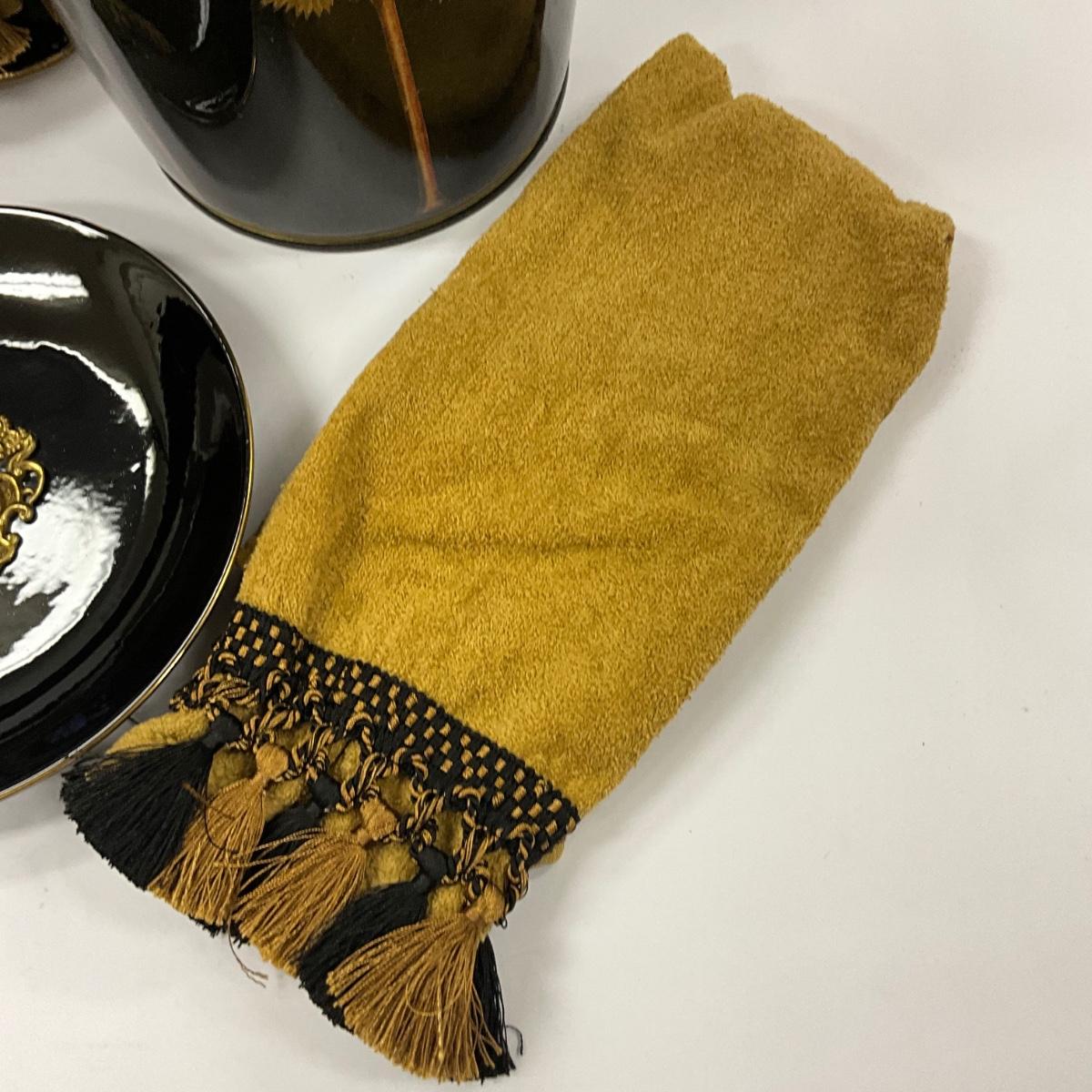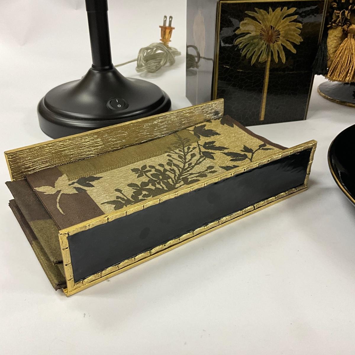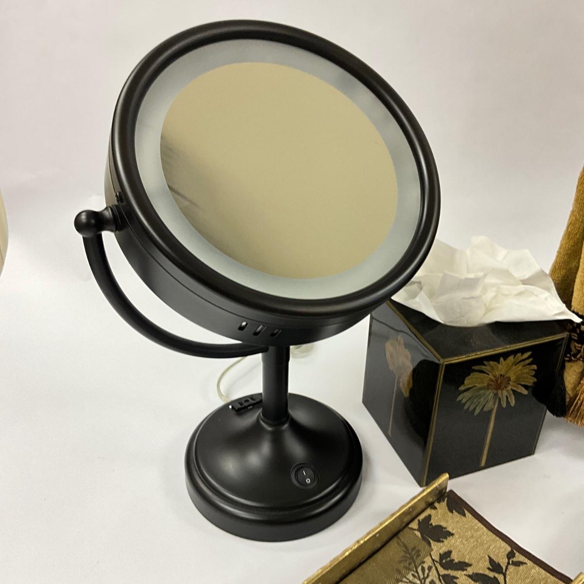 Palm tree waste can, black and gold hand towl , black and gold decorative plate , napkin holder, tissue cover, towel clip stand with light up magnifying mirror