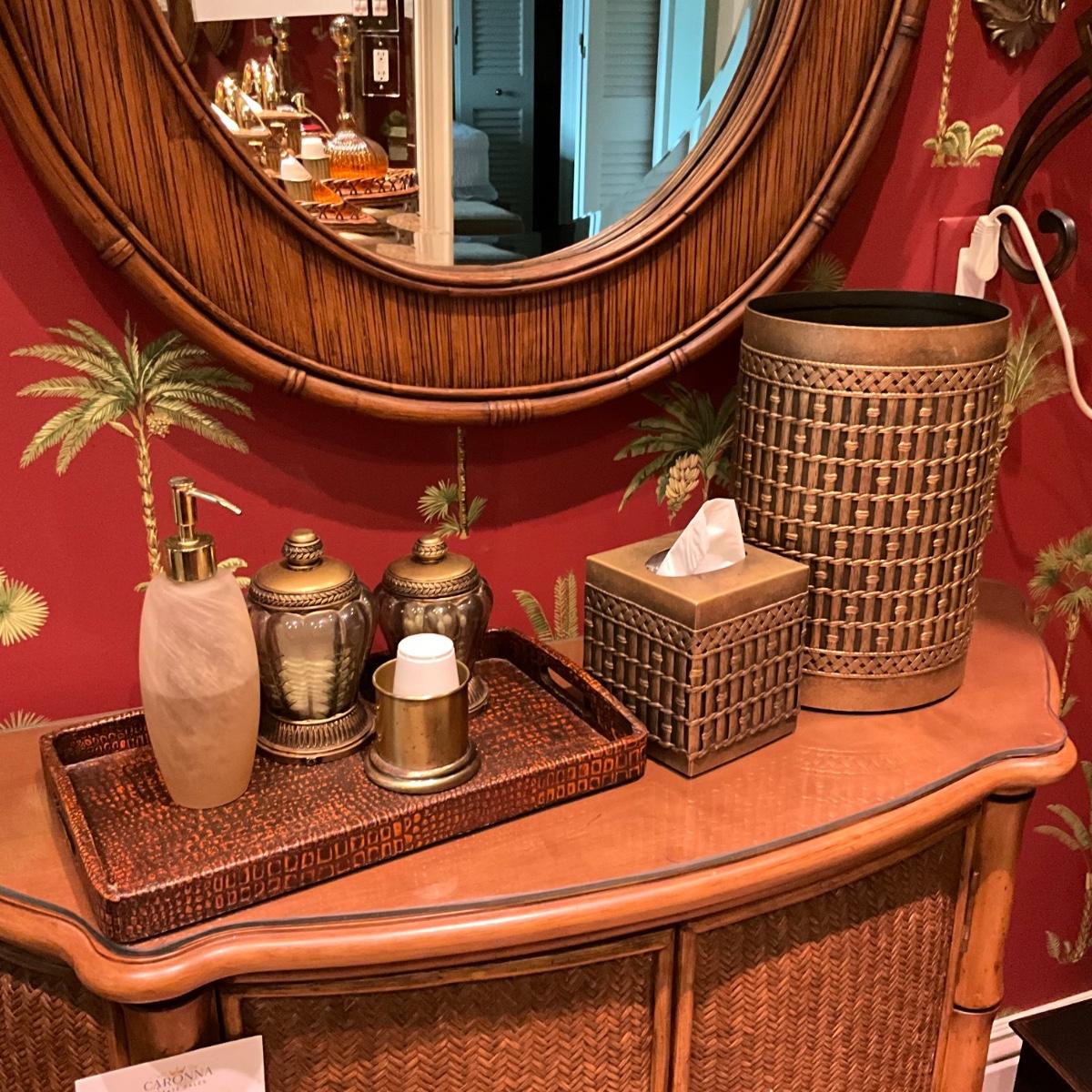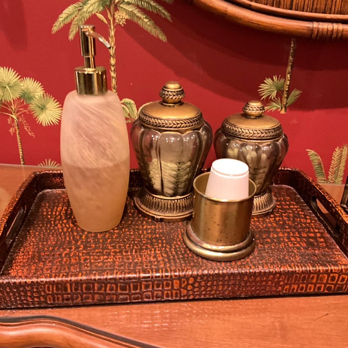 Rattan tray with two covered glass jars, cup holder , soap dispenser, tissue cover, waste can