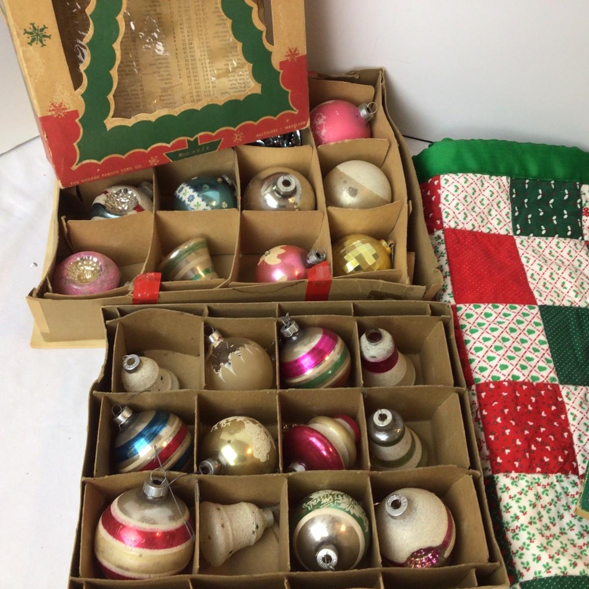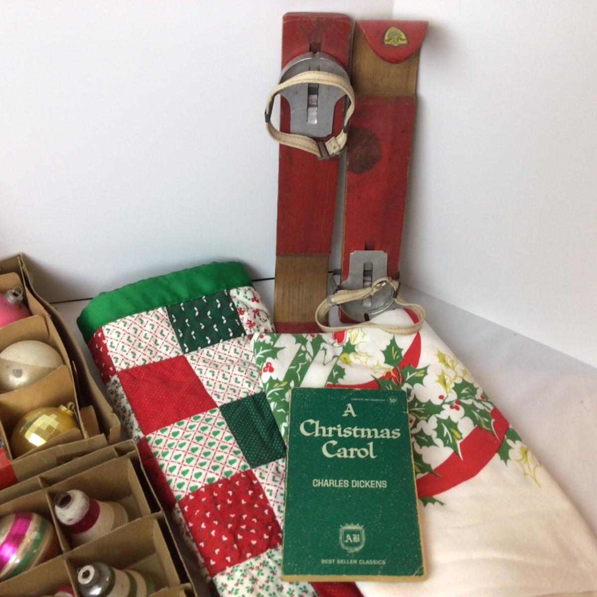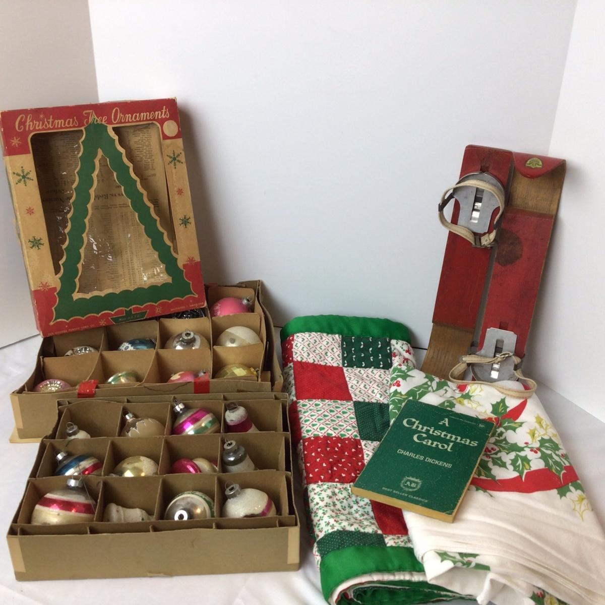 Lot contains 2 boxes of glass ornaments in original boxes (made in Baltimore Maryland) vintage linens, ski’s and more.
