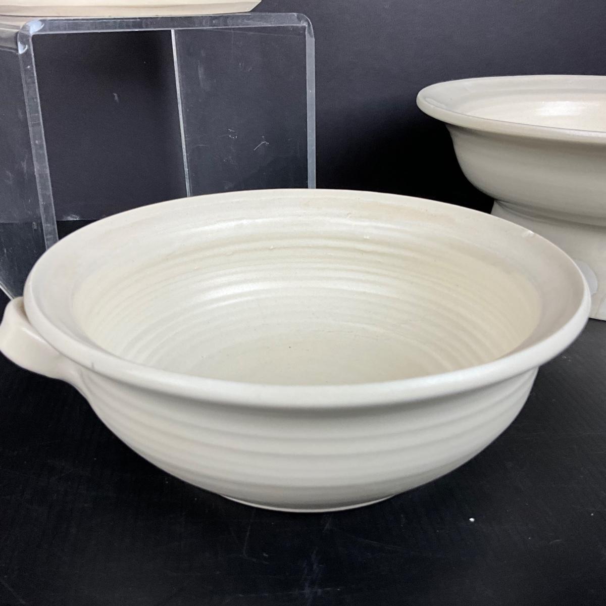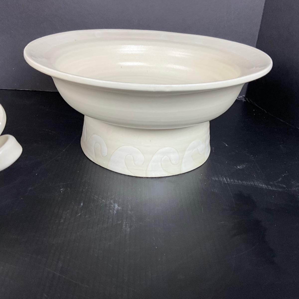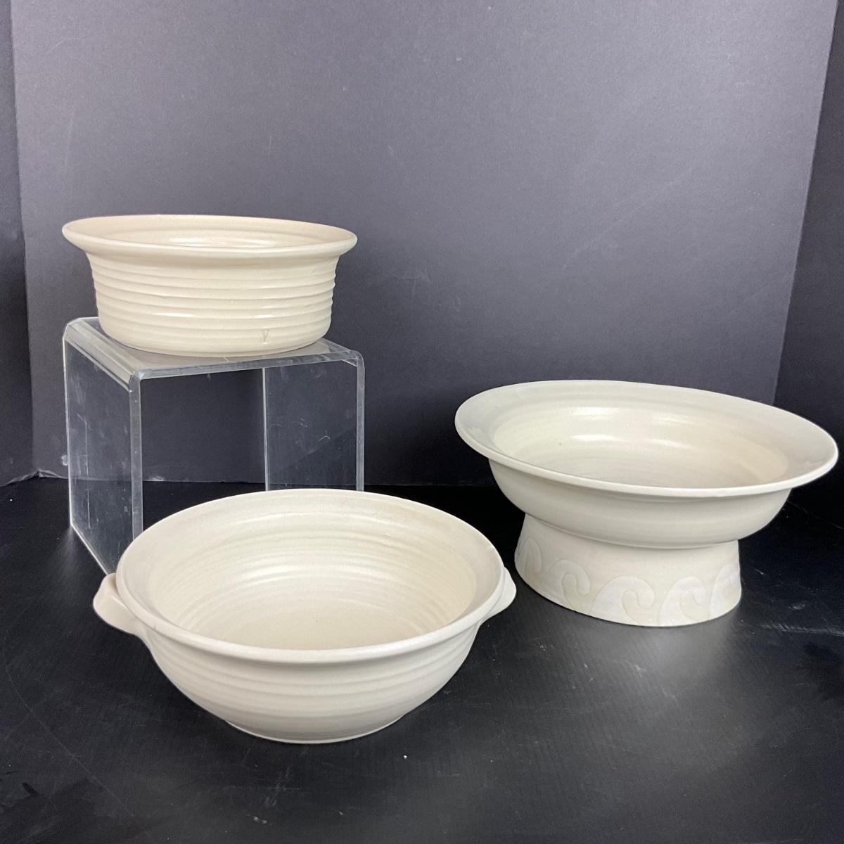 Small lipped bowl is 7.25" diameter x 3" high , wave pedestal bowl is 9.75" diameter x 4.5" high , handled bowl is 8" diameter x 3" high