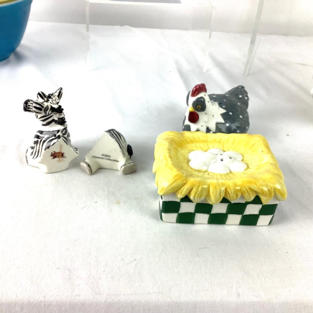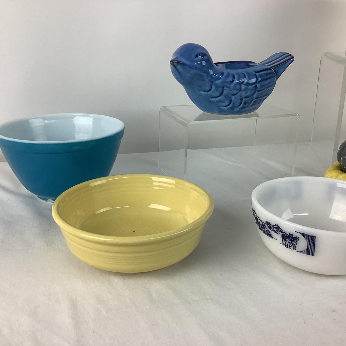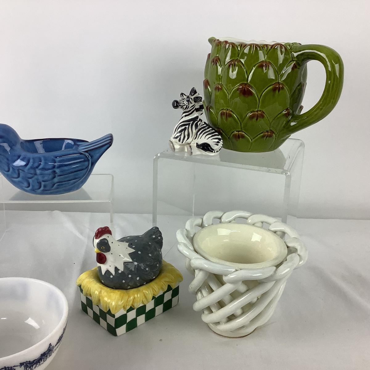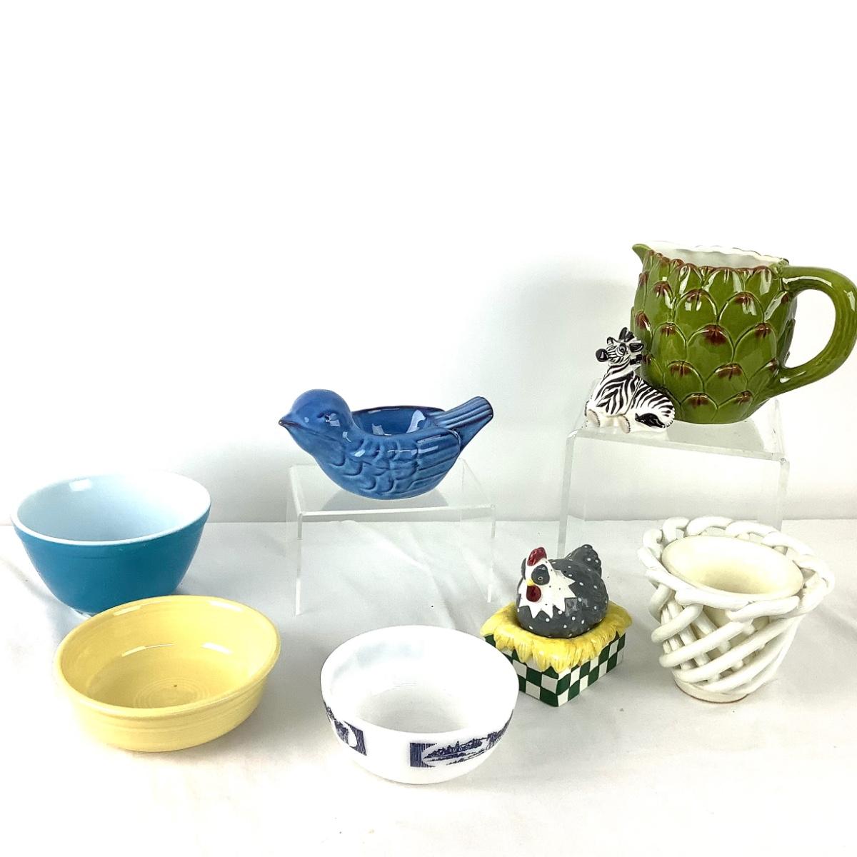 The lot contains salt & pepper shakers-zebra and chicken on nest. Pyrex blue bowl #401 has a chip on the base, Fiesta yellow bowl 5.5" diameter x 2" deep, Artichoke pitcher 5.5" high x 5" diameter, spaghetti wear planter is 4"high x 5" diameter, Currier and Ives bowl is 5" diameter x 2" high, blue bird tea lite holder is 7" x 4" x 4".