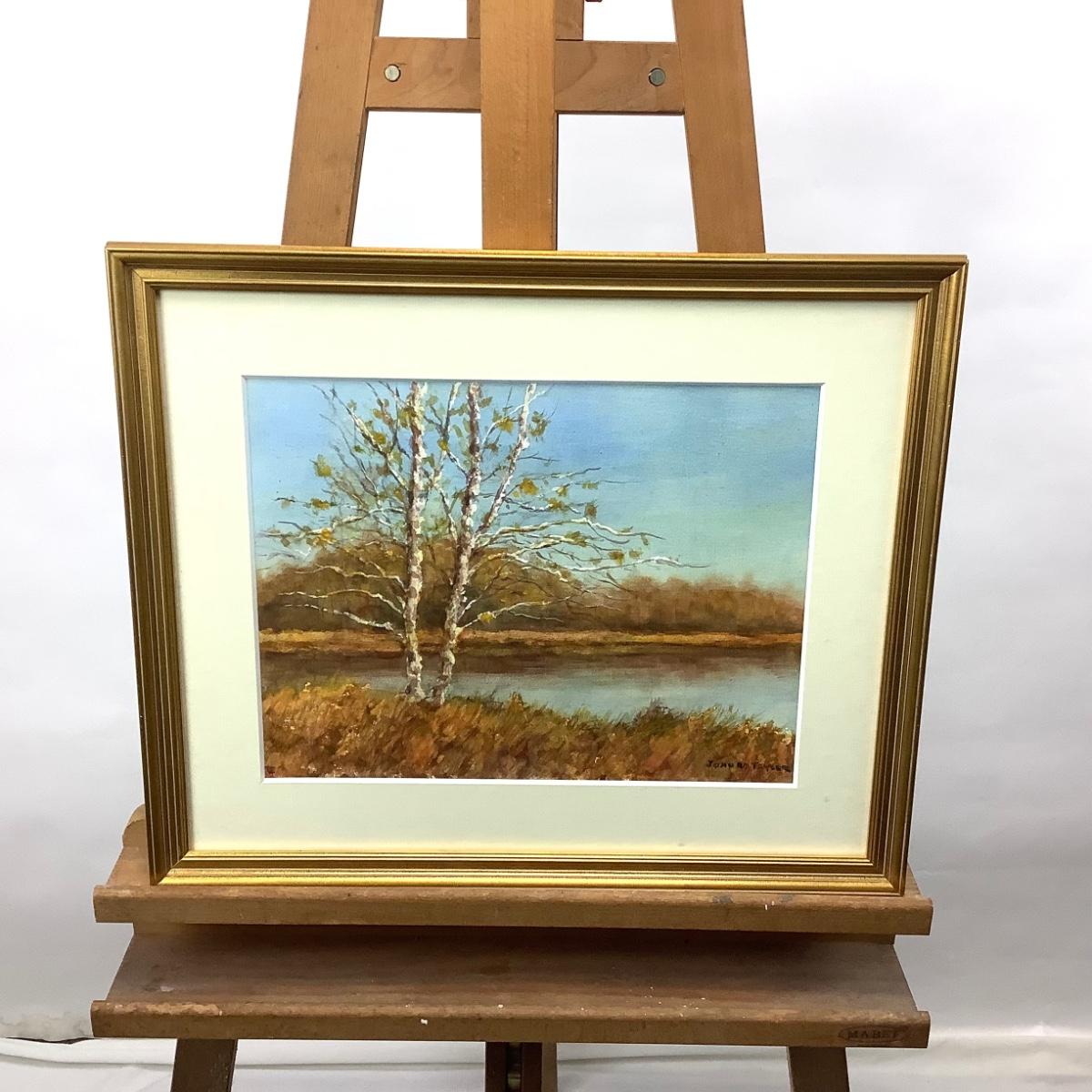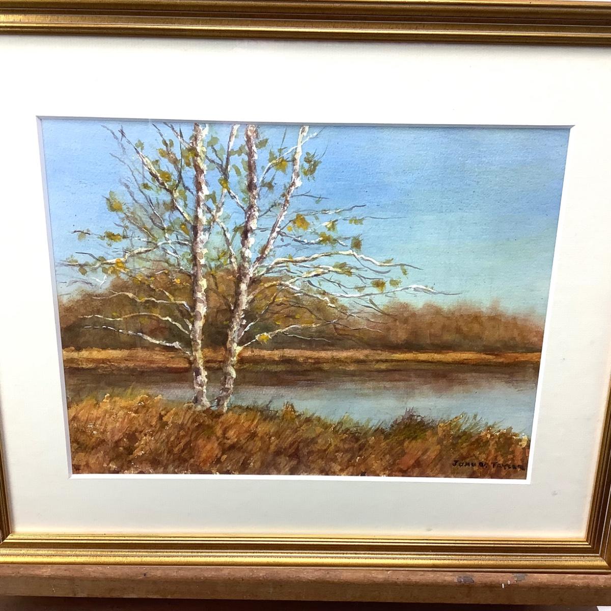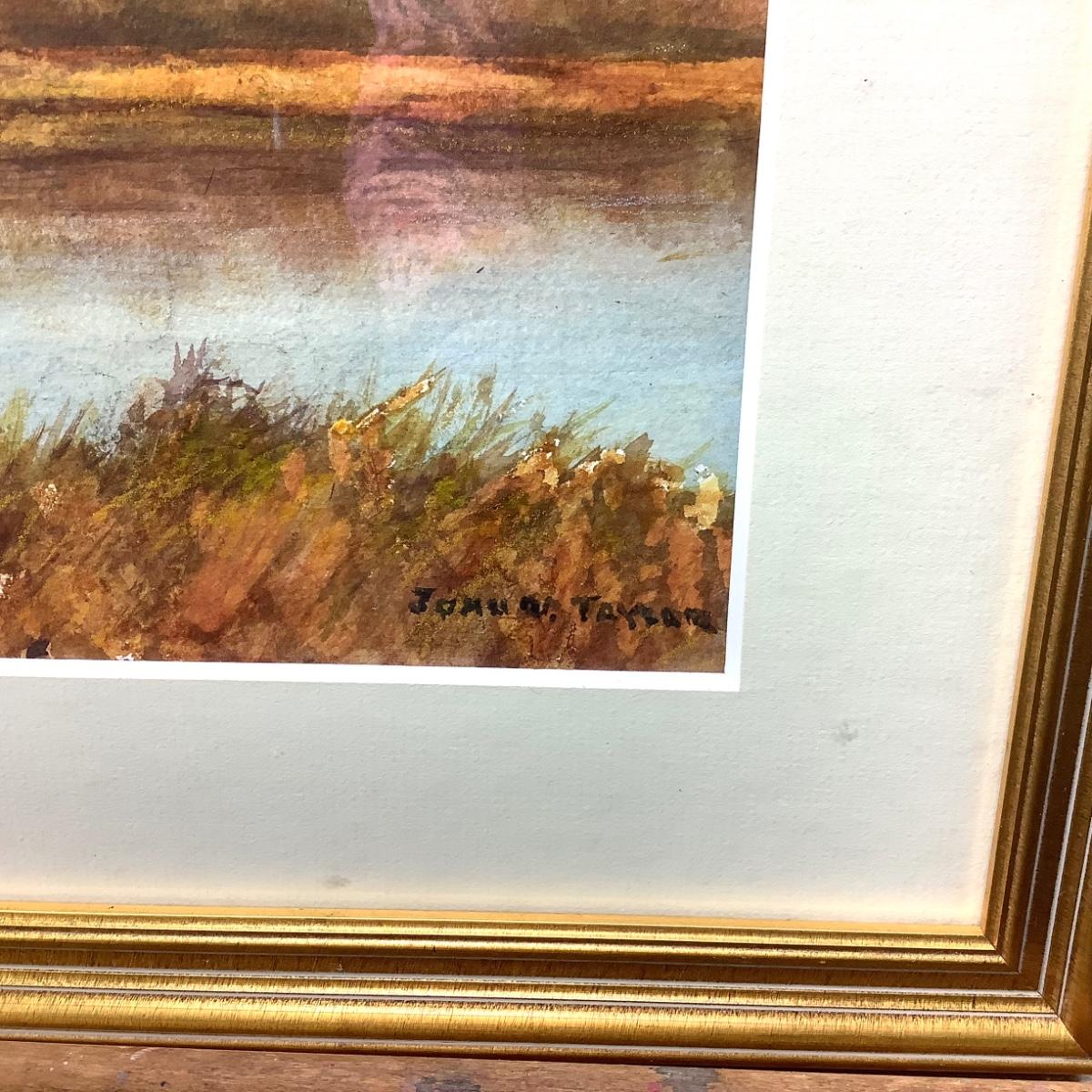 The painting is water color on canvas that has been matted and framed, measures 20" wide x 17" high. Mr. Taylor is known for his paintings of wildlife and birds. He was born in Washington D.C. in 1931 and died in 2017 in Pasadena, MD. He has won wide acclaim for his paintings of Delmarva and the Chesapeake Bay.