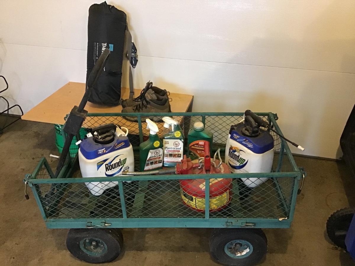 1046 - Garden Cart, Columbia Boots (size 12), Camping Pad, Roundup