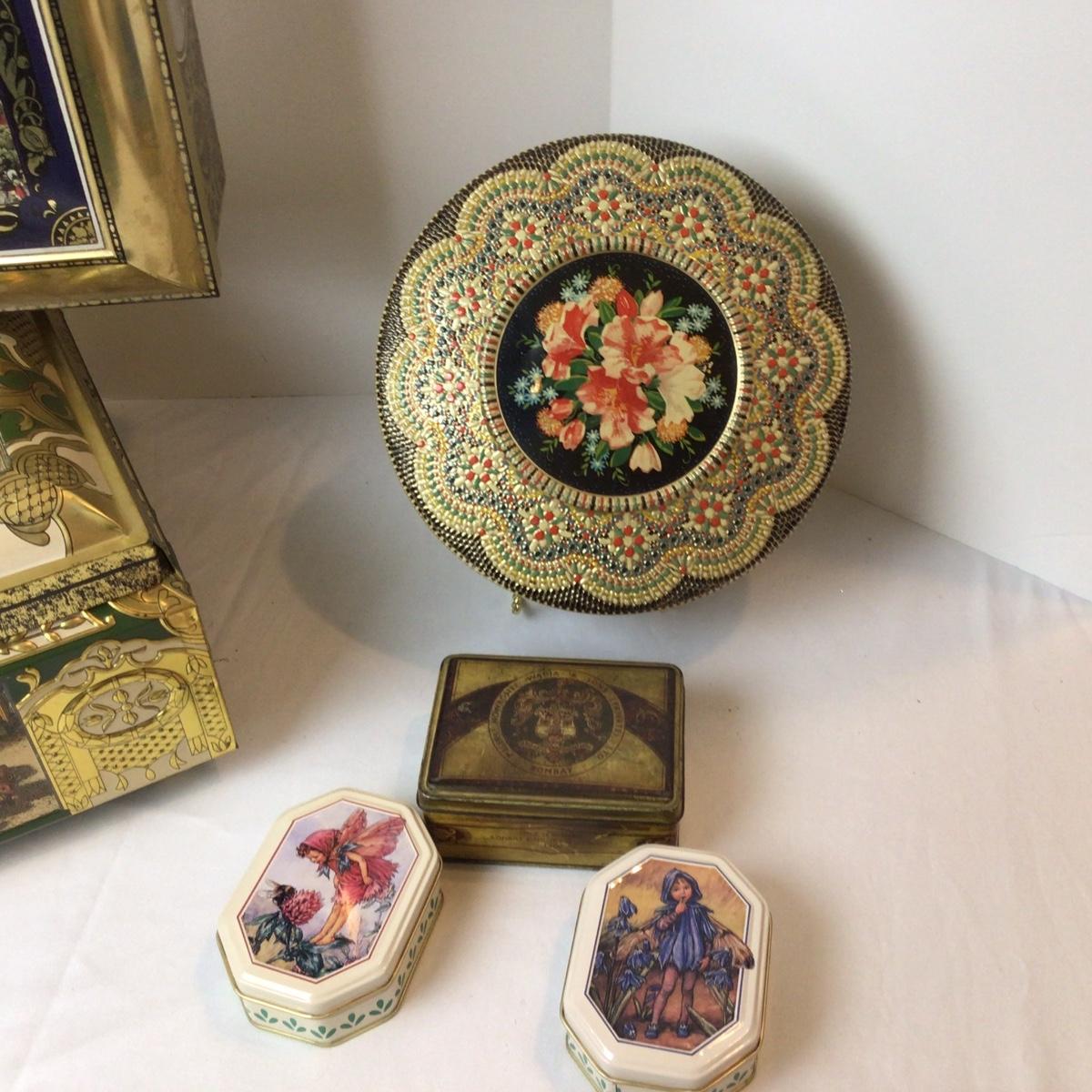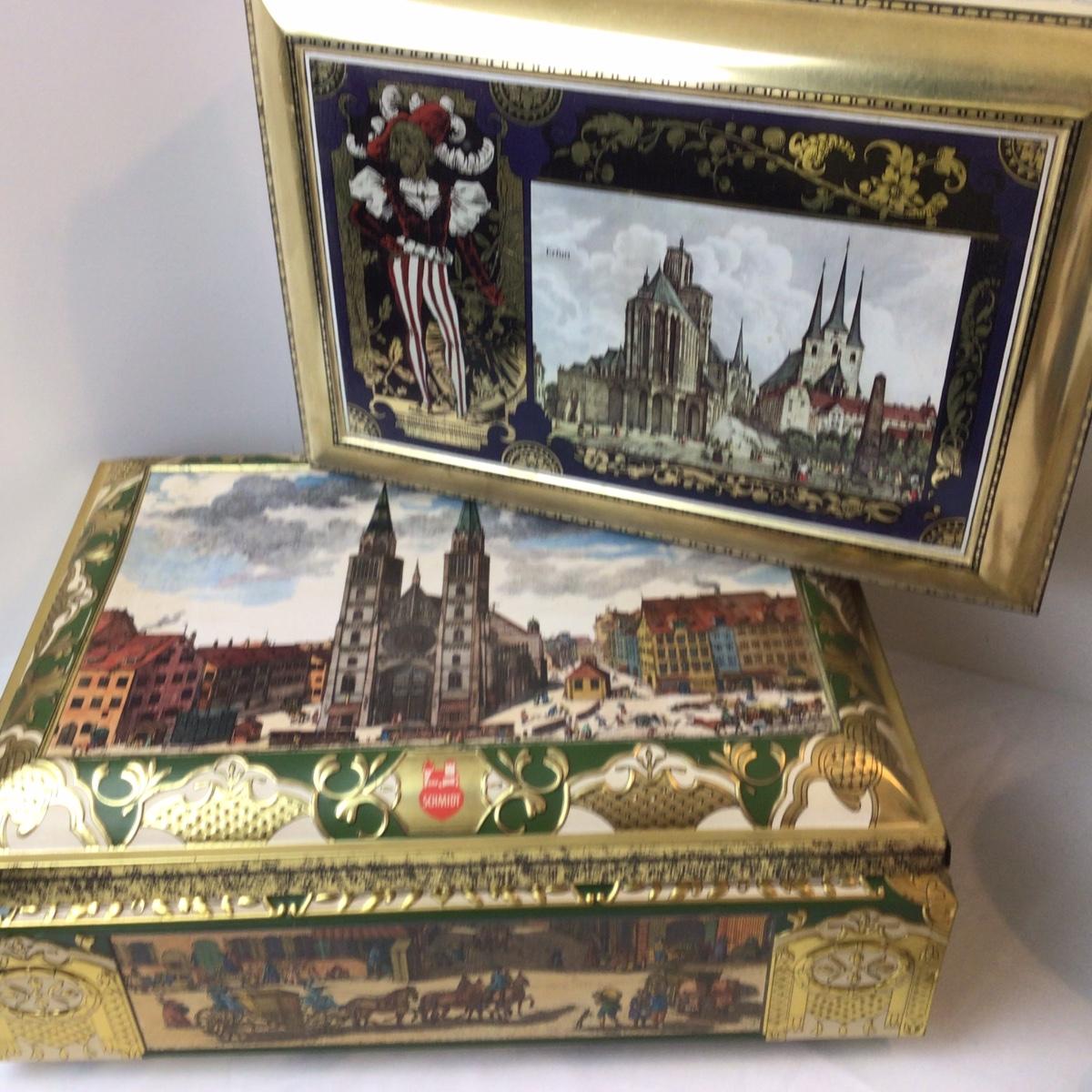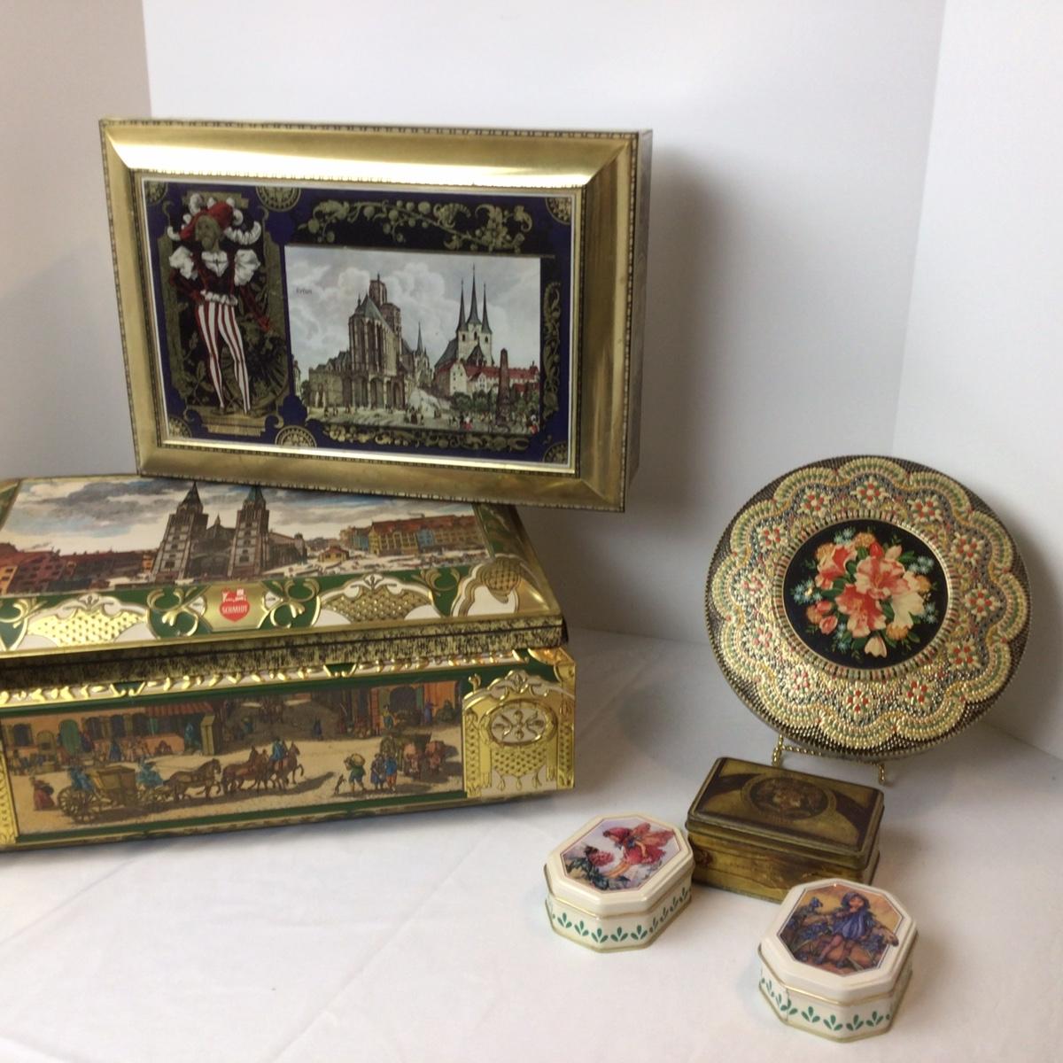 The lot contains E. Otto Schmidt tin (16”x11”x8) rectangular vintage tin that is 14”x9”x4”, round floral tin and 3 small tins.