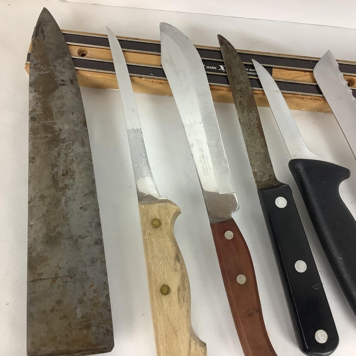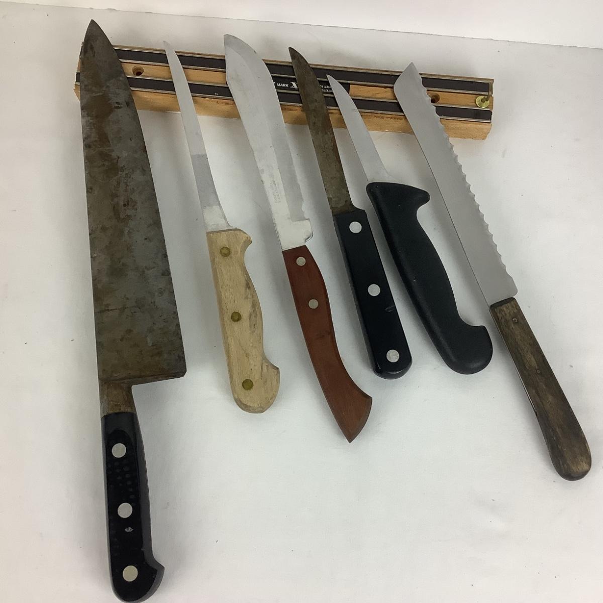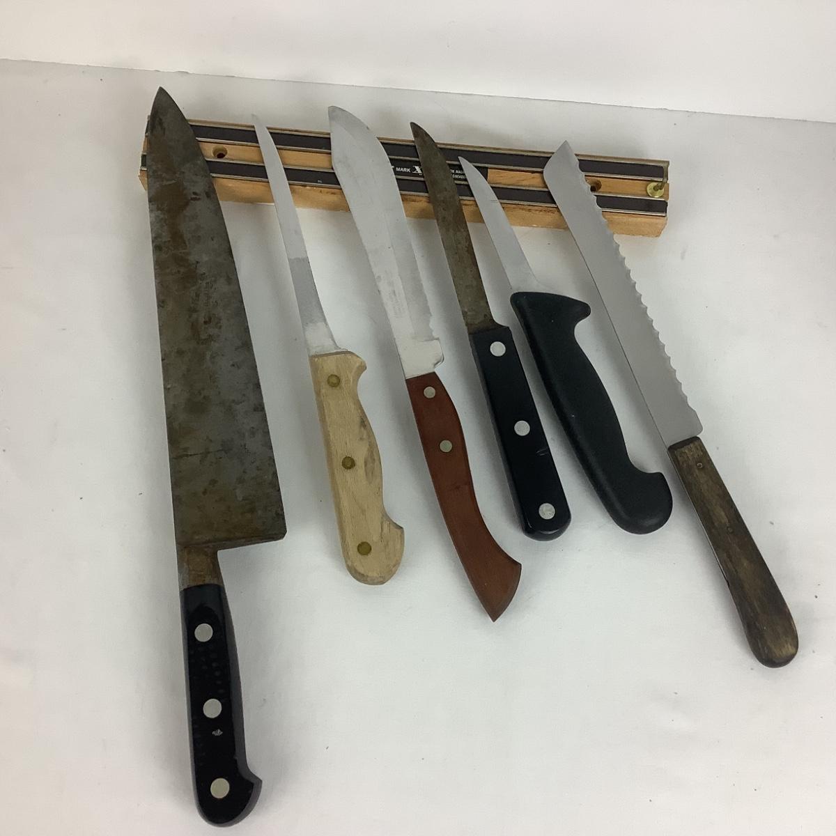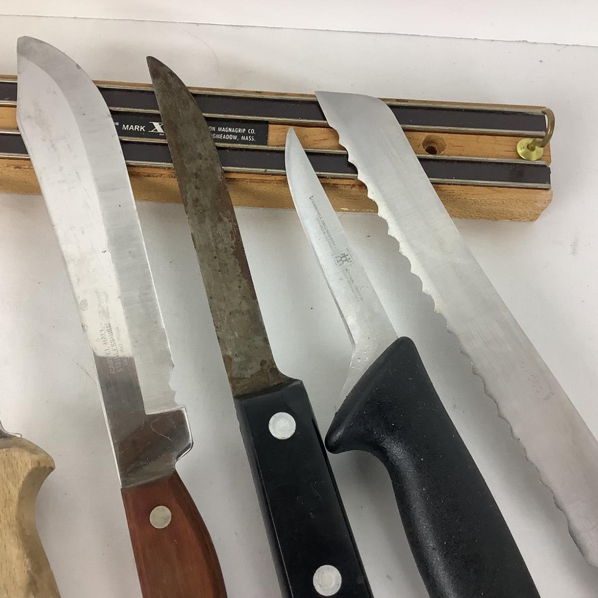 1049 Magnobar Knife Magnetic strip with 6 Assorted Henkels, Sabatier, and Carval Hall Knives