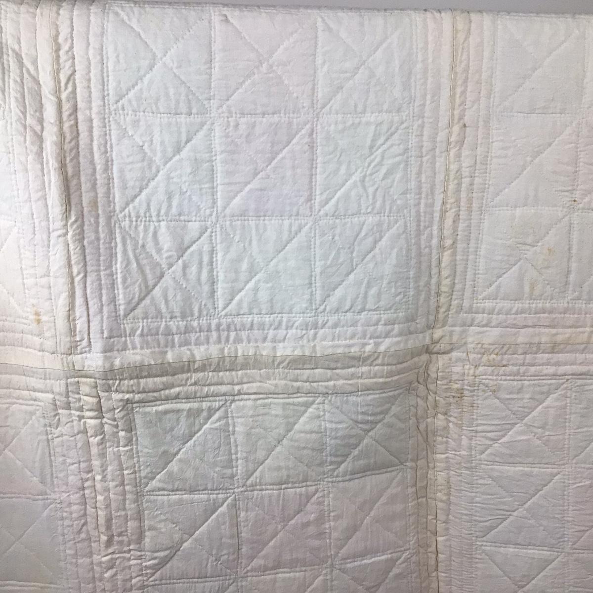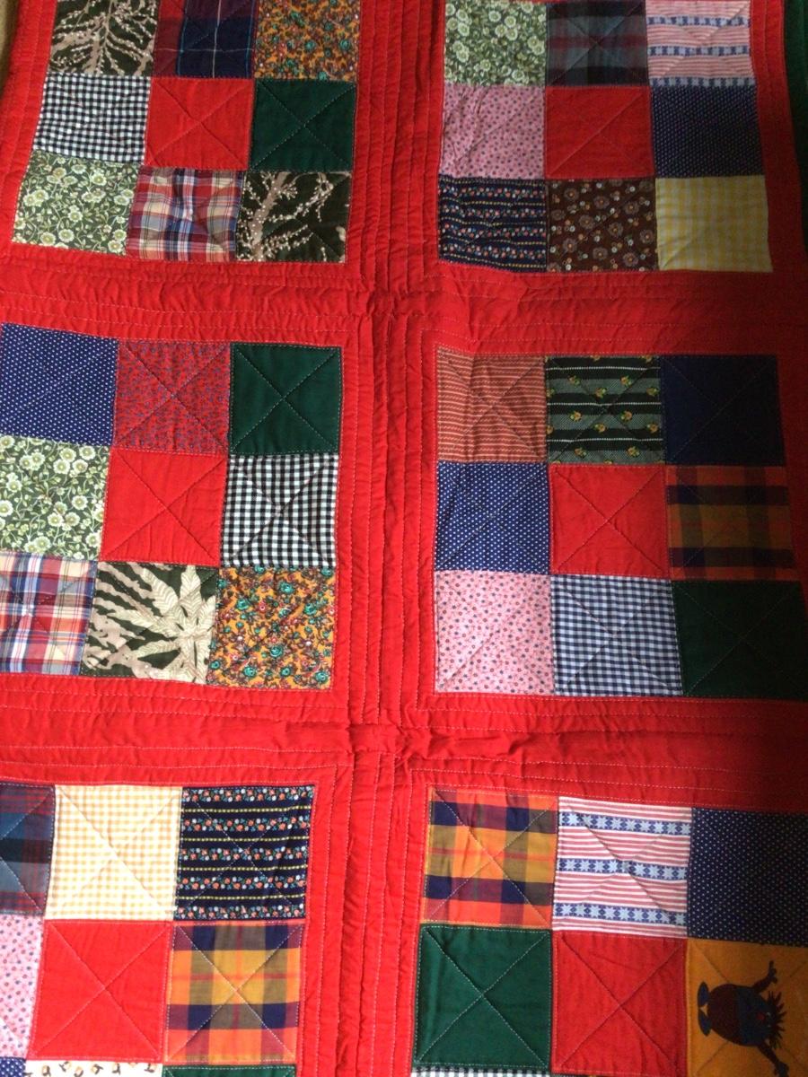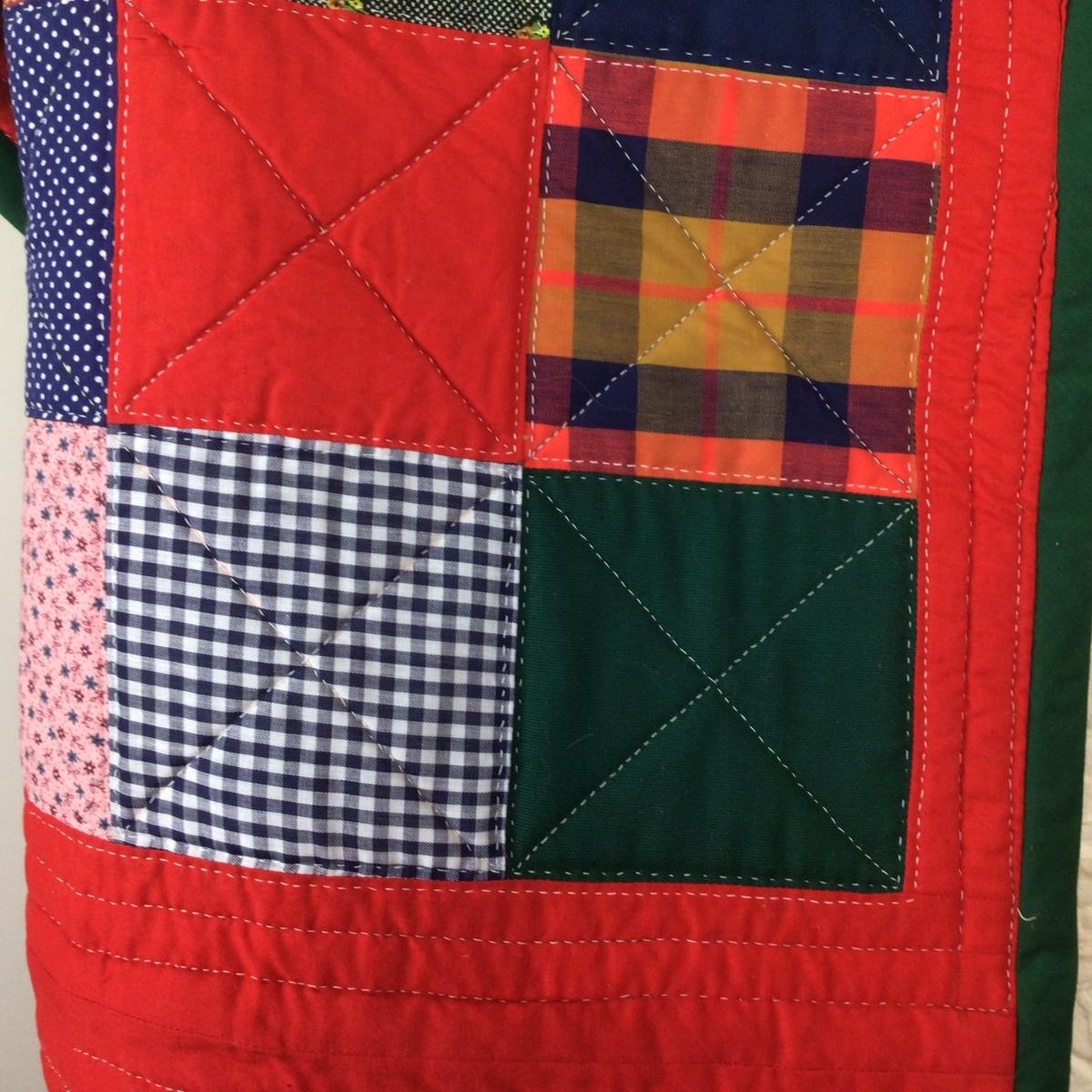 Quilt is 100” x 68”, bright colors, hand stitched.