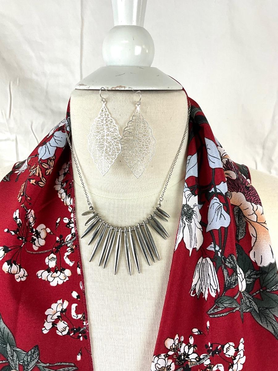 105 Cherry Blossom Shawl with Silvertone Necklace and Earrings