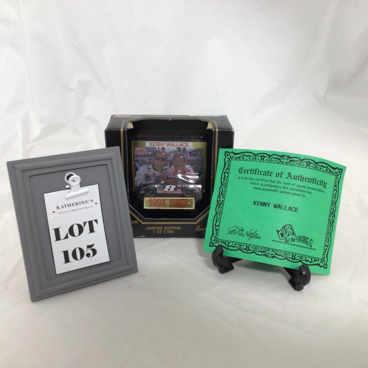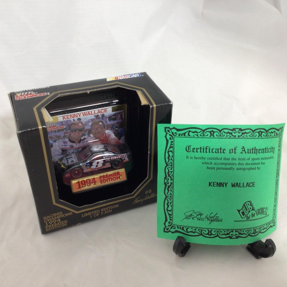 Signed Kenny Wallace Racing Champions 1994 Premier Edition with certificate of authenticity. Please see photos for details and condition. ::: Shipping is available on this lot. If you require shipping you must let us know at the close of the auction. We will coordinate with you after the item has been won. Shipping fees will include insurance up to or exceeding the value of all items being mailed. If you have any questions regarding this lot please contact the auctioneer either via this website, by direct email or by phone. PICK UP TIMES and other important information can be found in the TERMS and DESCRIPTION of the auction. Please take a look for pertinent information. Thanks!