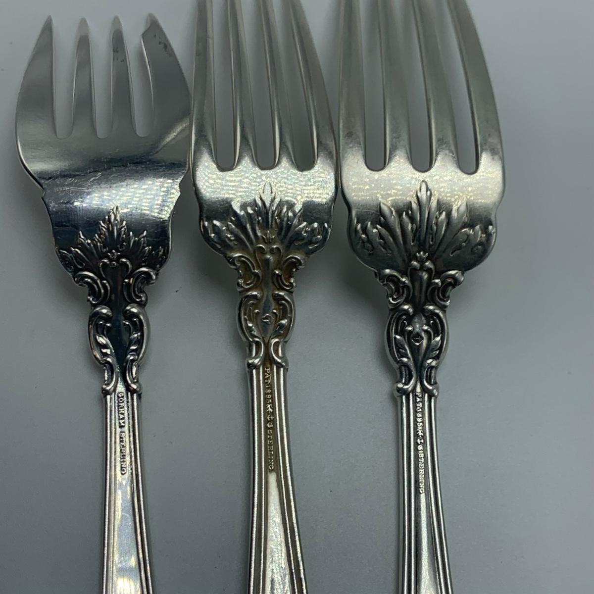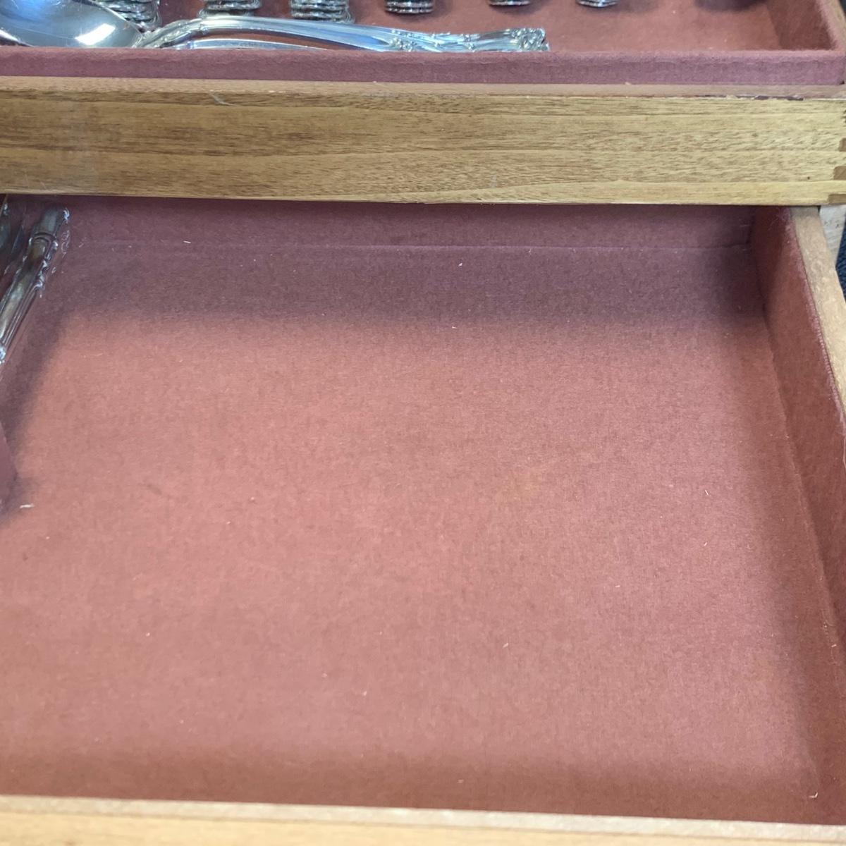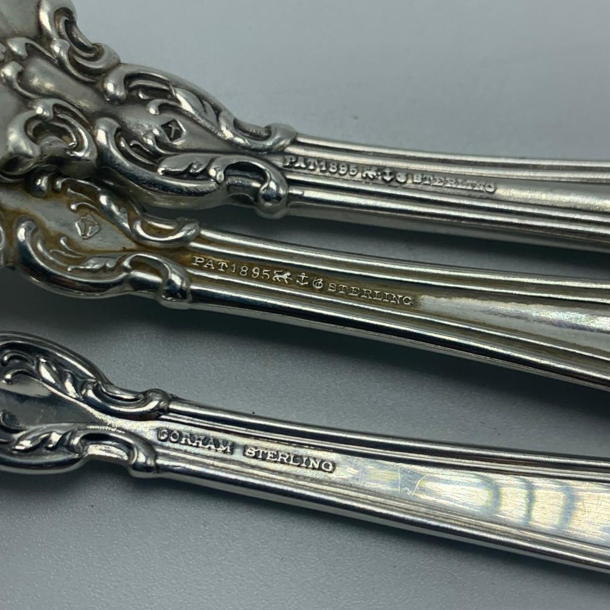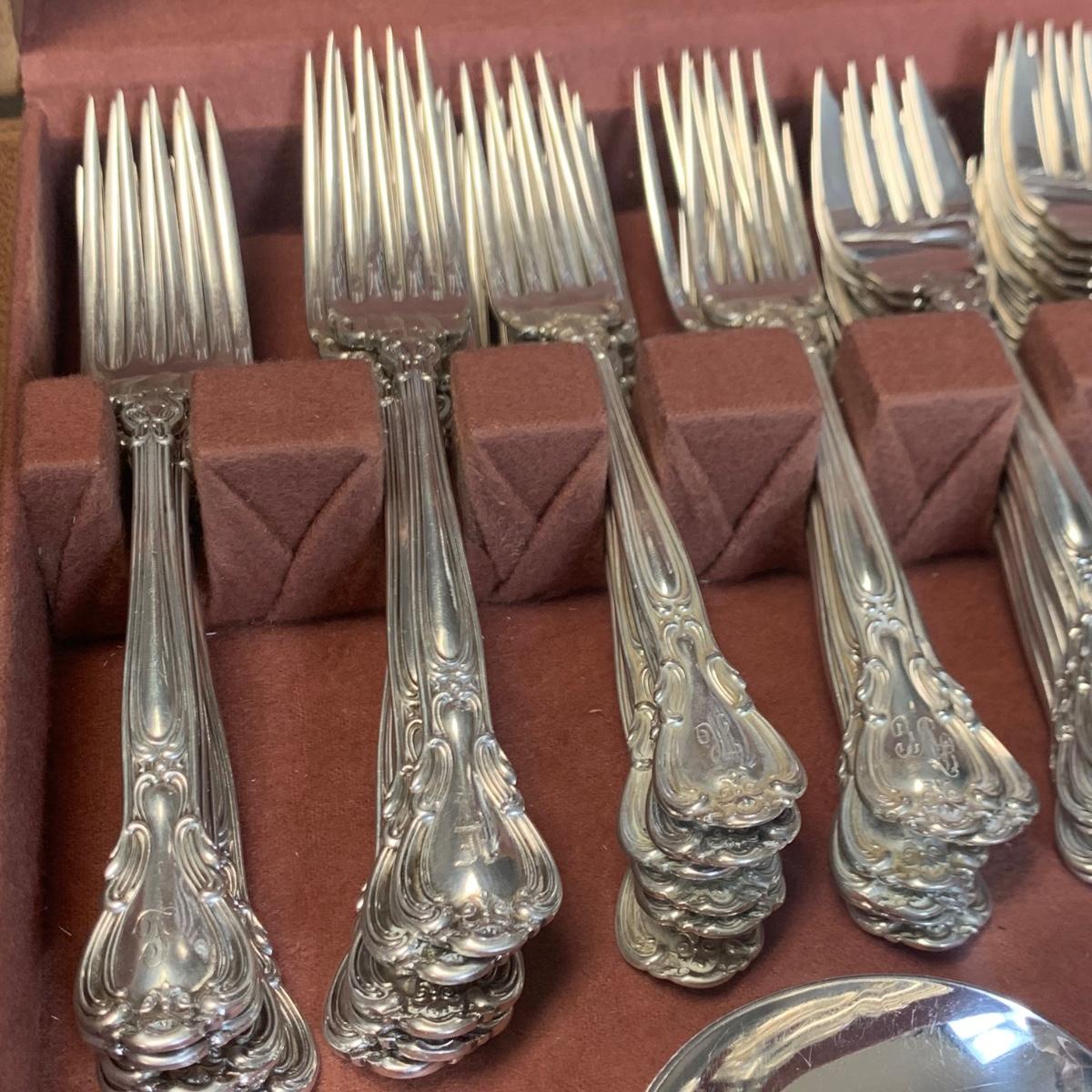 Gorham Sterling silver flatware set in their Chantilly pattern. A complete eight piece set for eight people with many extras, plus four serving spoons. The set includes three sizes of forks, three sizes of spoons (four if you include the serving spoons), butter knives, and two sizes of dinner knives. Approximately 105 pieces total plus a solid wood Naken’s Tarnish Proof Silverware Chest. Chest has brass-like metal hardware and measures 15” x 11.25” x 5.75”H. Some of the silver pieces are engraved with various initials. Starting bid is ant or near melt value. All sales are final. No returns or refunds. Please bid accordingly.