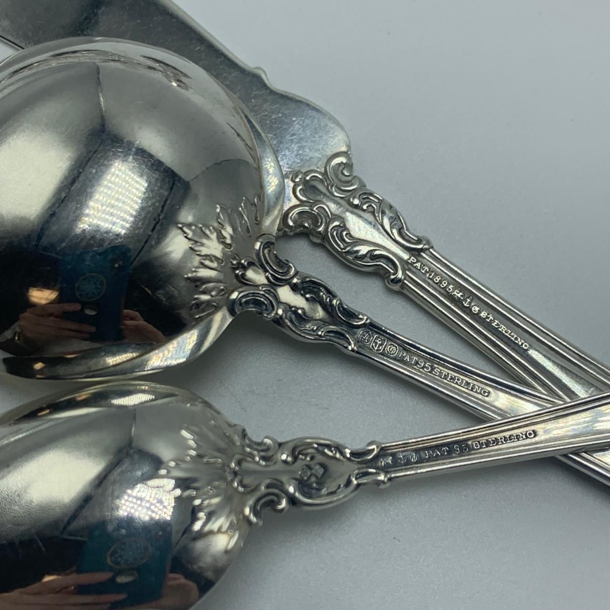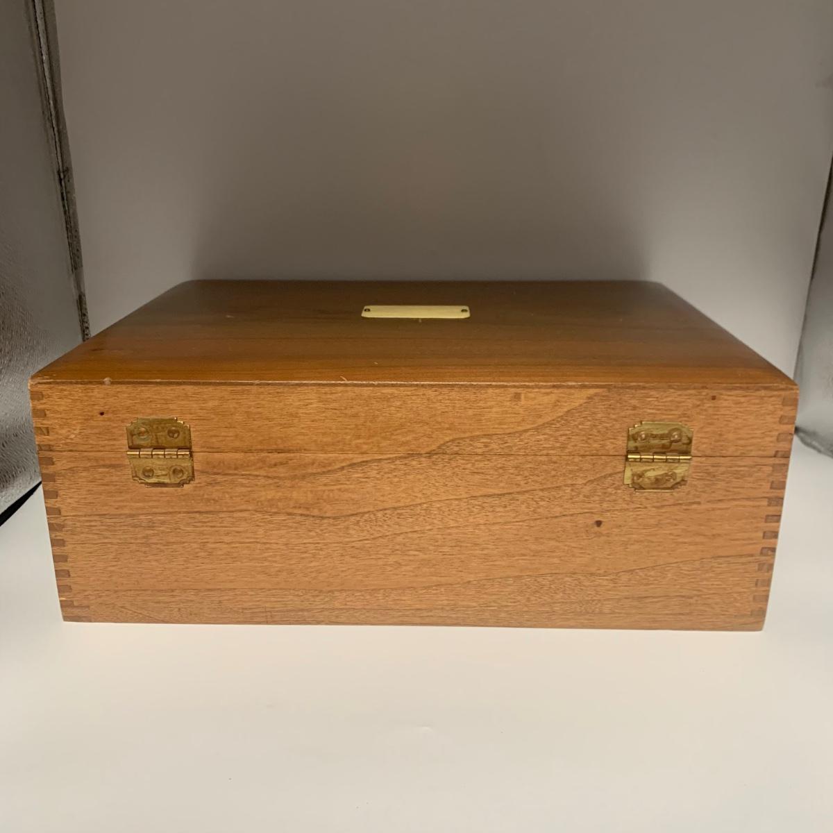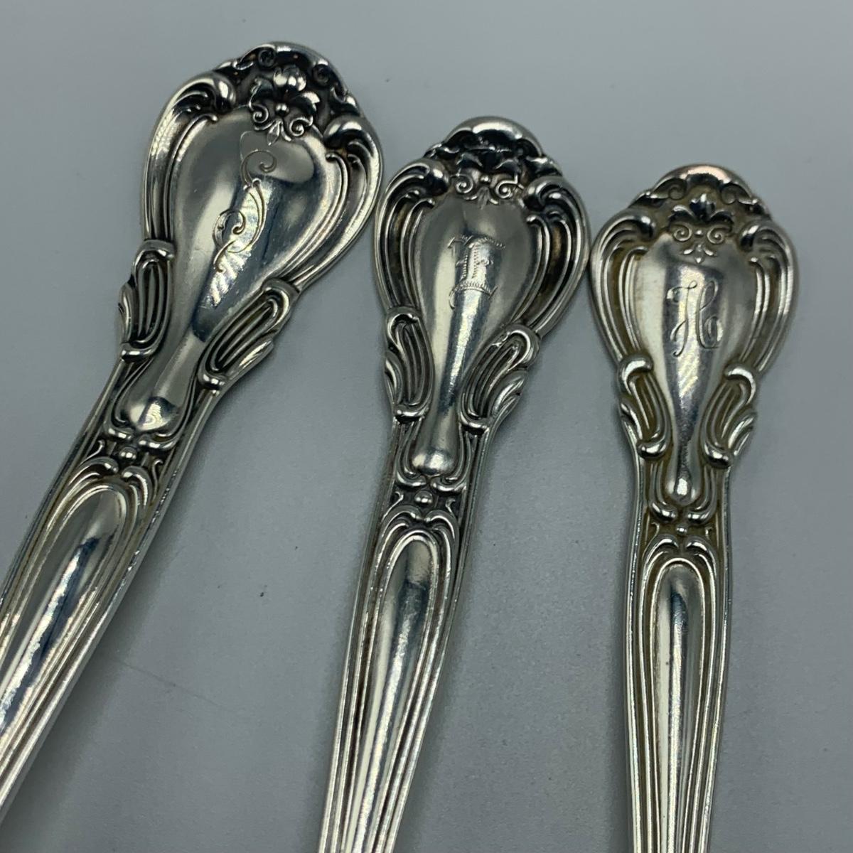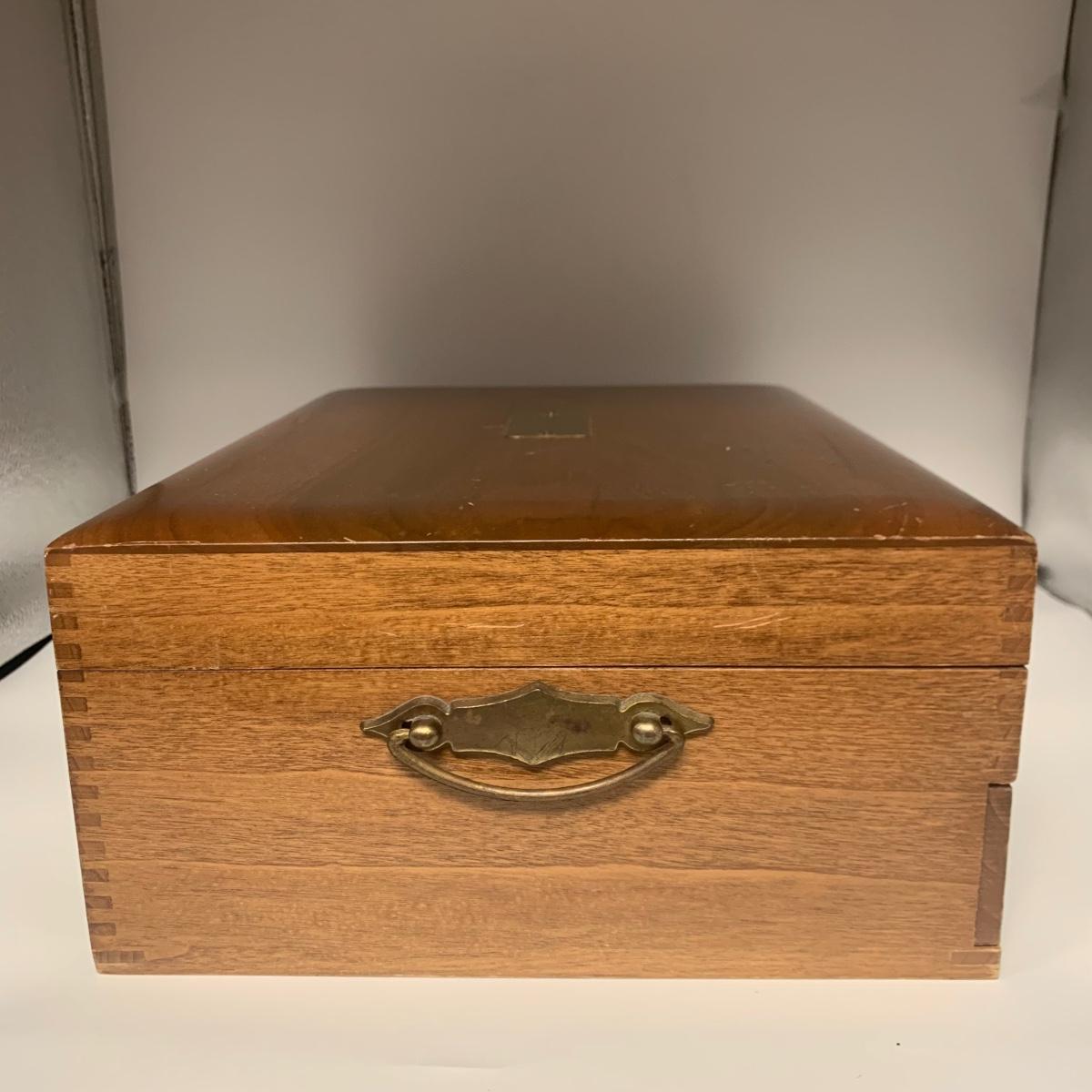 Gorham Sterling silver flatware set in their Chantilly pattern. A complete eight piece set for eight people with many extras, plus four serving spoons. The set includes three sizes of forks, three sizes of spoons (four if you include the serving spoons), butter knives, and two sizes of dinner knives. Approximately 105 pieces total plus a solid wood Naken’s Tarnish Proof Silverware Chest. Chest has brass-like metal hardware and measures 15” x 11.25” x 5.75”H. Some of the silver pieces are engraved with various initials. Starting bid is ant or near melt value. All sales are final. No returns or refunds. Please bid accordingly.