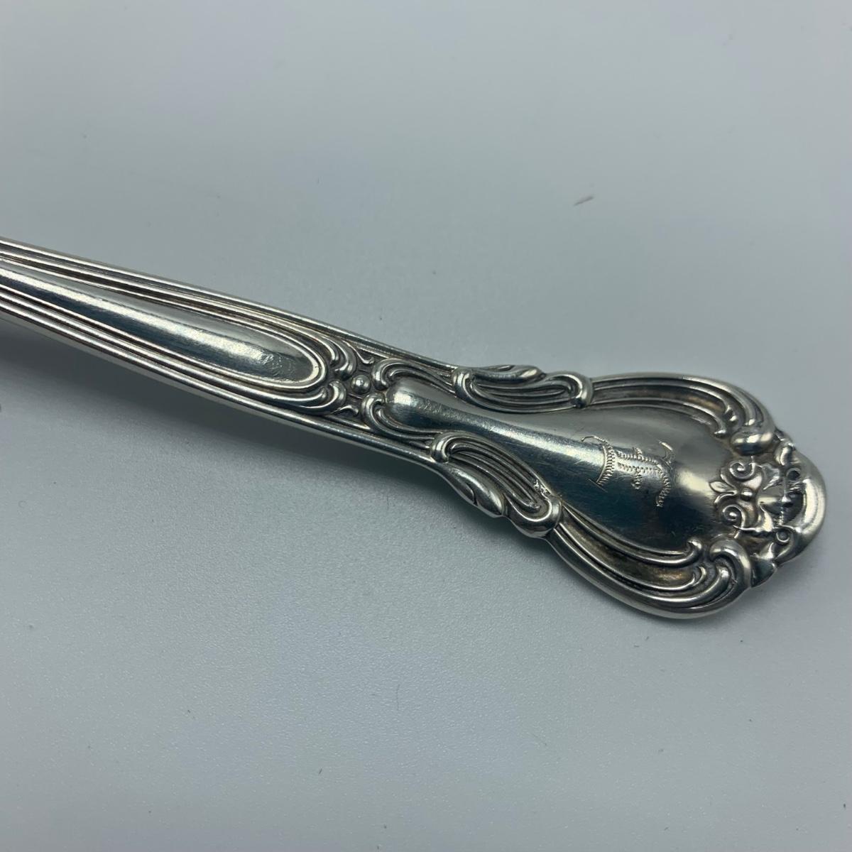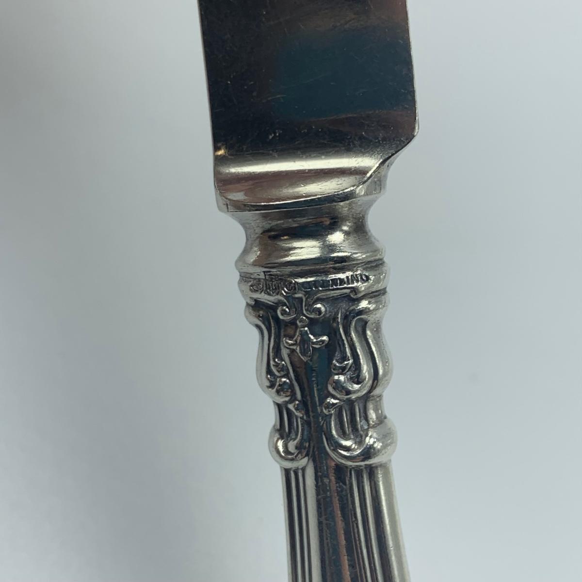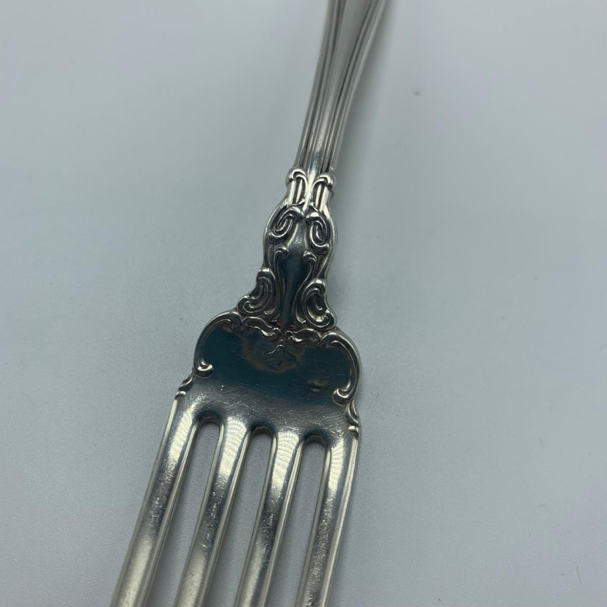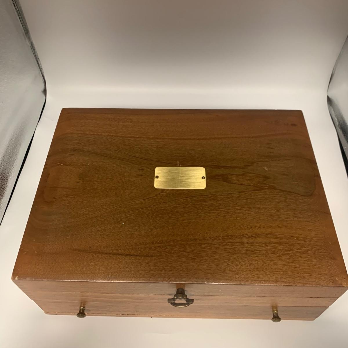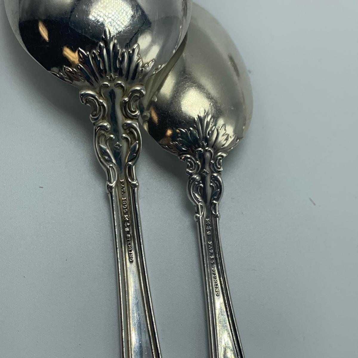 Gorham Sterling silver flatware set in their Chantilly pattern. A complete eight piece set for eight people with many extras, plus four serving spoons. The set includes three sizes of forks, three sizes of spoons (four if you include the serving spoons), butter knives, and two sizes of dinner knives. Approximately 105 pieces total plus a solid wood Naken’s Tarnish Proof Silverware Chest. Chest has brass-like metal hardware and measures 15” x 11.25” x 5.75”H. Some of the silver pieces are engraved with various initials. Starting bid is ant or near melt value. All sales are final. No returns or refunds. Please bid accordingly.