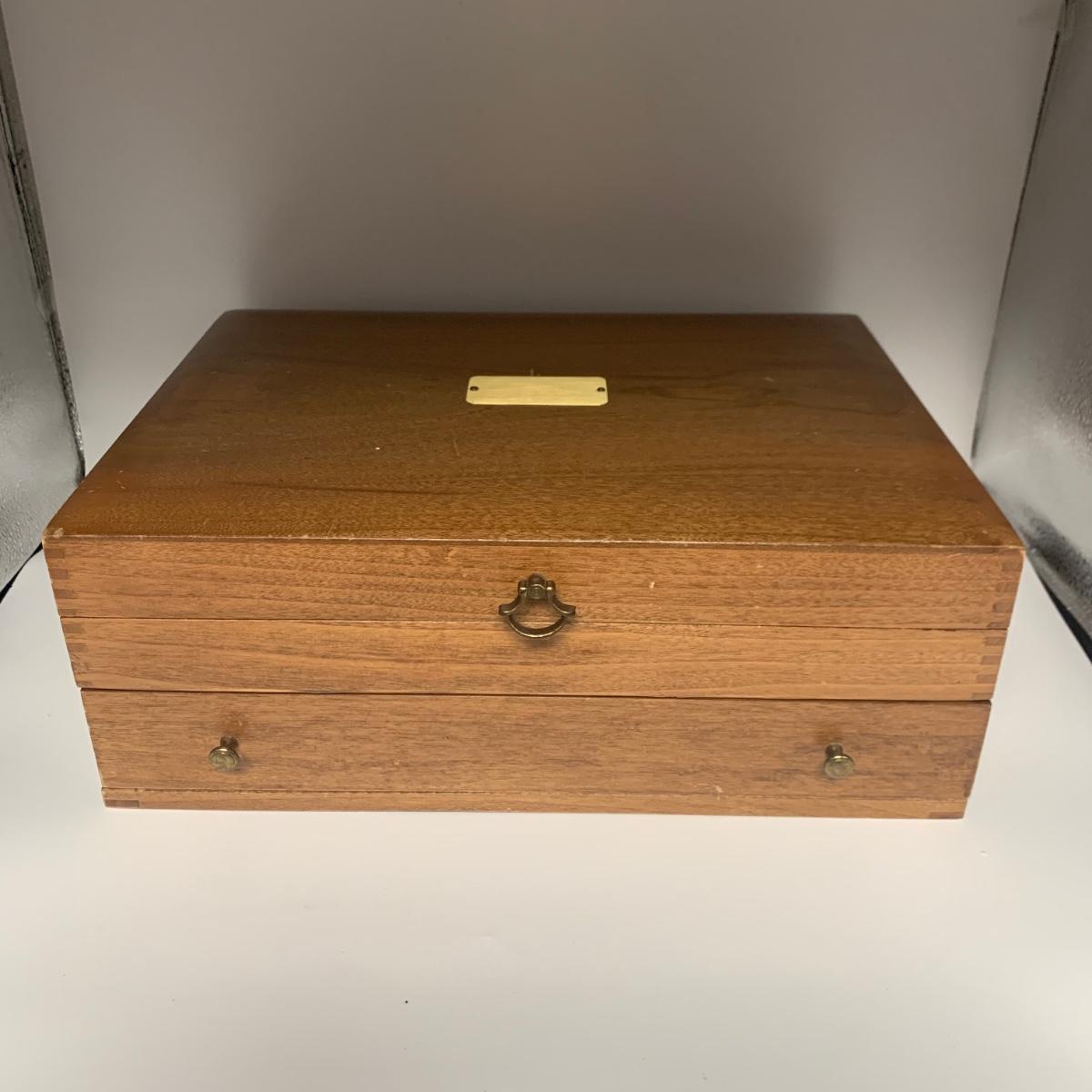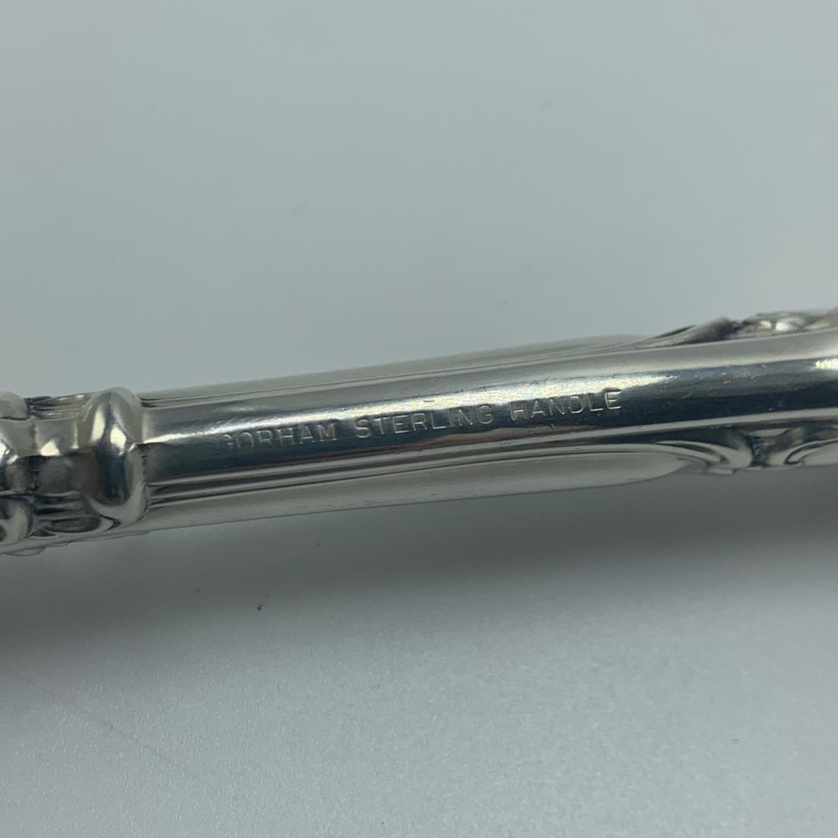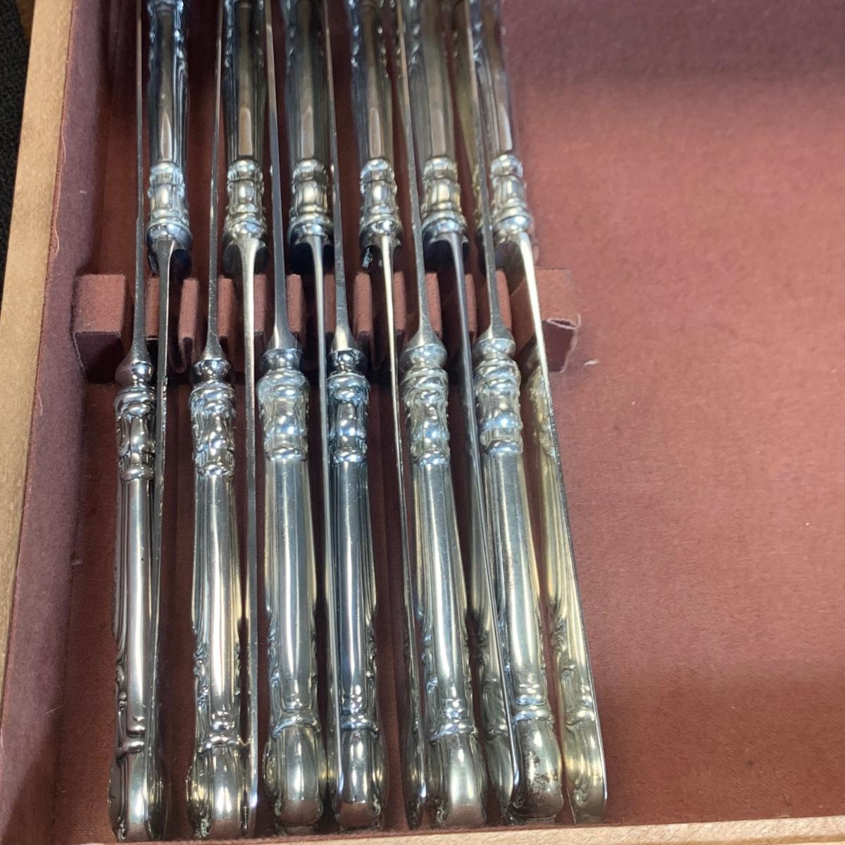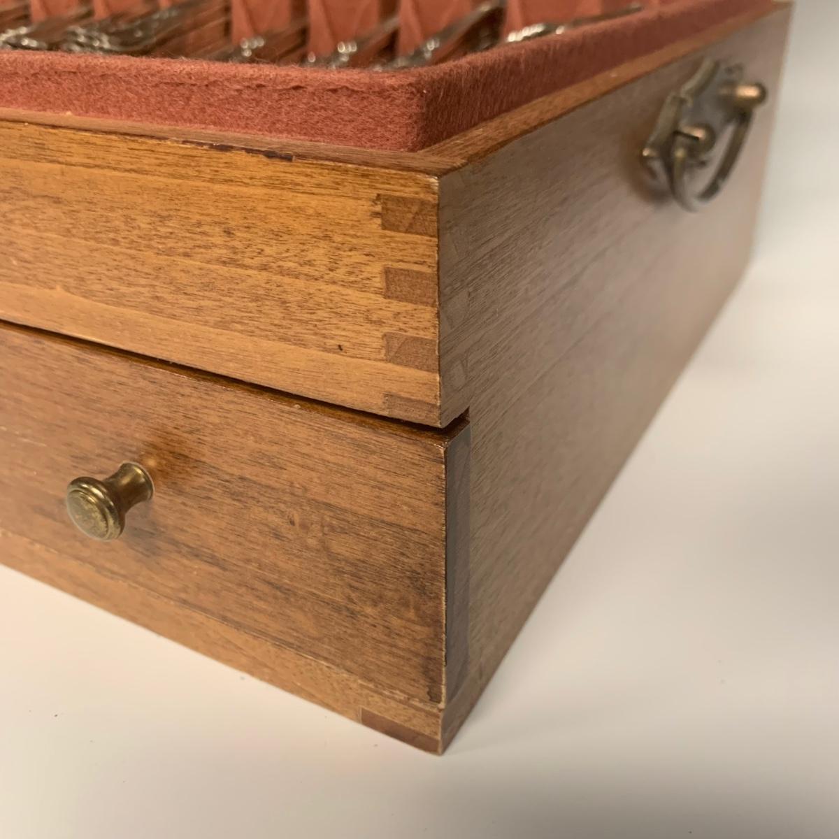 Gorham Sterling silver flatware set in their Chantilly pattern. A complete eight piece set for eight people with many extras, plus four serving spoons. The set includes three sizes of forks, three sizes of spoons (four if you include the serving spoons), butter knives, and two sizes of dinner knives. Approximately 105 pieces total plus a solid wood Naken’s Tarnish Proof Silverware Chest. Chest has brass-like metal hardware and measures 15” x 11.25” x 5.75”H. Some of the silver pieces are engraved with various initials. Starting bid is ant or near melt value. All sales are final. No returns or refunds. Please bid accordingly.