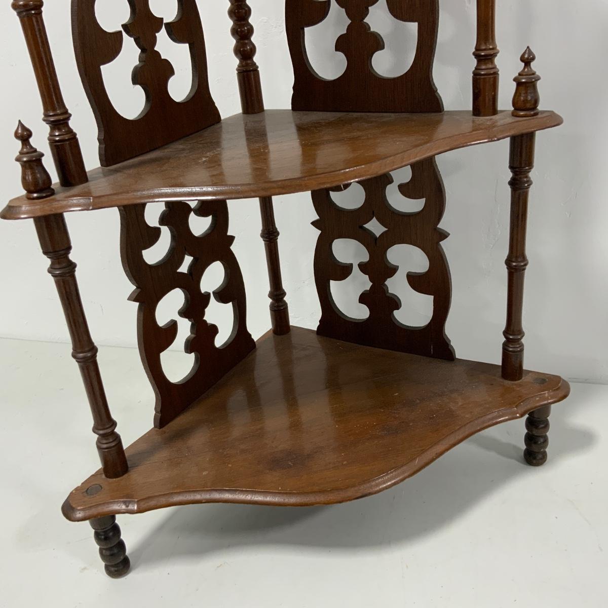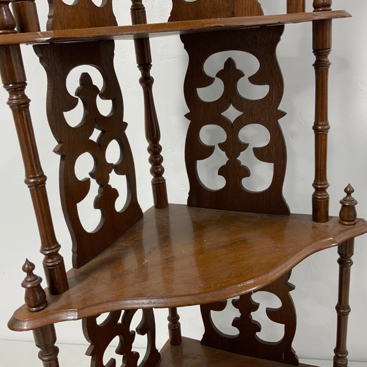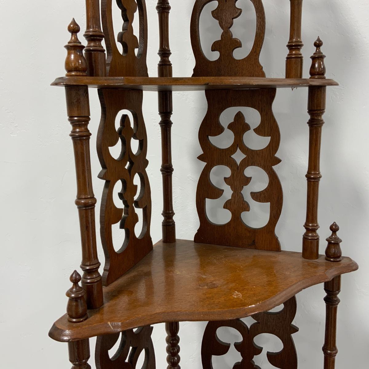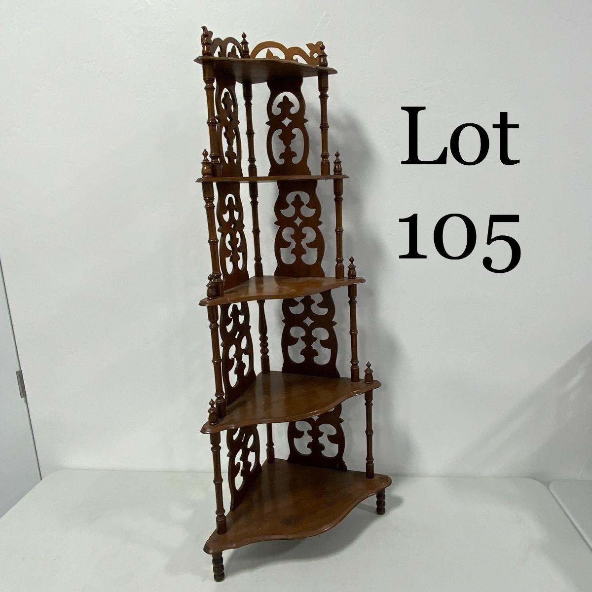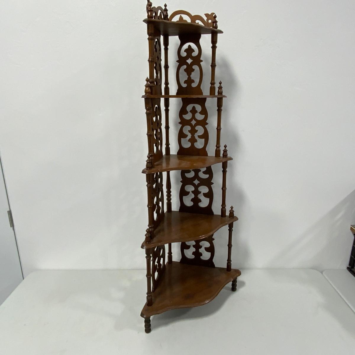 Beautiful Walnut Corner Shelf or “What Not Shelf”. A perfect place to put all your collectibles. Shelf measures 57” tall. Bottom shelf is 17” deep on either side. Please see photos for details and condition. ::: Shipping is NOT available on this lot. If you have any questions regarding this lot please contact the auctioneer either via this website, by direct email or by phone. PICK UP TIMES and other important information can be found in the TERMS and DESCRIPTION of the auction. Please take a look for pertinent information. Thanks!