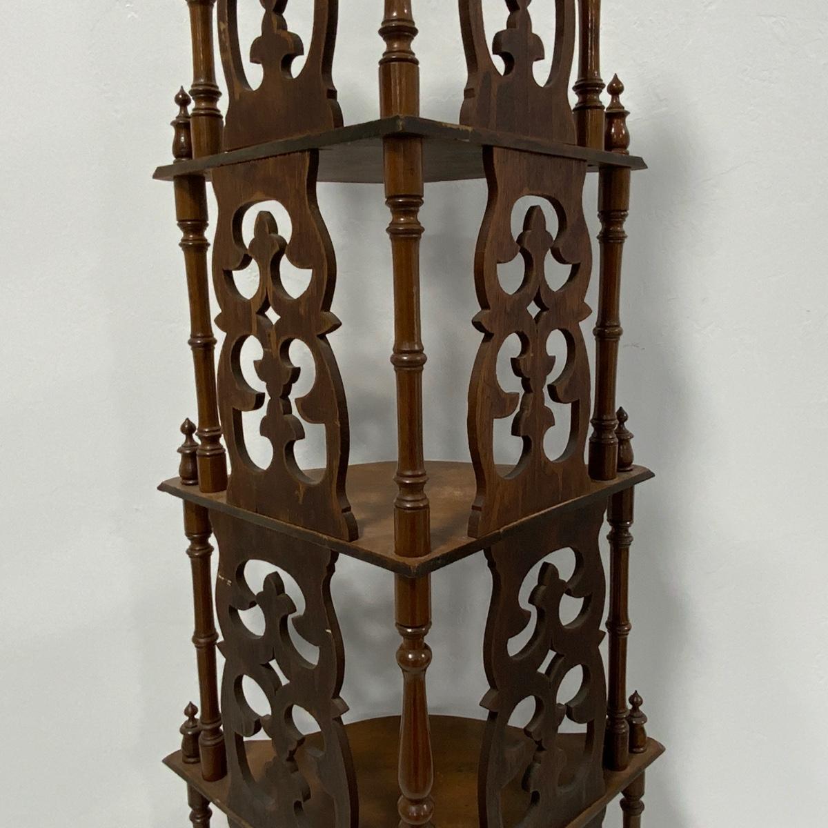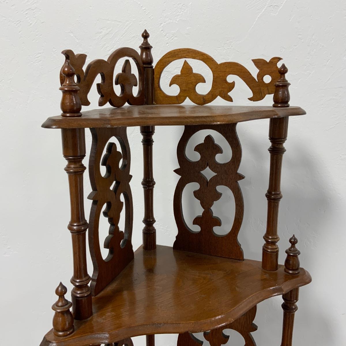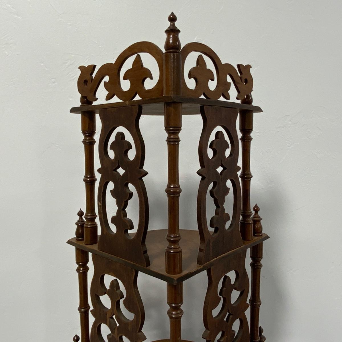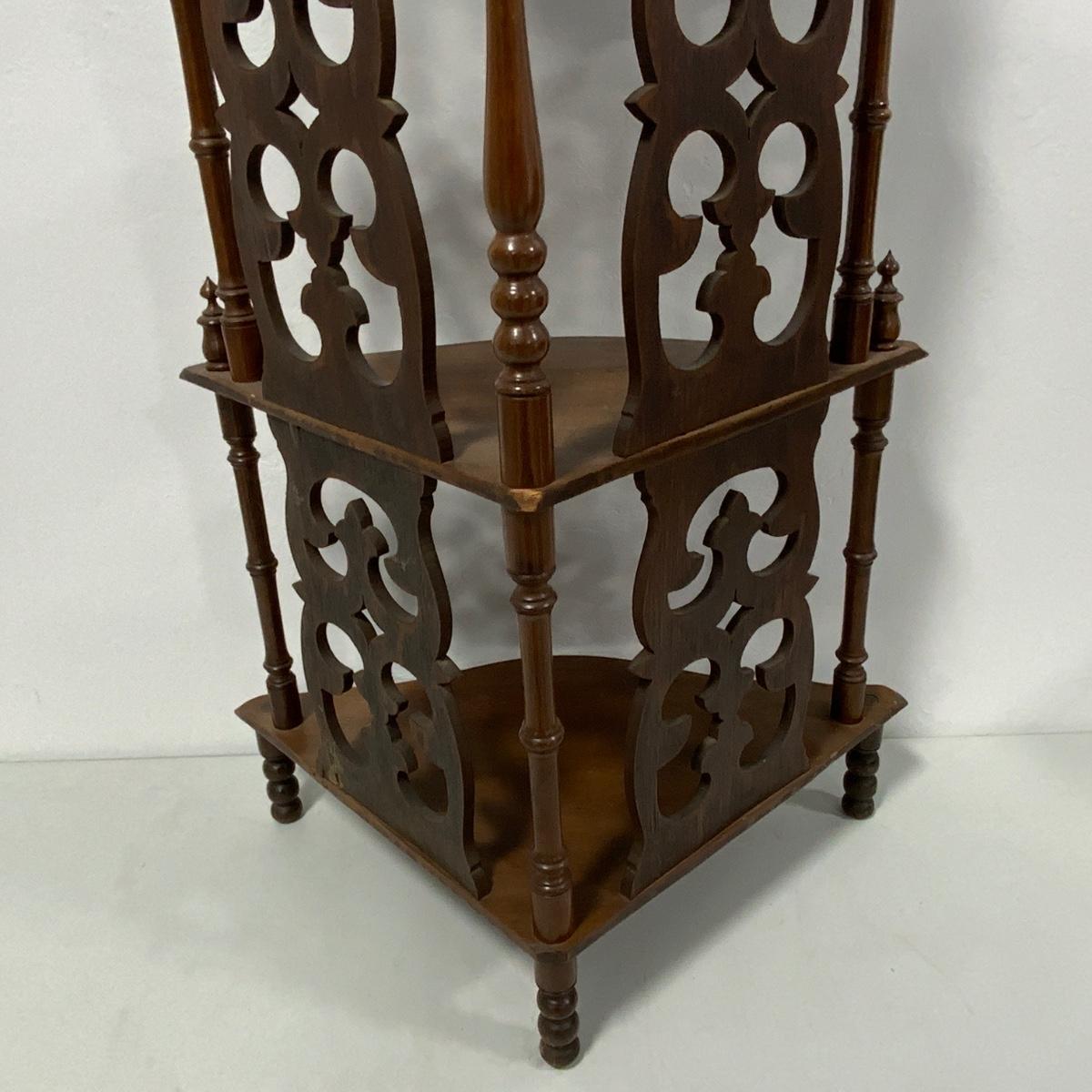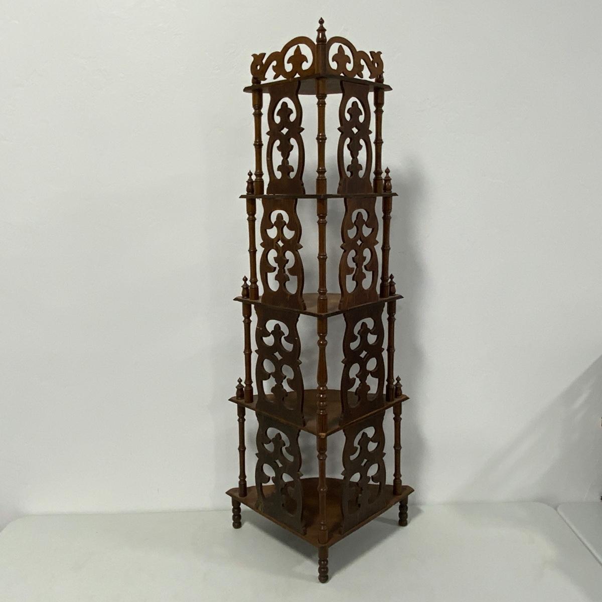 Beautiful Walnut Corner Shelf or “What Not Shelf”. A perfect place to put all your collectibles. Shelf measures 57” tall. Bottom shelf is 17” deep on either side. Please see photos for details and condition. ::: Shipping is NOT available on this lot. If you have any questions regarding this lot please contact the auctioneer either via this website, by direct email or by phone. PICK UP TIMES and other important information can be found in the TERMS and DESCRIPTION of the auction. Please take a look for pertinent information. Thanks!