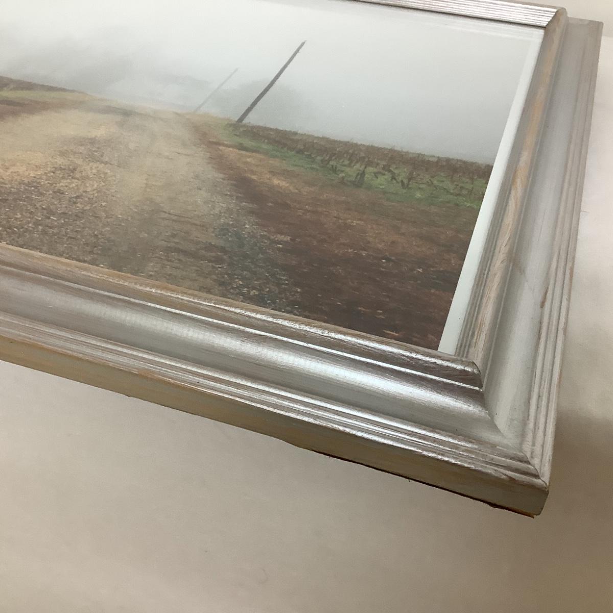 The framed photograph of the hidden house is in a silver wash frame and measures 22.5"w x 19"h.