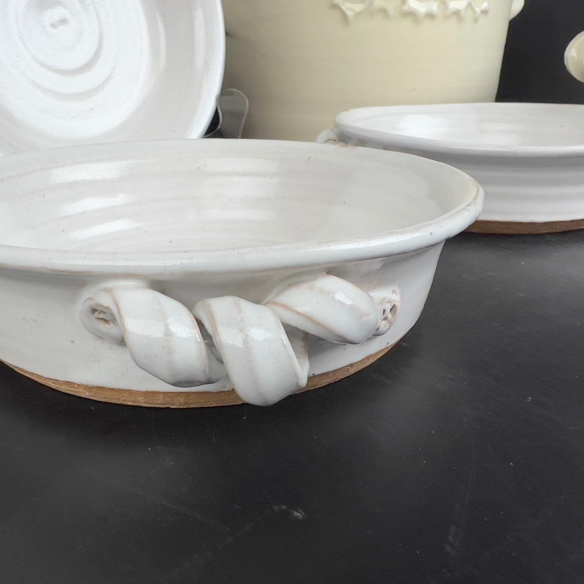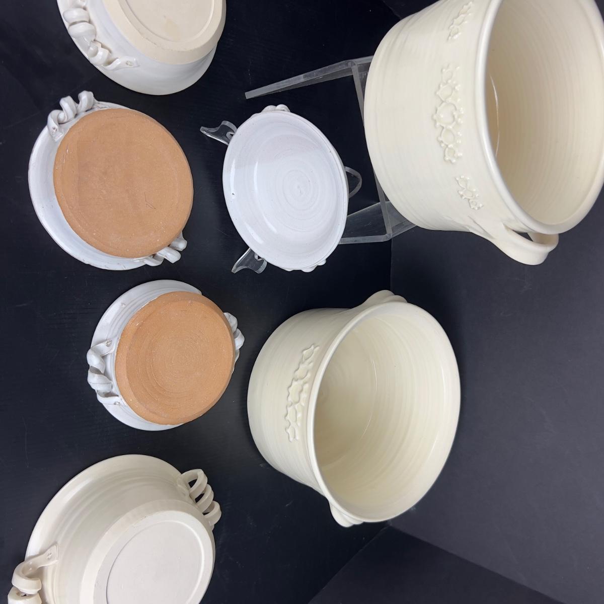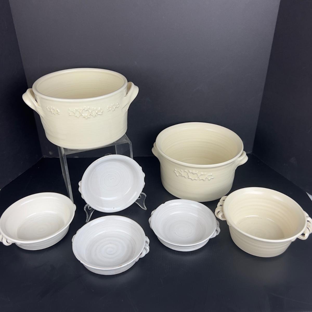 Two large bowls measure 8” diameter x 5” high, med bowl with twist handles 6.25” x 3” high , smaller bowl with twist handles 6” x 2” high , small three bowls (1- has chip) measure 5.25” diameter x 1.25”