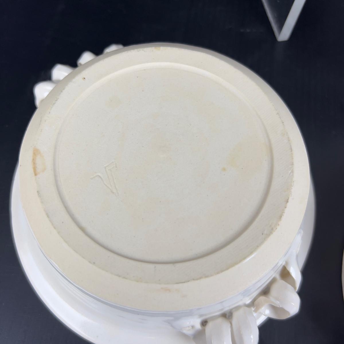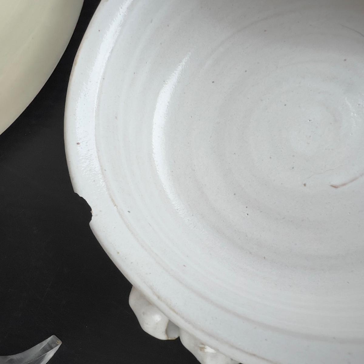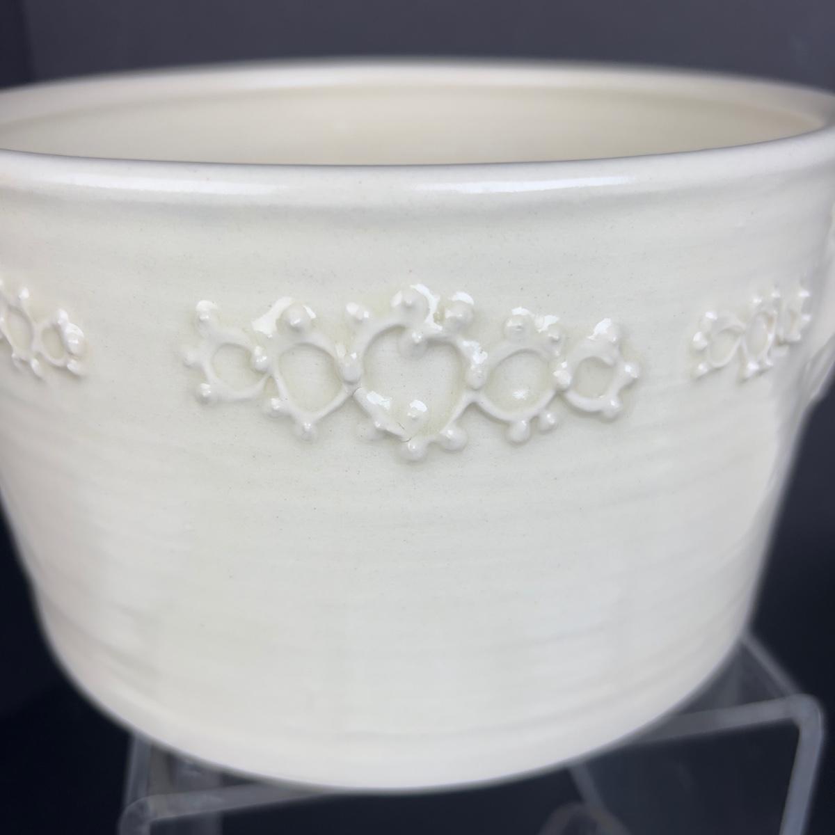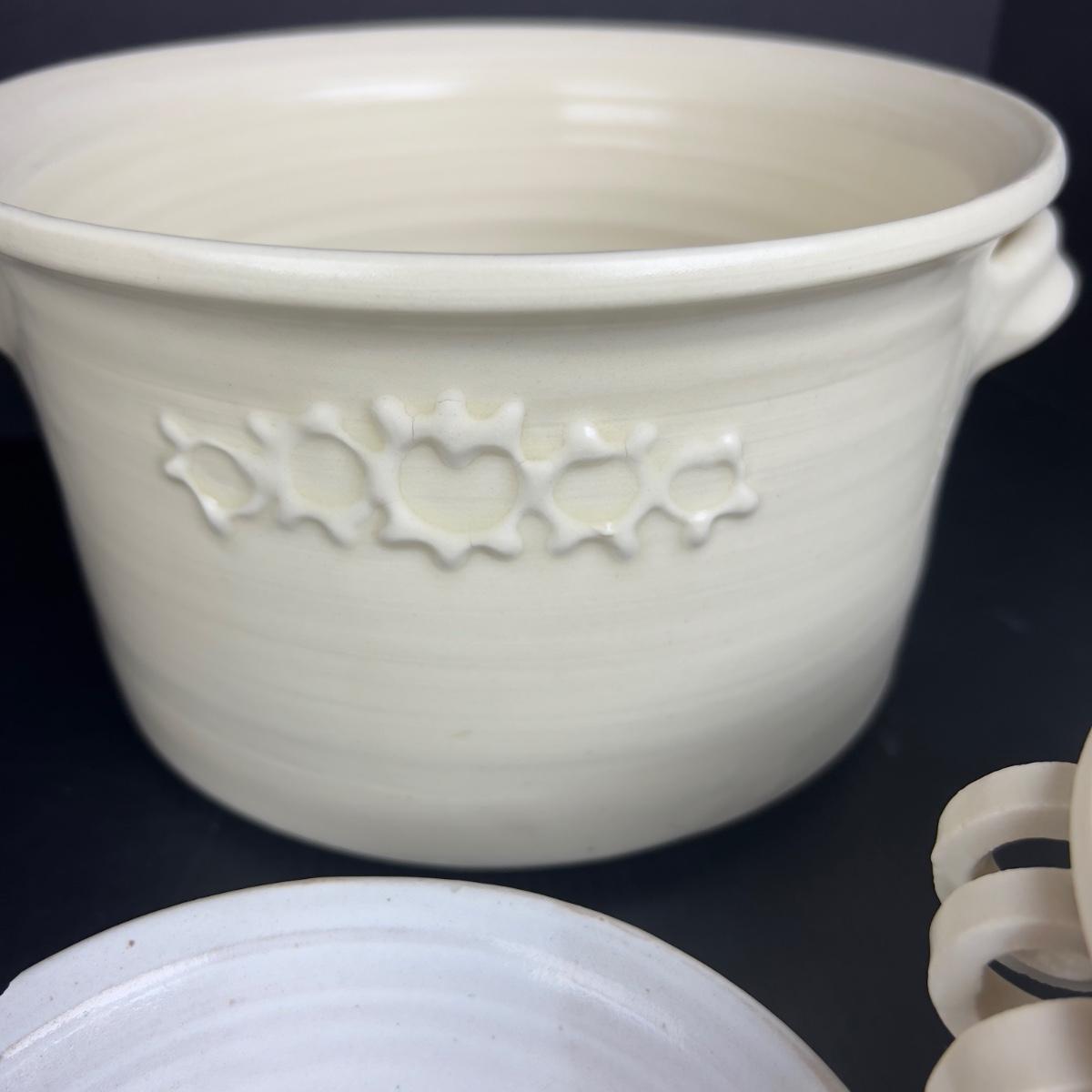 Two large bowls measure 8” diameter x 5” high, med bowl with twist handles 6.25” x 3” high , smaller bowl with twist handles 6” x 2” high , small three bowls (1- has chip) measure 5.25” diameter x 1.25”