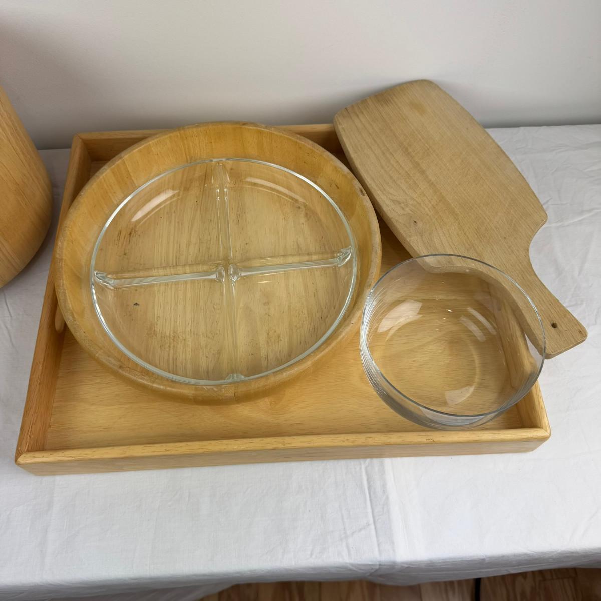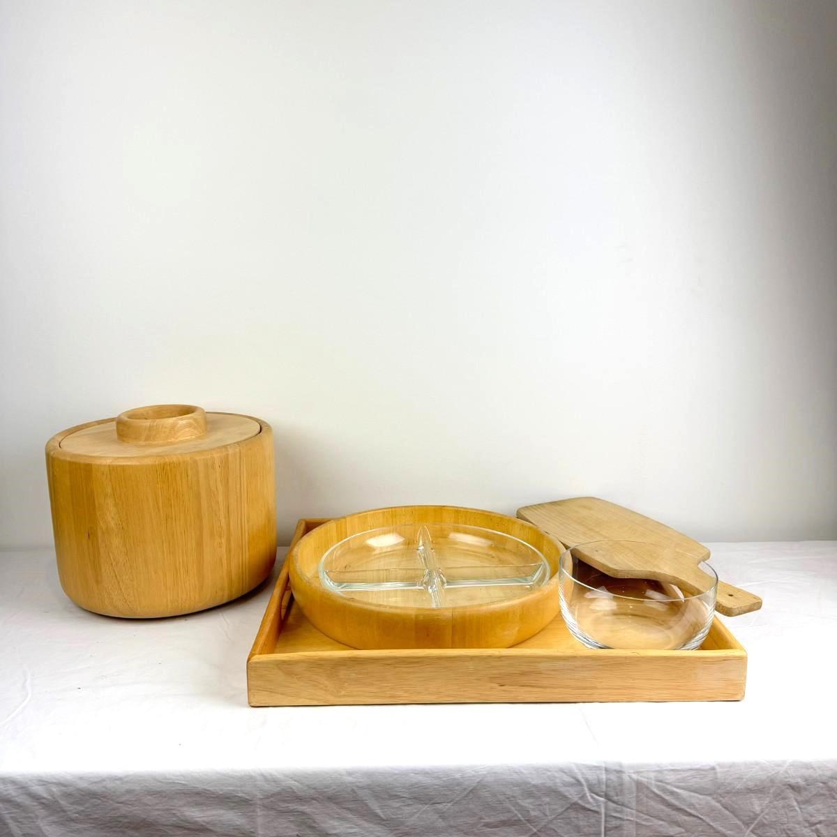 1053 Dansk Wooden Ice Bucket Tray, Cheese Board, Glass Serving Plate