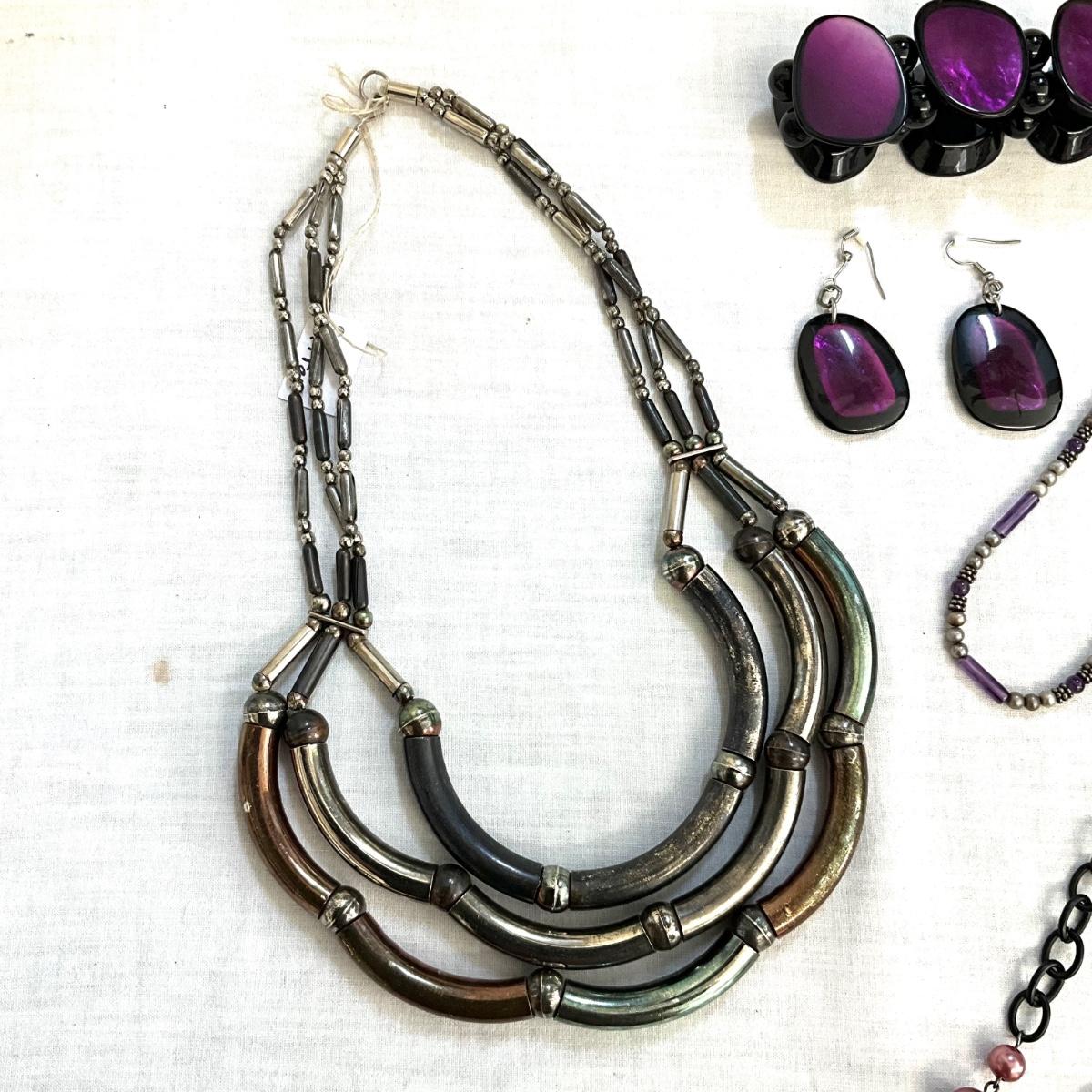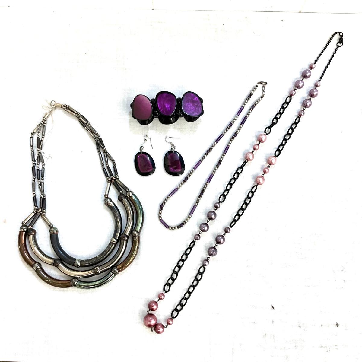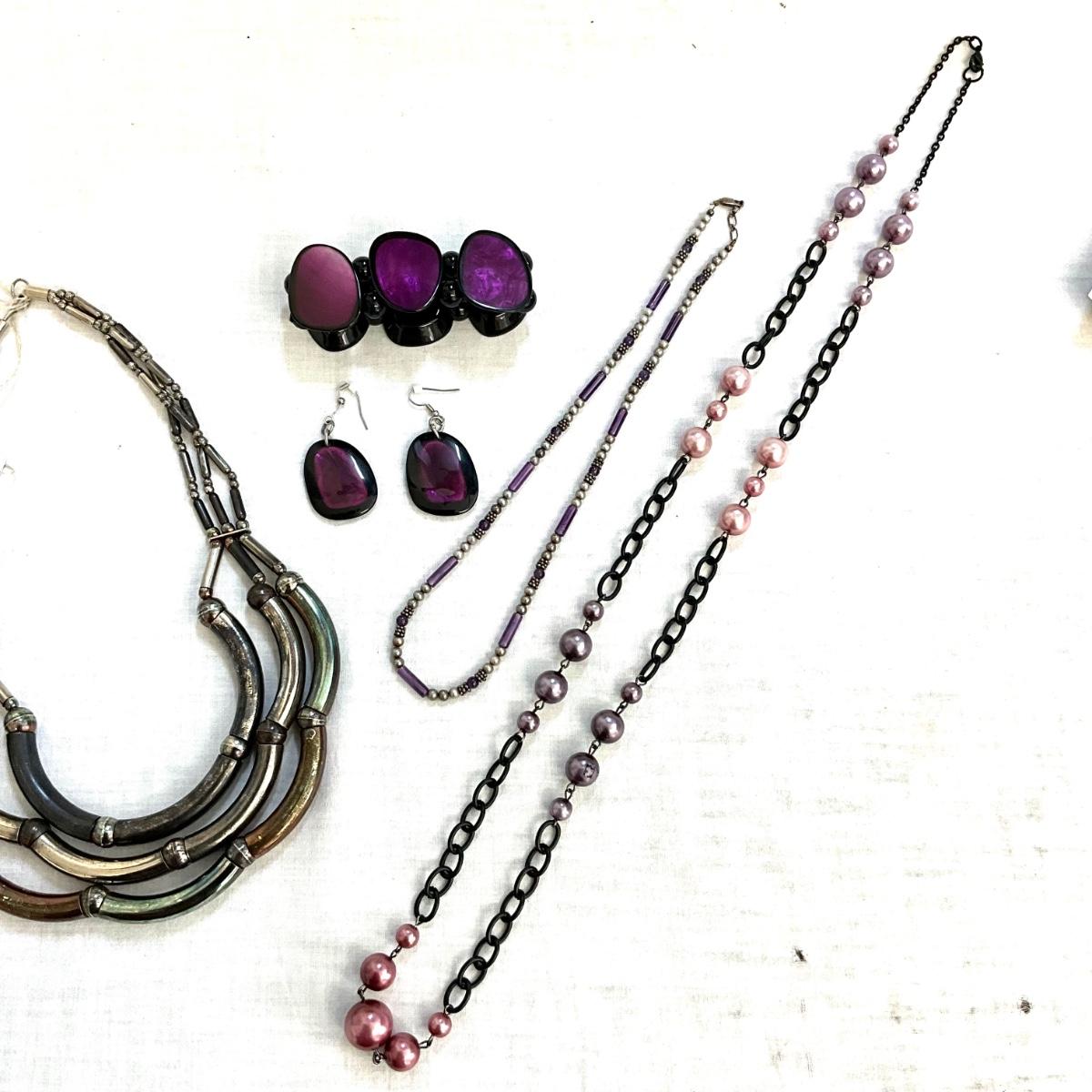 Measuring 20", 18" and 36" in length, purple bracelet is stretch and earrings are pierced