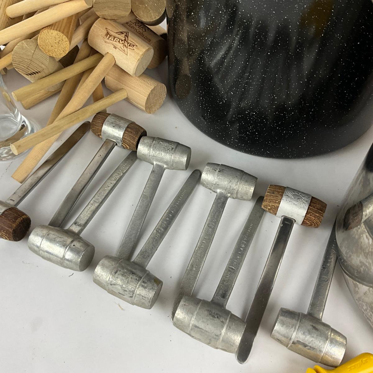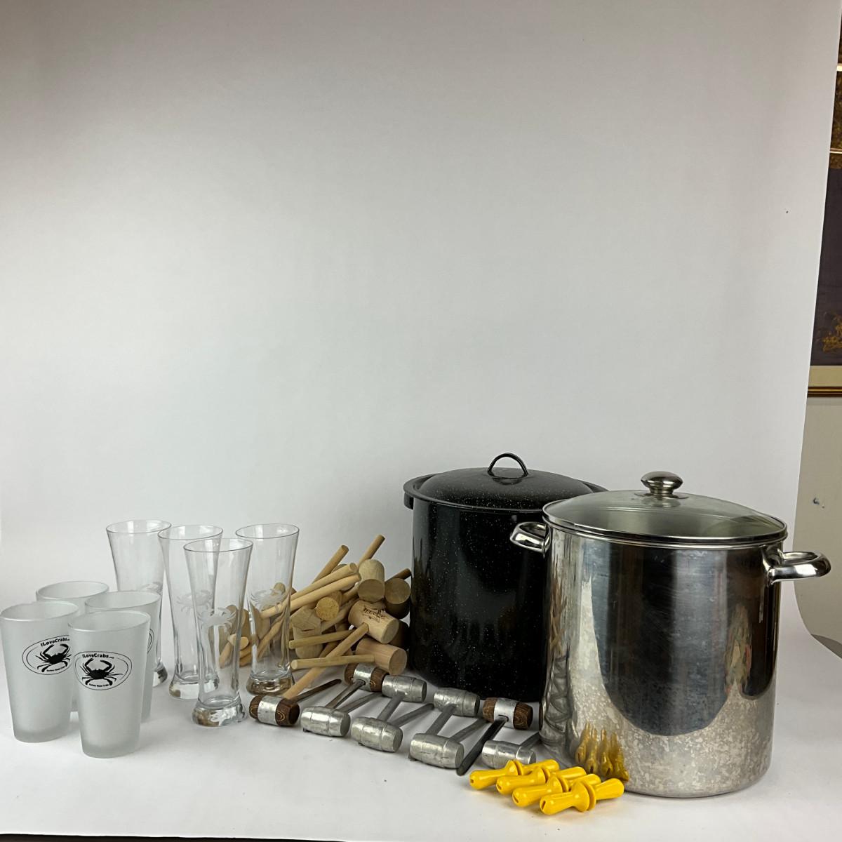 Steamer Crab Mallets (Pewter & Wooden), Corn Stock Pot With Corn Holders, Four Crab Etched Glasses With Four "I Love Crab" Glasses