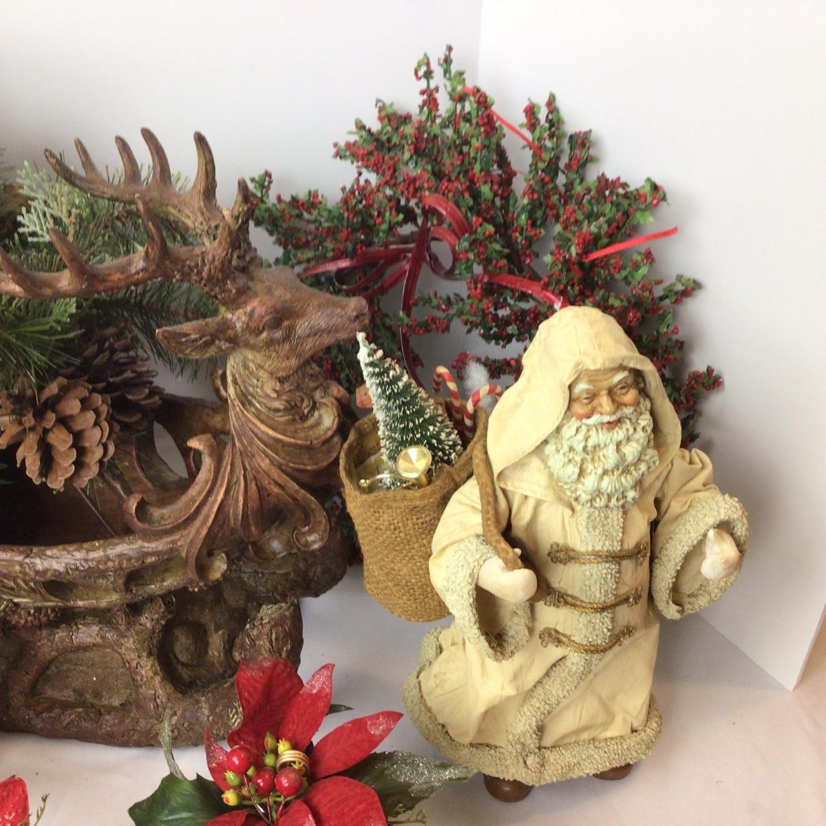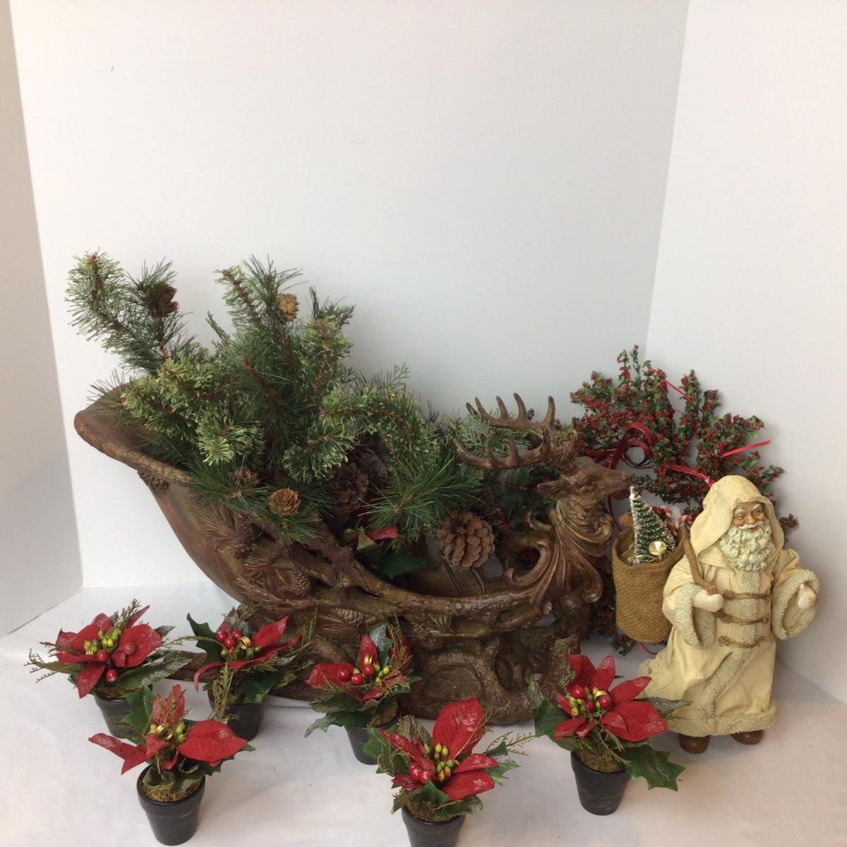 The lot contains a sled with greenery, santa, 8 small poinsettia place card holders.