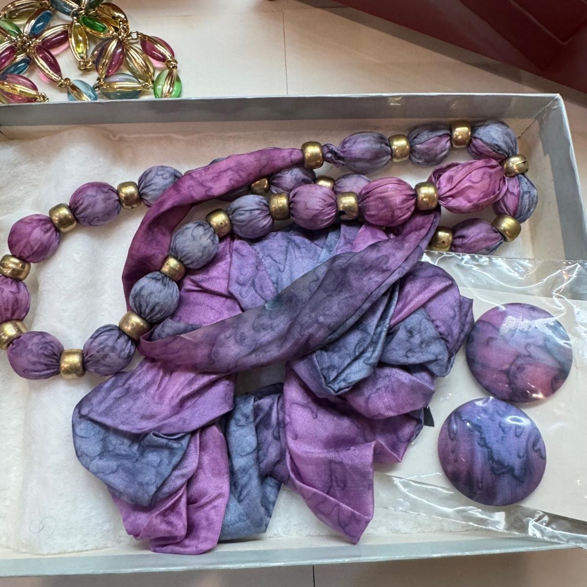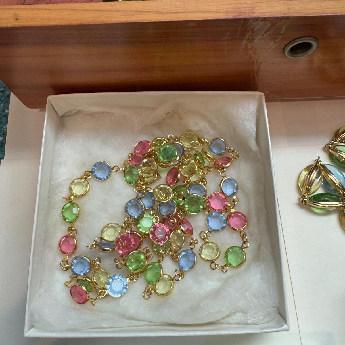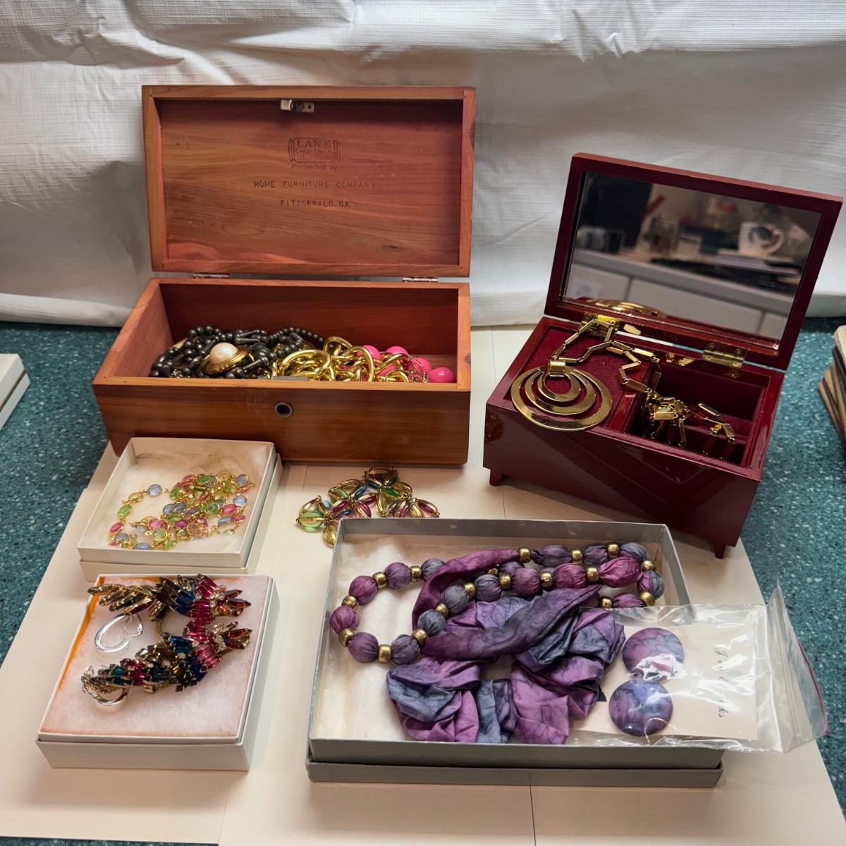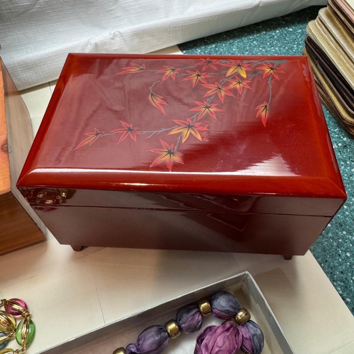 Large lot of costume jewelry with cedar Lane jewelry box and lacquer music box with silk necklace Set a much more
