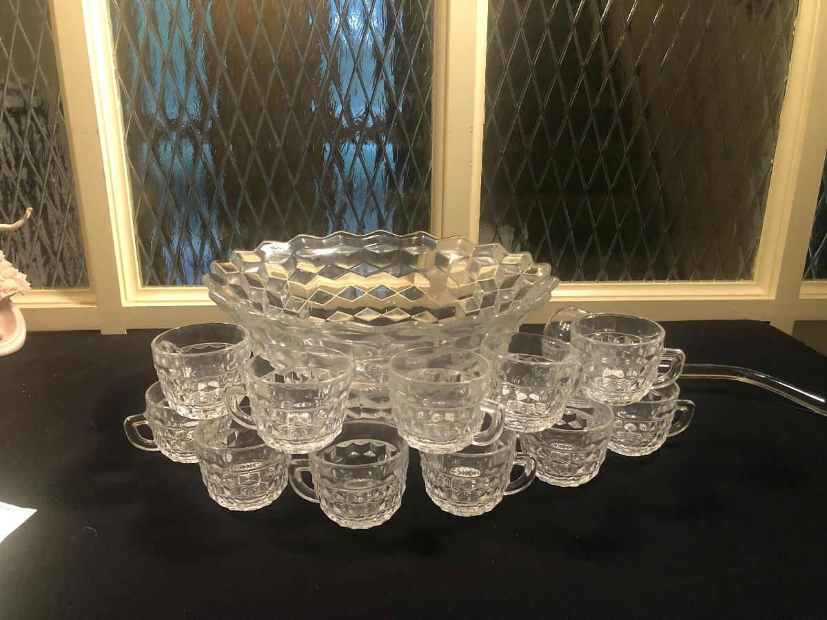 #106 Diamond point style Punch bowl with 12 cups and serving spoon