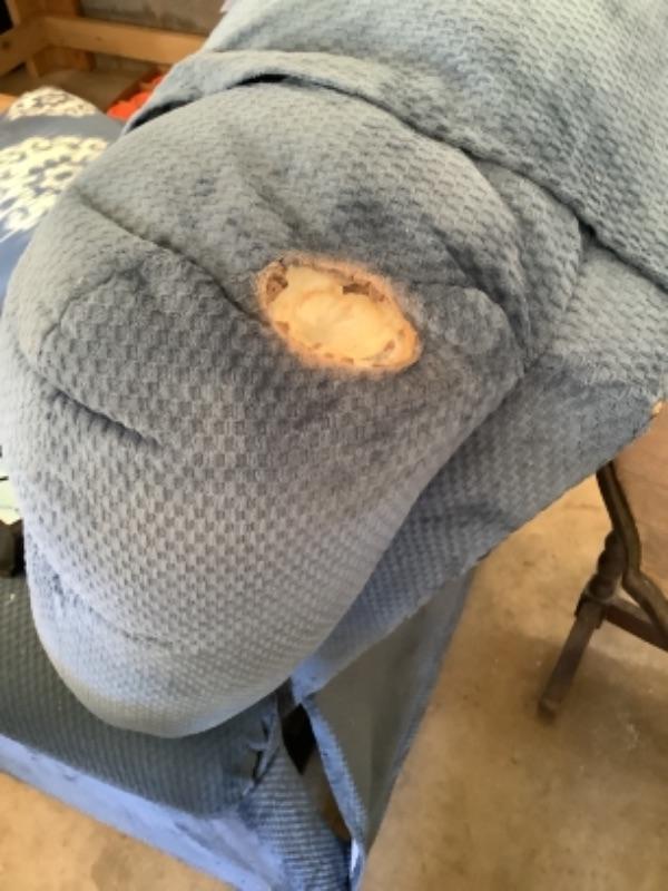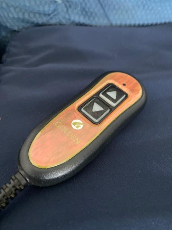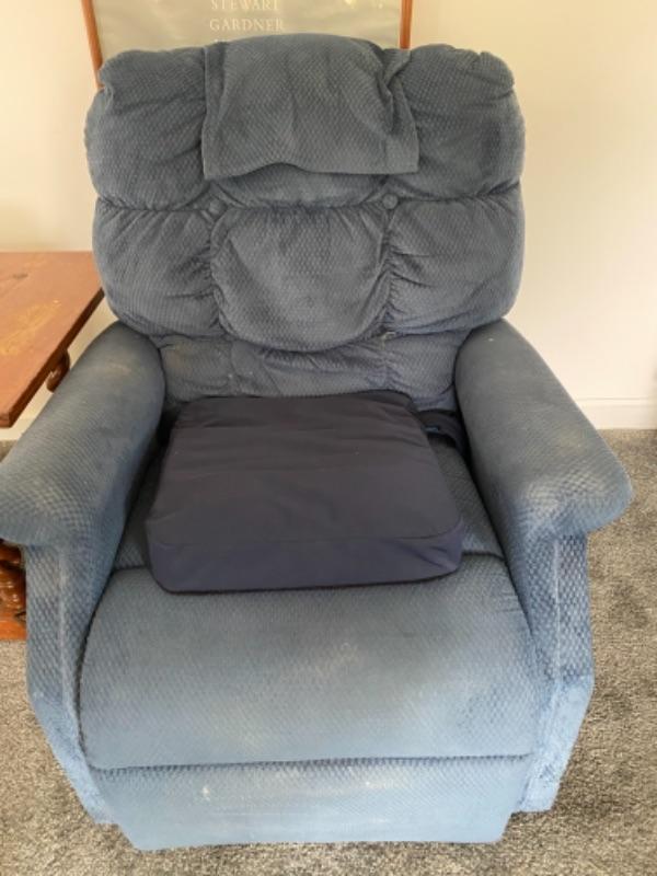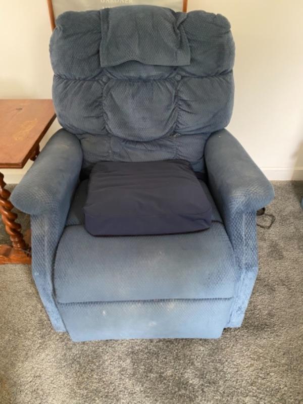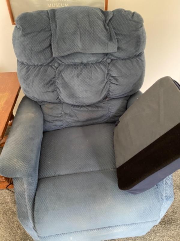 Blue Upholstered Lift Chair by Medacore / Golden Lift approx 10 years old. Has a tear in top corner. Sold as is
