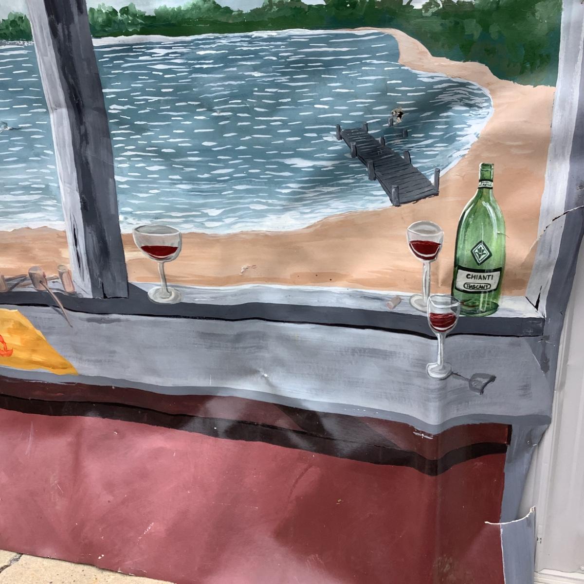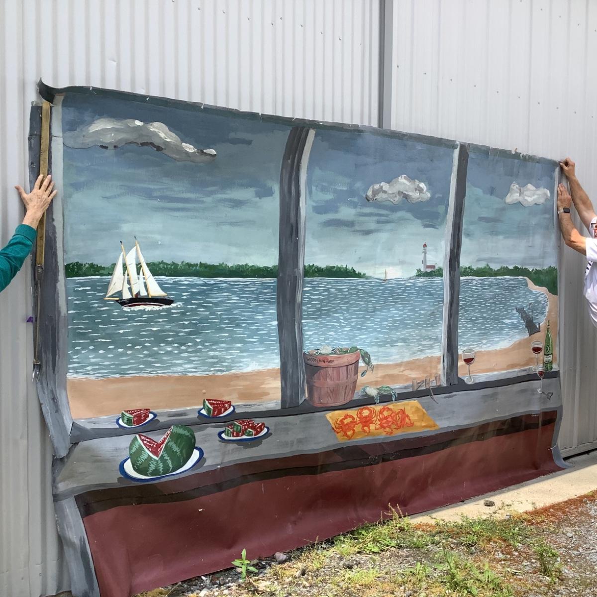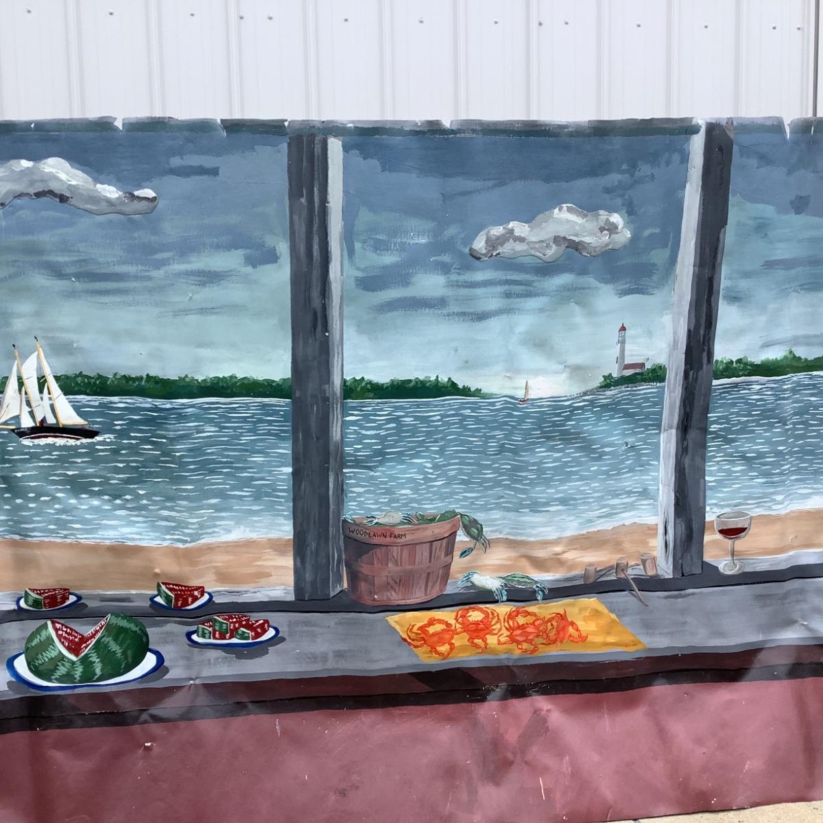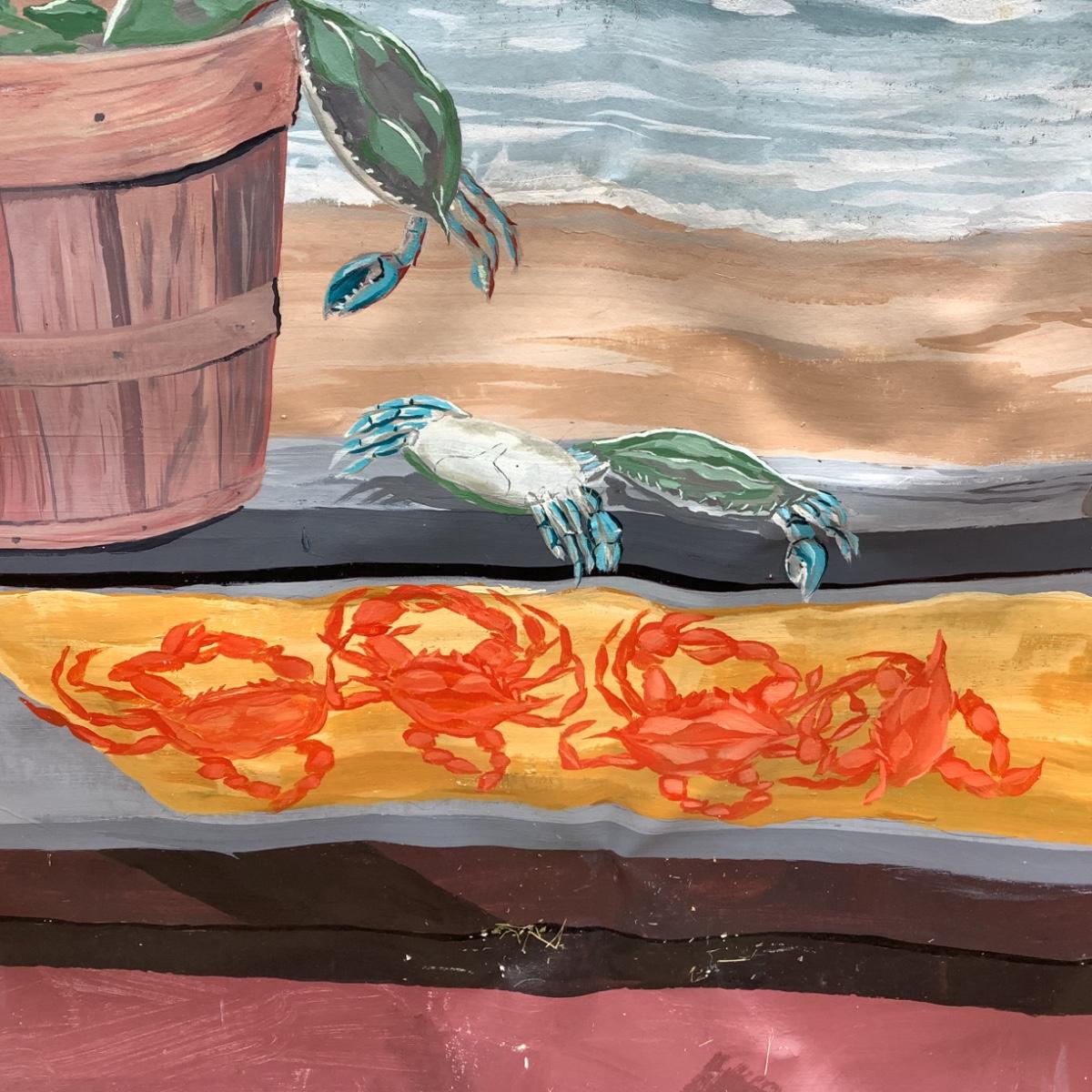 Extra large Eastern Shore artisan hand painted nautical mural on large vinyl flooring that measures 142"w x 86"h. It has been stored rolled up, there are a few tears on the edges and small blemishes throughout. Great decorative piece.