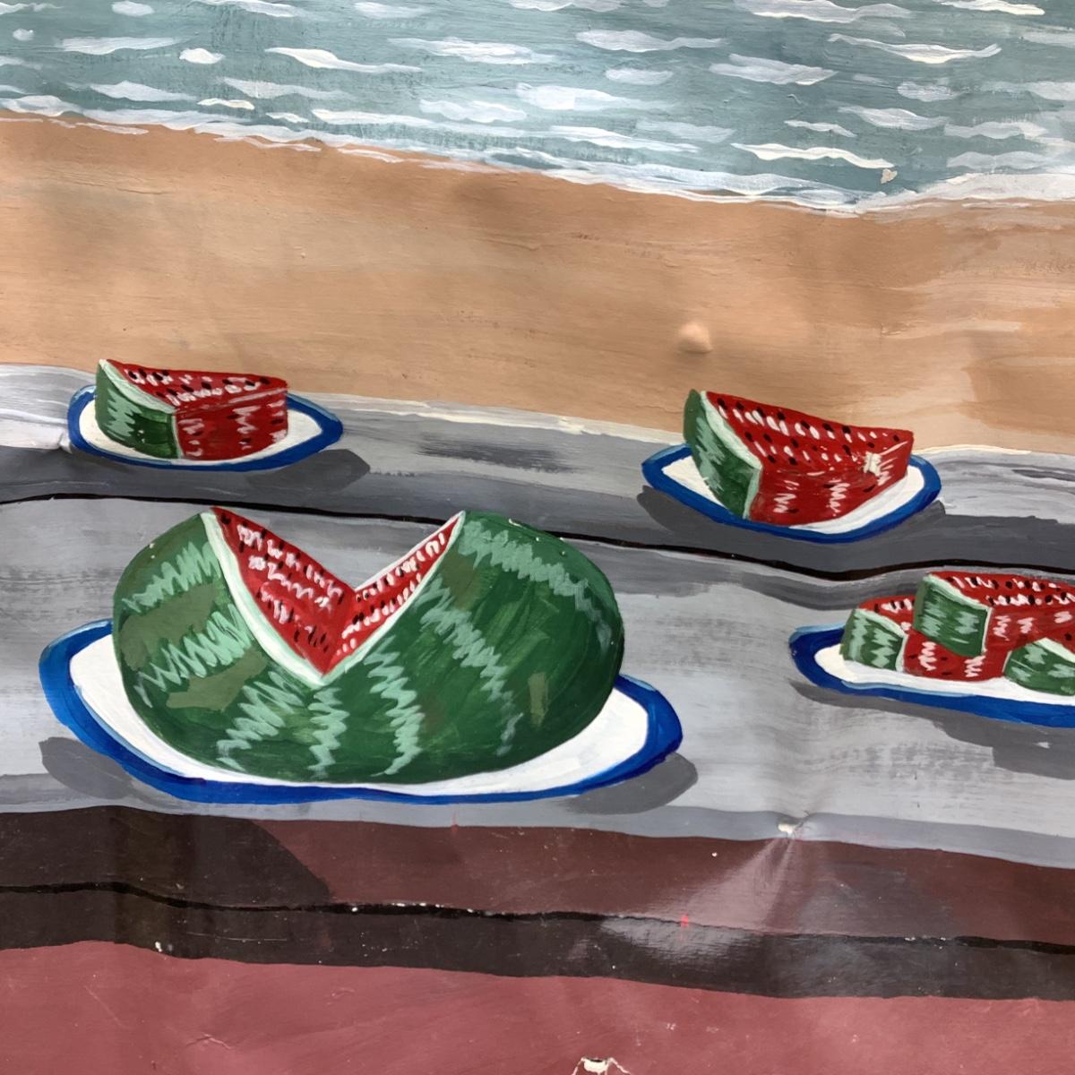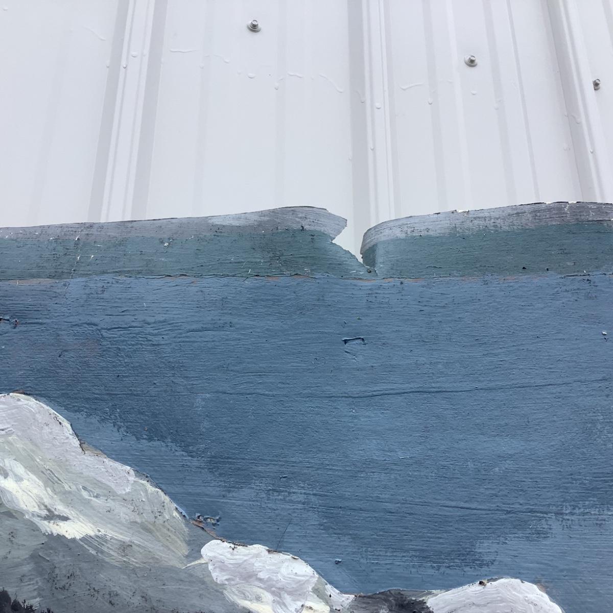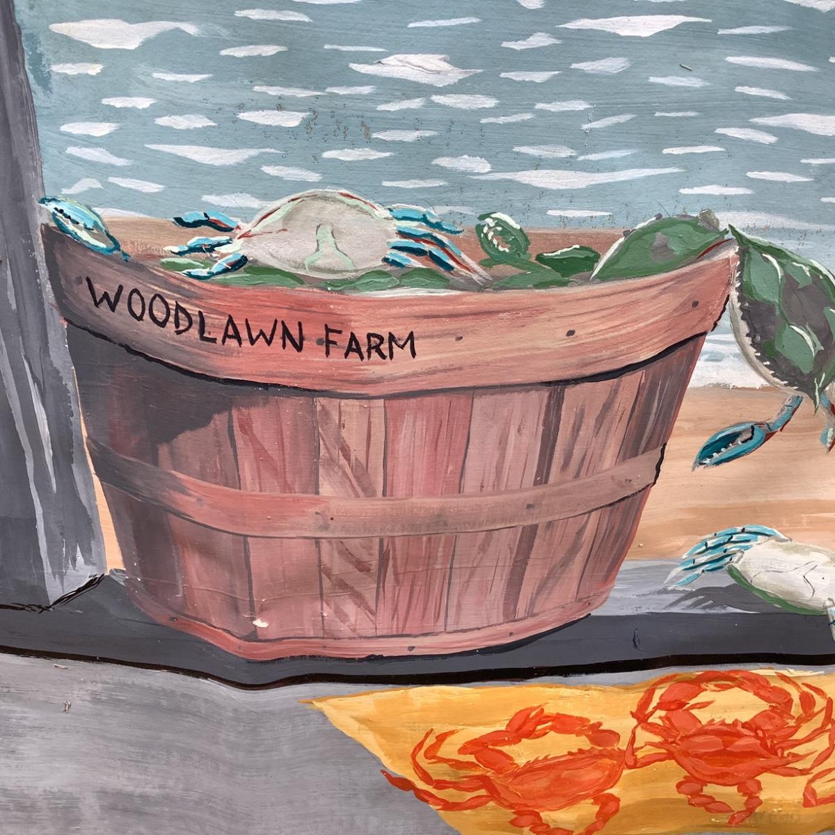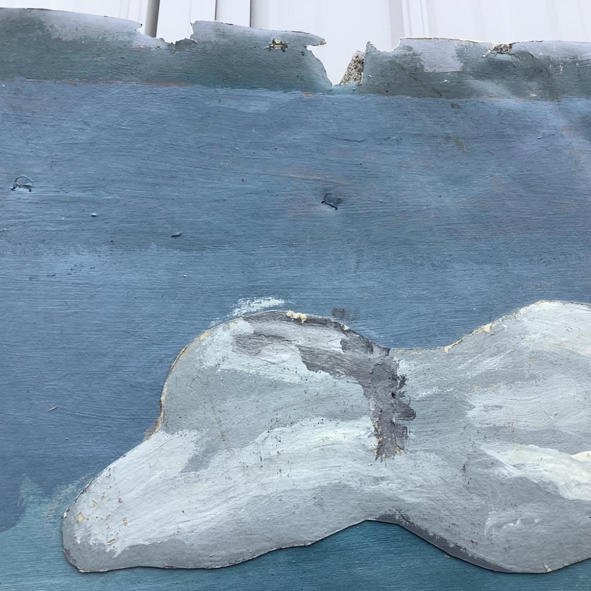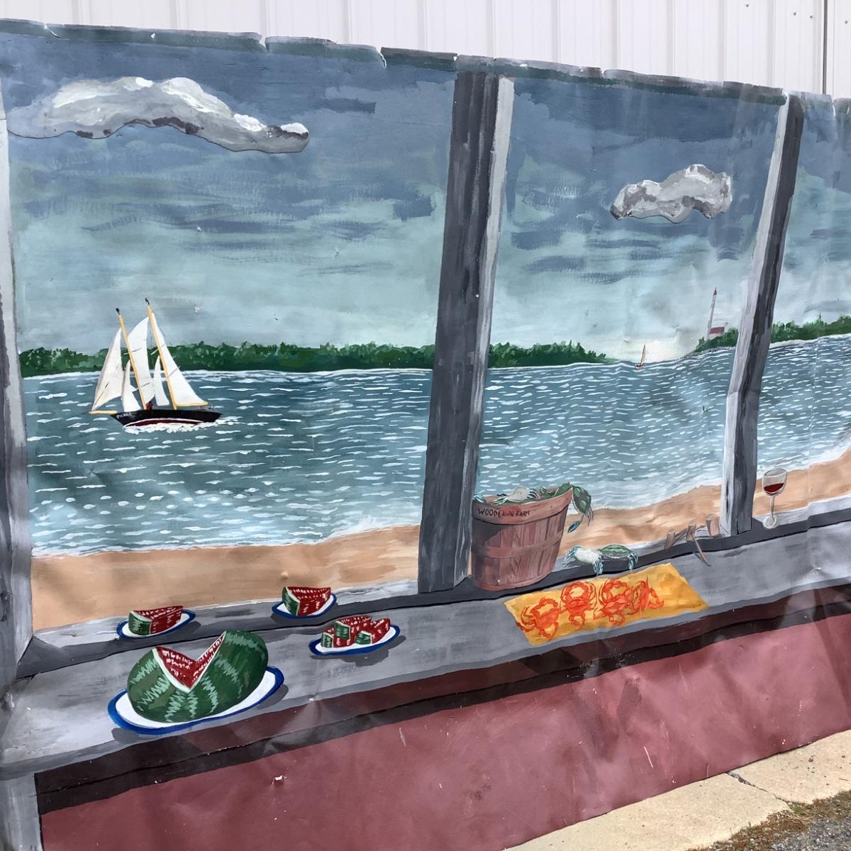 Extra large Eastern Shore artisan hand painted nautical mural on large vinyl flooring that measures 142"w x 86"h. It has been stored rolled up, there are a few tears on the edges and small blemishes throughout. Great decorative piece.