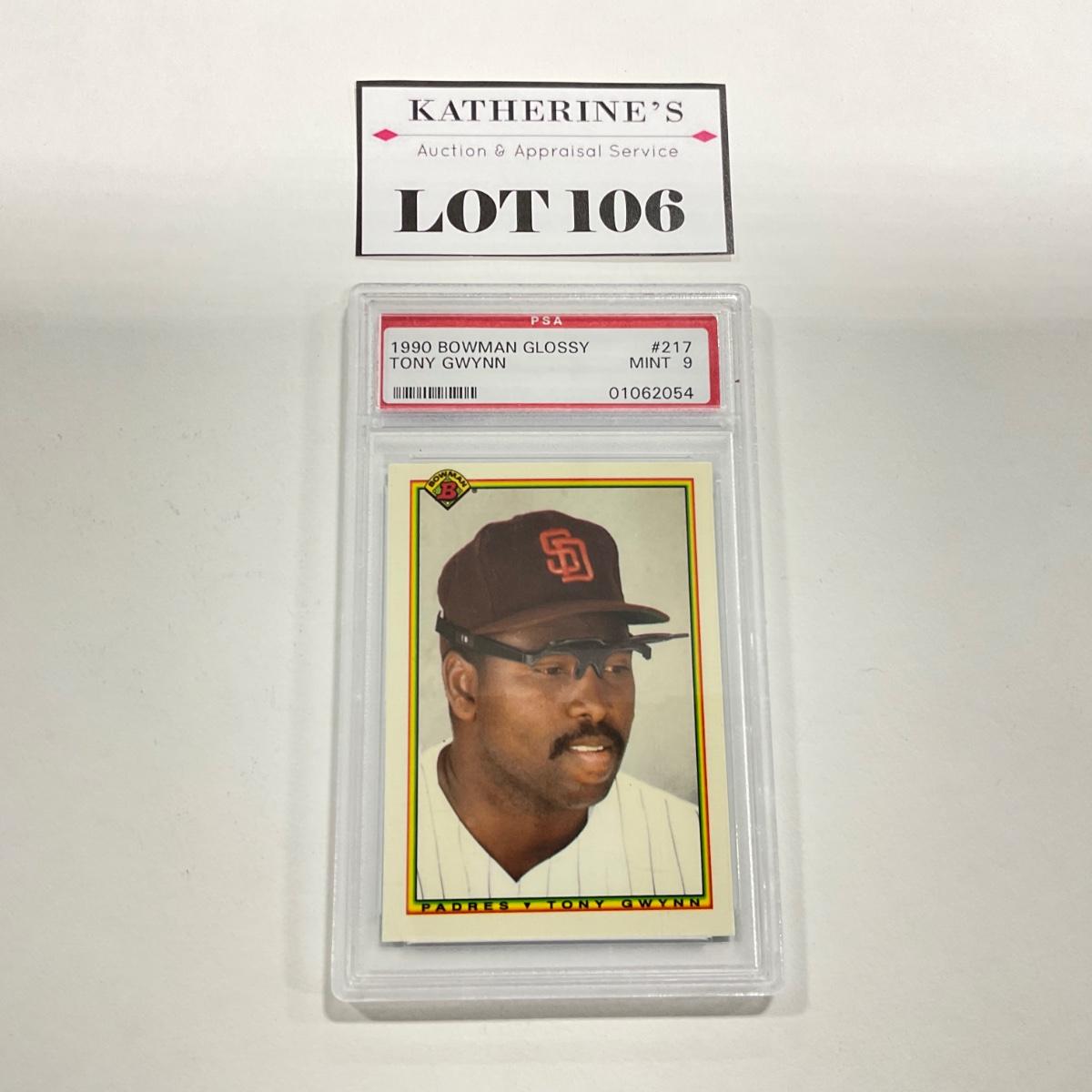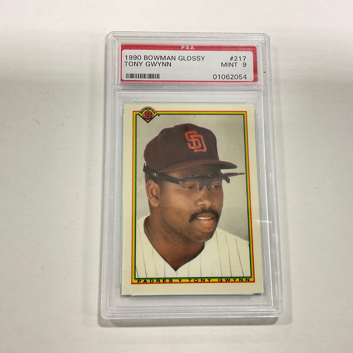 One graded 1990 Bowman Glossy Tony Gwynn #217 Mint 9 card. Please see photos for details and condition. ::: Shipping is available on this lot. If you require shipping you must let us know at the close of the auction. We will coordinate with you after the item has been won. Shipping fees will include insurance up to or exceeding the value of all items being mailed. If you have any questions regarding this lot please contact the auctioneer either via this website, by direct email or by phone. PICK UP TIMES and other important information can be found in the TERMS and DESCRIPTION of the auction. Please take a look for pertinent information. Thanks!