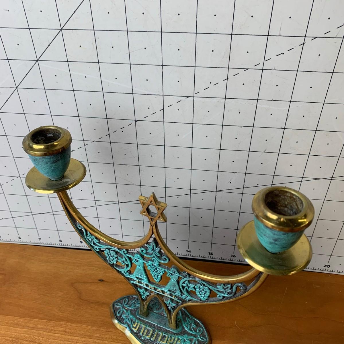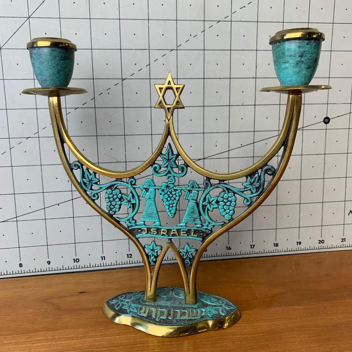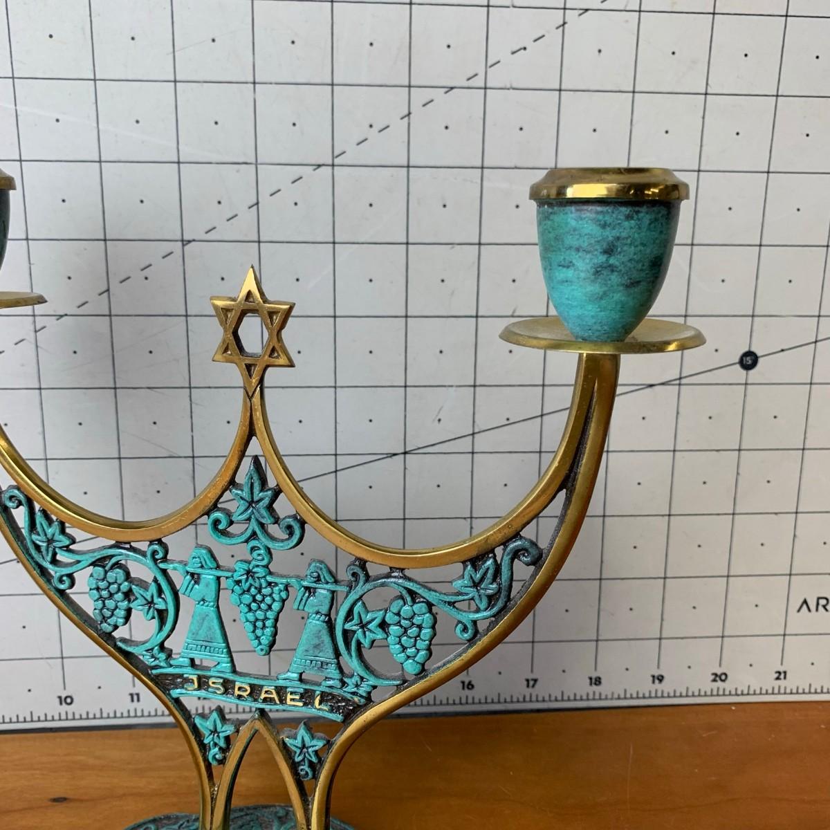 #106 Vintage MCM Israel Shabbat Candelabra Brass With Accented Patina Green Enamel