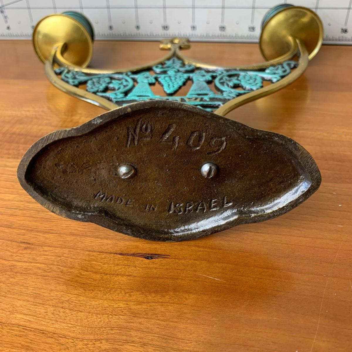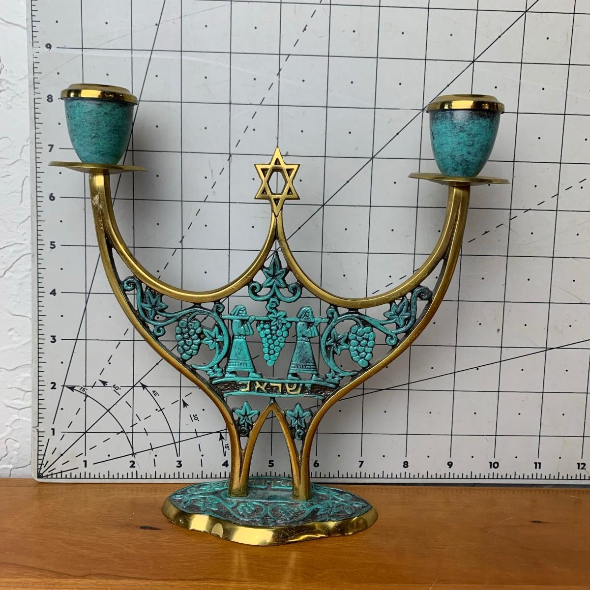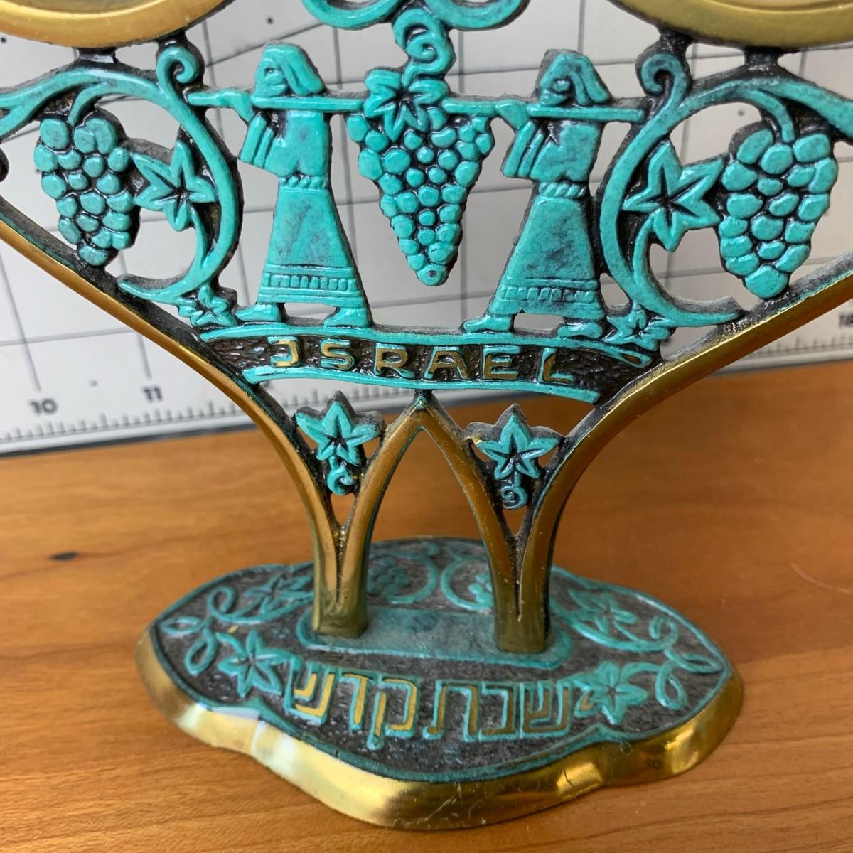 #106 Vintage MCM Israel Shabbat Candelabra Brass With Accented Patina Green Enamel