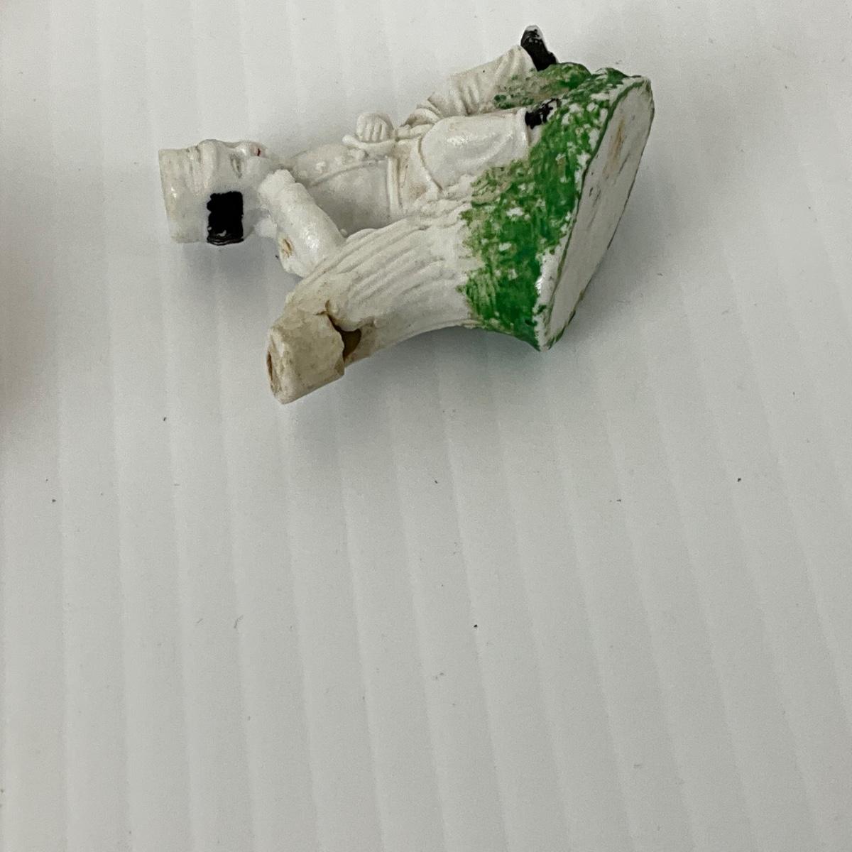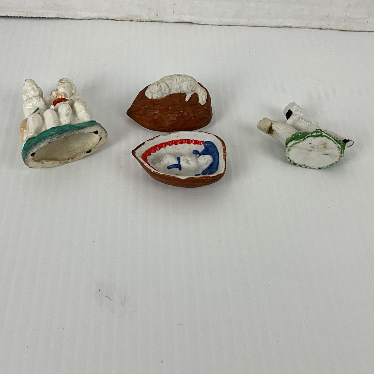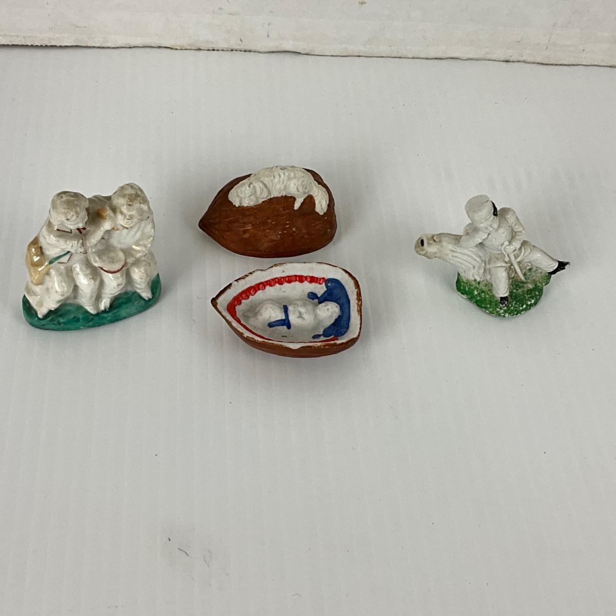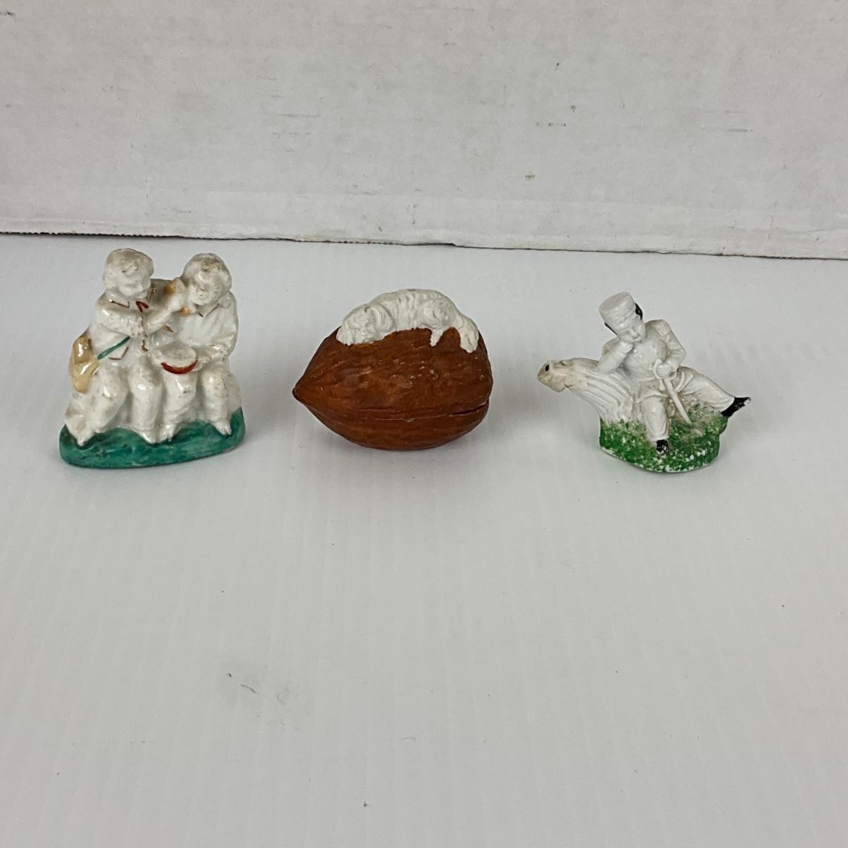 Small white figural whistle , and one walnut shell with baby inside , and small girl staffordshire statue measuring 2" high