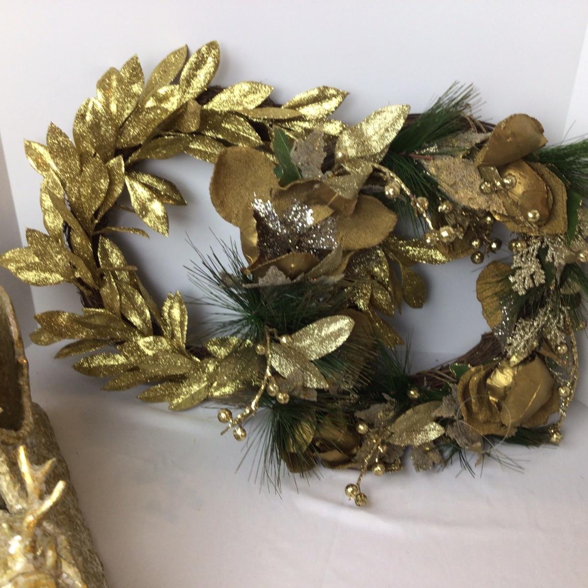 Lot contains gold sparkle sled and 2 gold tone wreaths.
