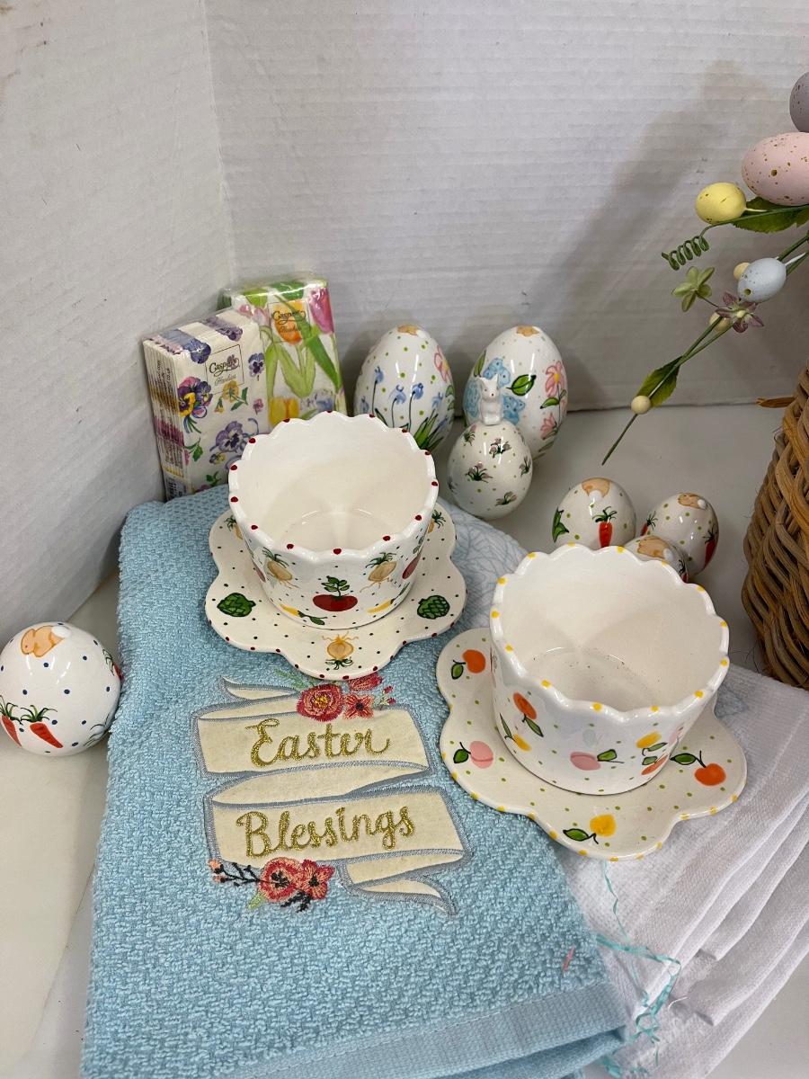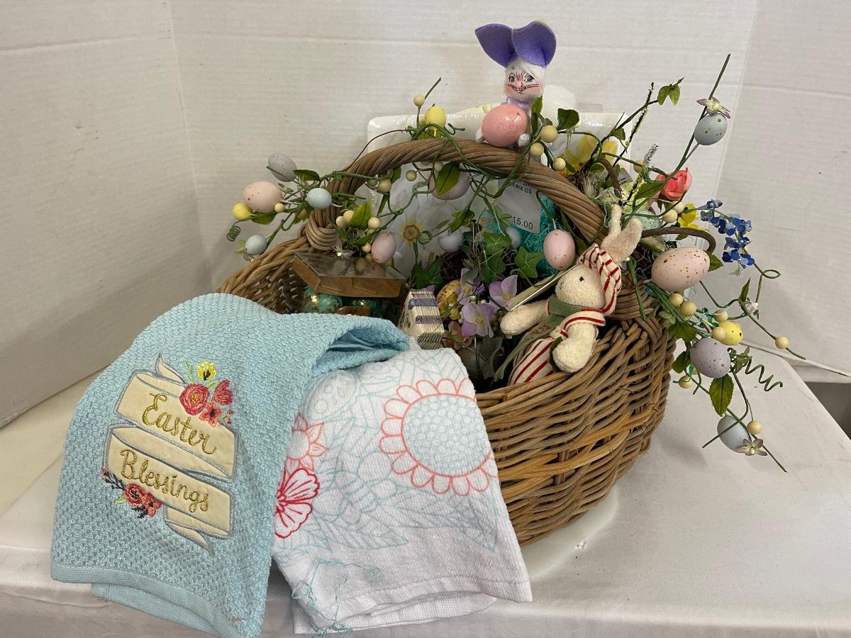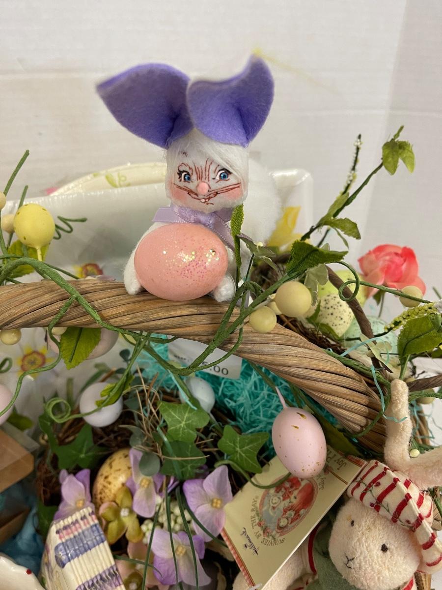 Large Easter basket filled with hand decorated pottery eggs and Annalee bunny.