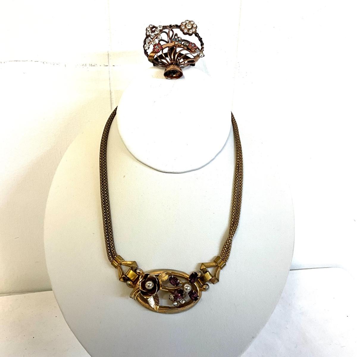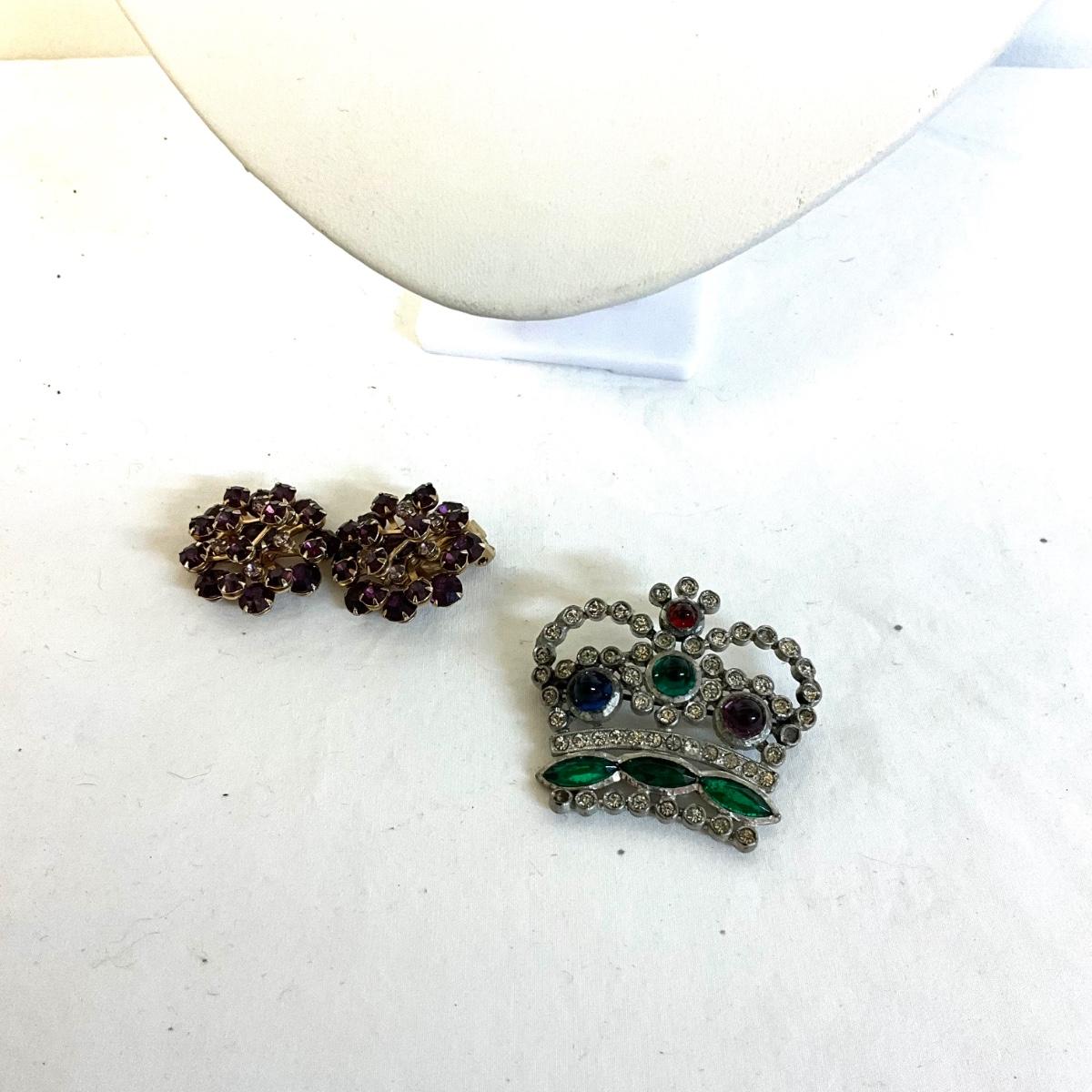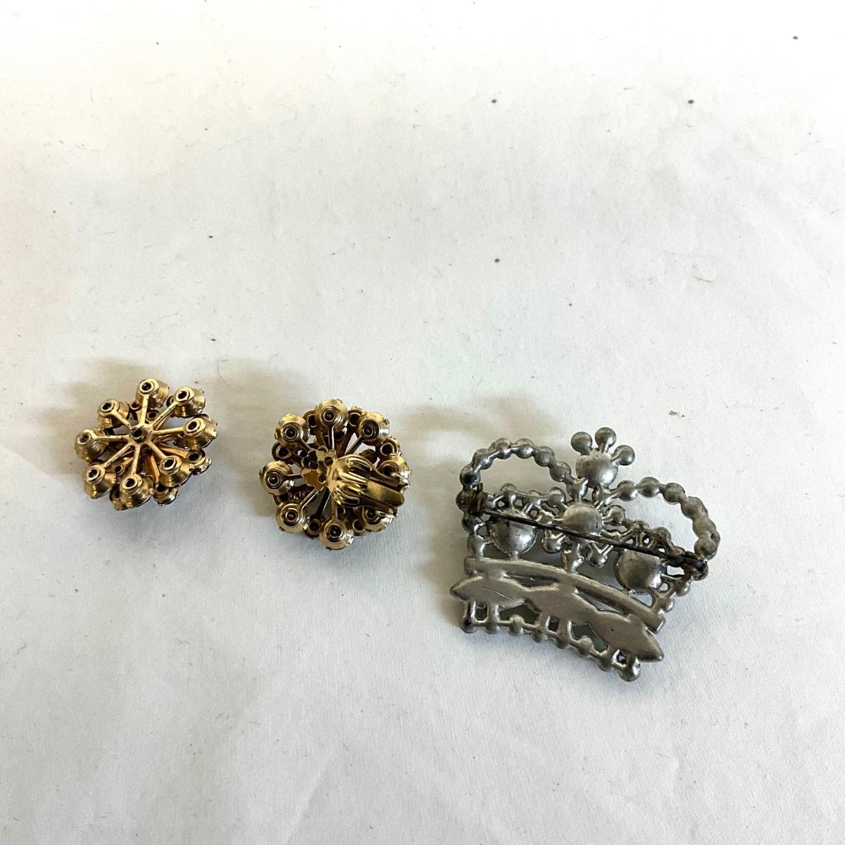 Necklace is 17" in length marked coro on clasp , Earrings are 1" in diameter and one is missing clip back, Crown brooch is 2" wide x 2" high , floral basket brooch is a rose gold tone with rhinestones and is slightly tarnished. 1.75" wide x 1.75" high