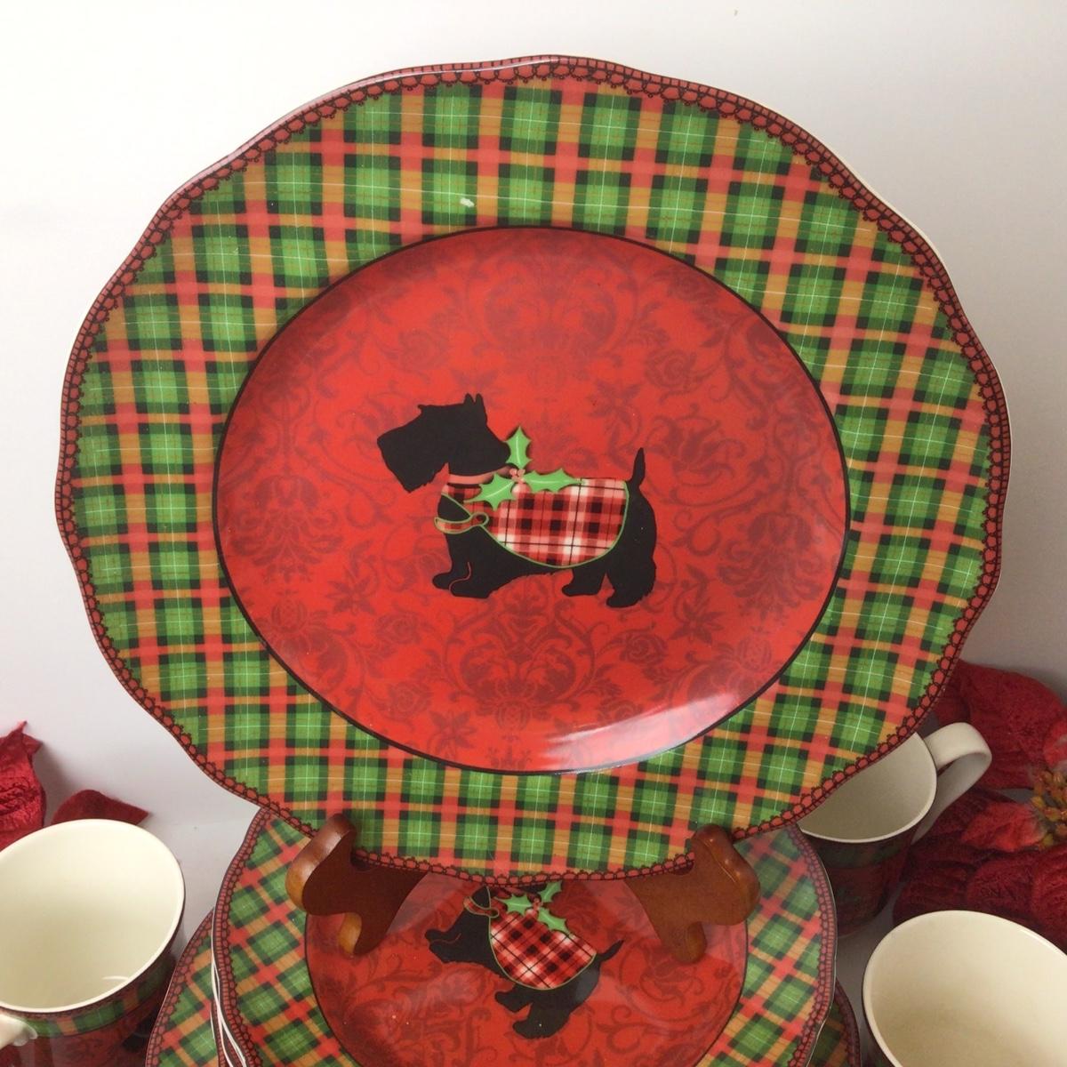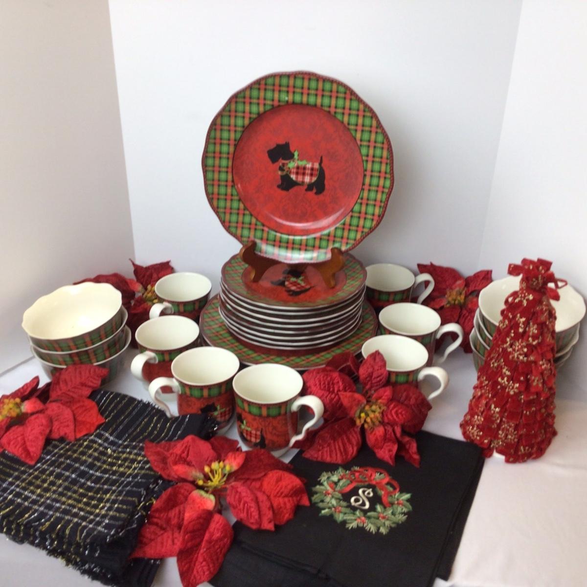 7x bowls, 7x mugs, 7x dinner plates, 8x salad plates and assorted linens.