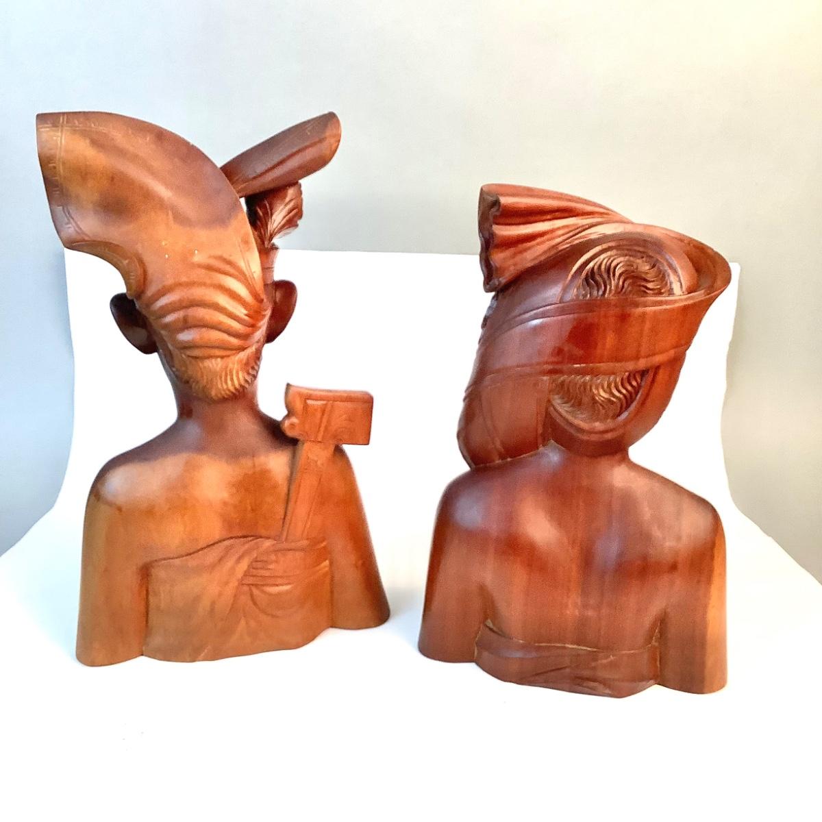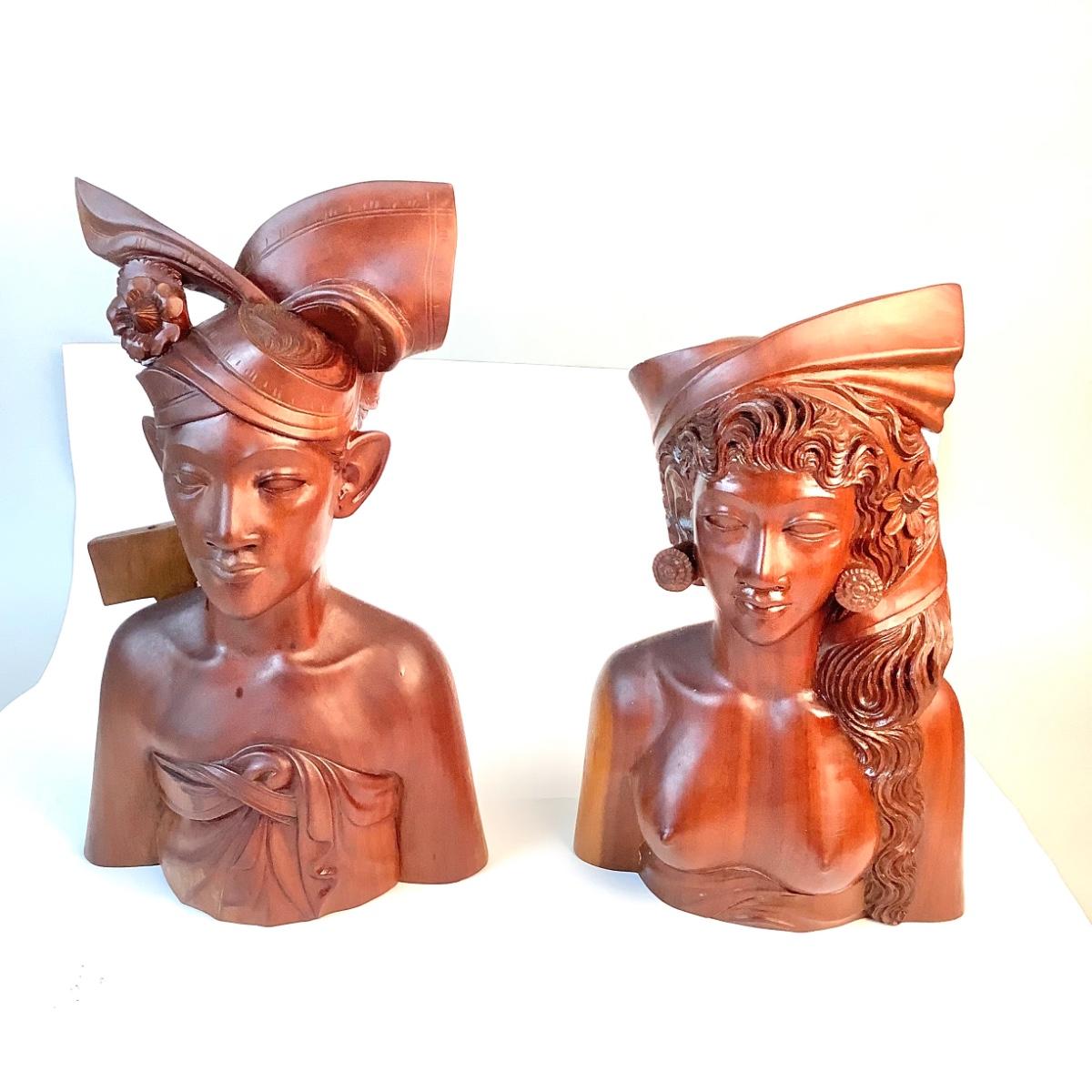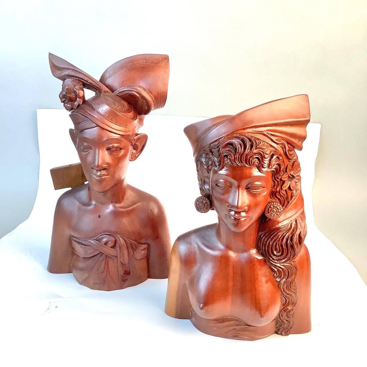 1066 Pair of Vintage Indonesian Carved Wood Busts of Man and Woman